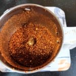 Dry roast the whole coriander seeds, fennel seeds,dry red chillies, and cool them. Blend them to a coarse powder(see picture for texture). Now separately dry roast the Til/Sesame seeds until they puff and splutter, cool them, add them to the coarse powder and give a single spin in the blender. The Til should get crushed, and yet coarse bits should be visible.