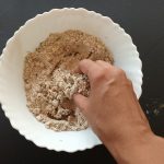 - Now add the oil and rub it into the flour well. When you take some flour and clamp it in your hand, it should hold shape(refer picture). Now adding water a little at a time,start needing. Make a stiff pliable dough. Apply a little oil over the dough, cover and rest for 10 minutes.