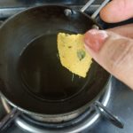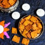 The crackers can be deep fried also. To deep fry take oil in a Kadai/wok and heat. The oil should not be very hot. Test the oil by dropping in a small piece of the dough.If it sizzles and rises up immediately, that’s the right temperature. Drop the squares a few at a time,and fry until light brown.