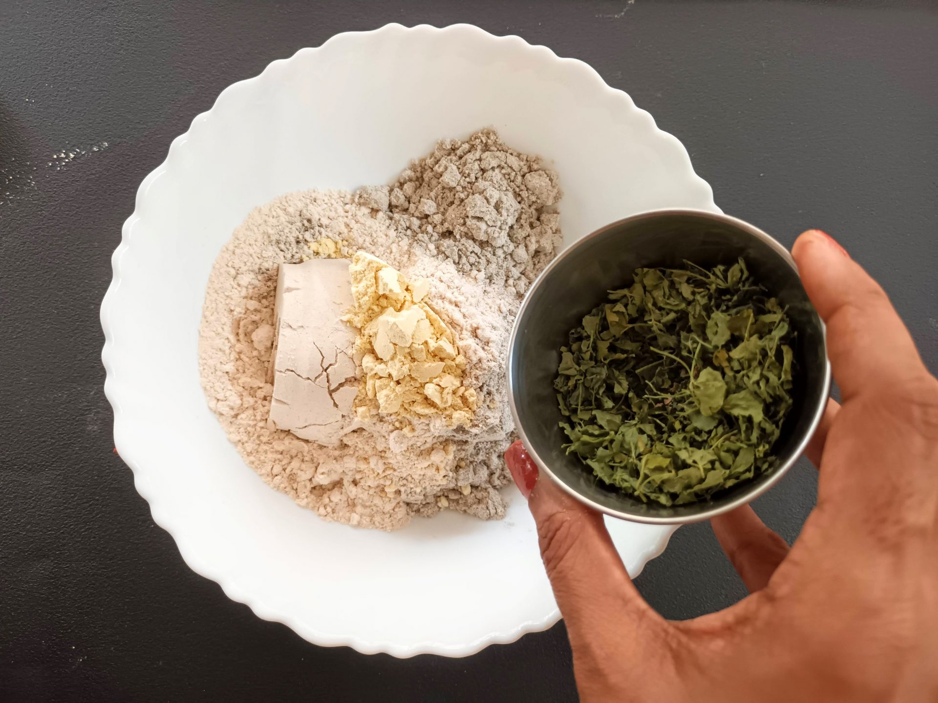 - In a mixing bowl take the Bajra/Pearl Millet flour. To this add the whole wheat flour and the chickpea flour.