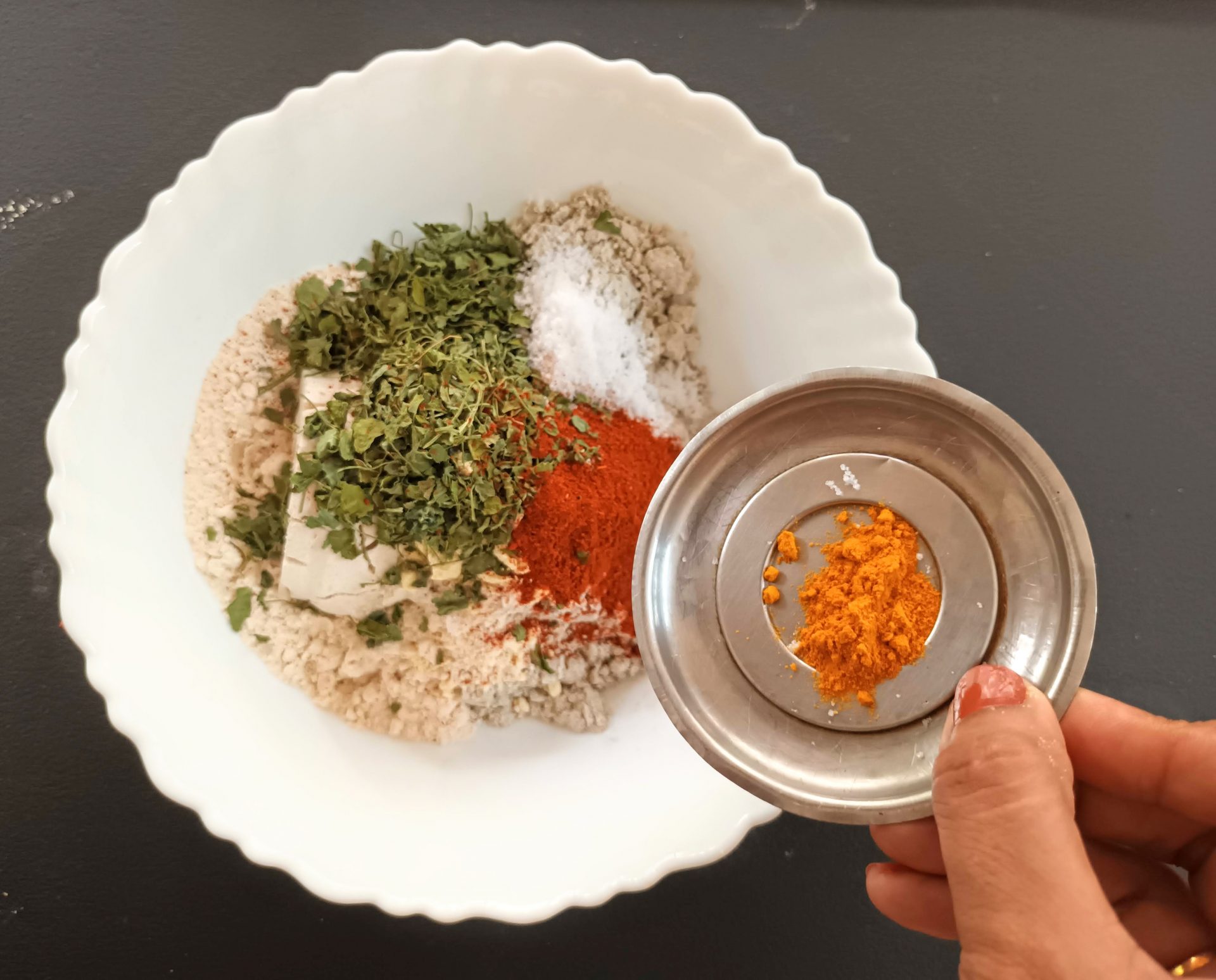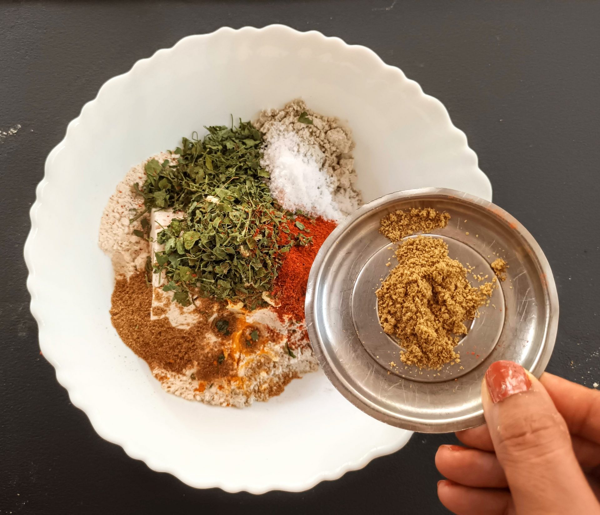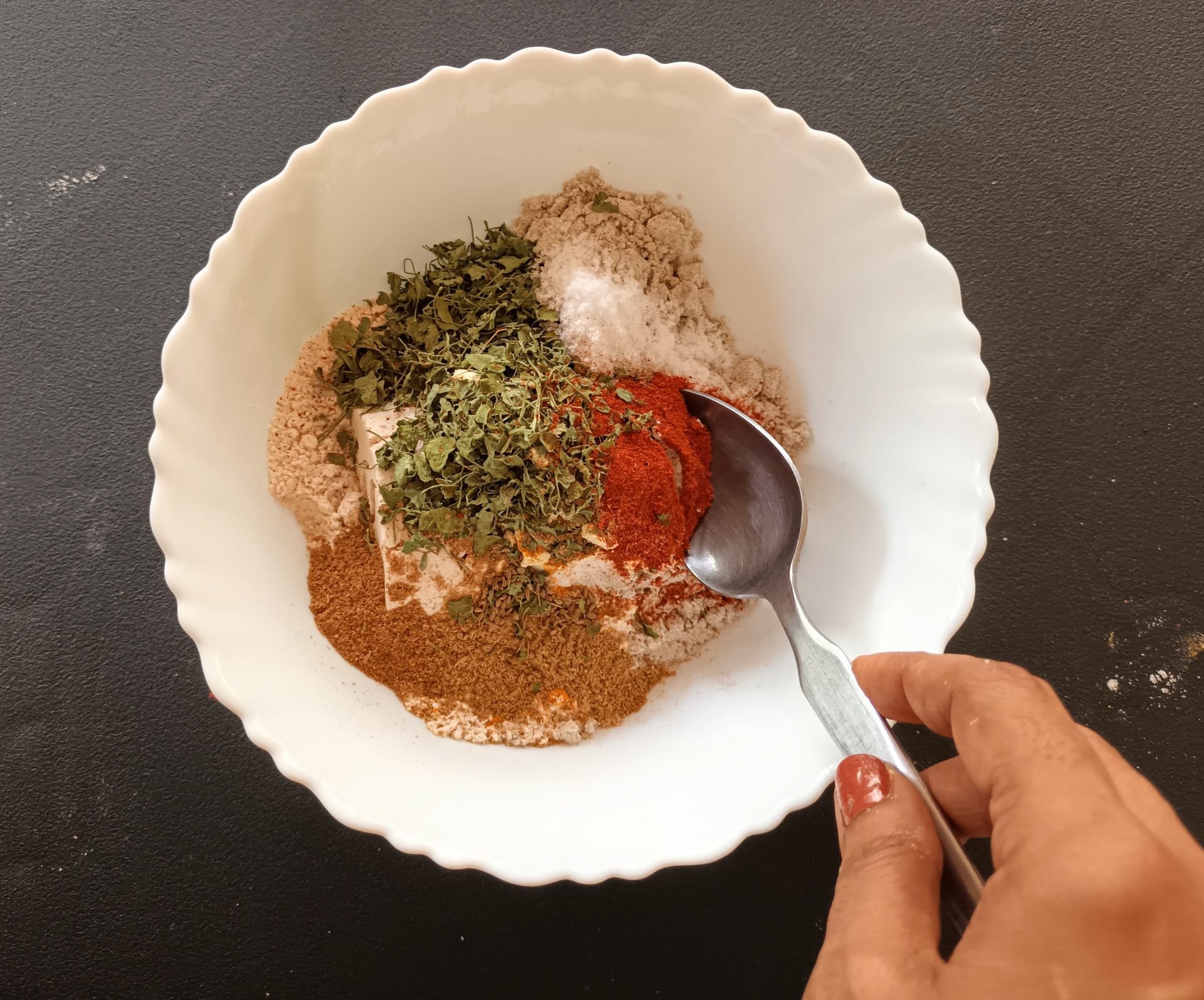 - Now add Dry Fenugreek leaves/Kasoori Methi , salt, turmeric powder, red chilli powder, coriander powder, fennel powder, and Carrom seeds. Mix everything well using a spoon or your fingers.