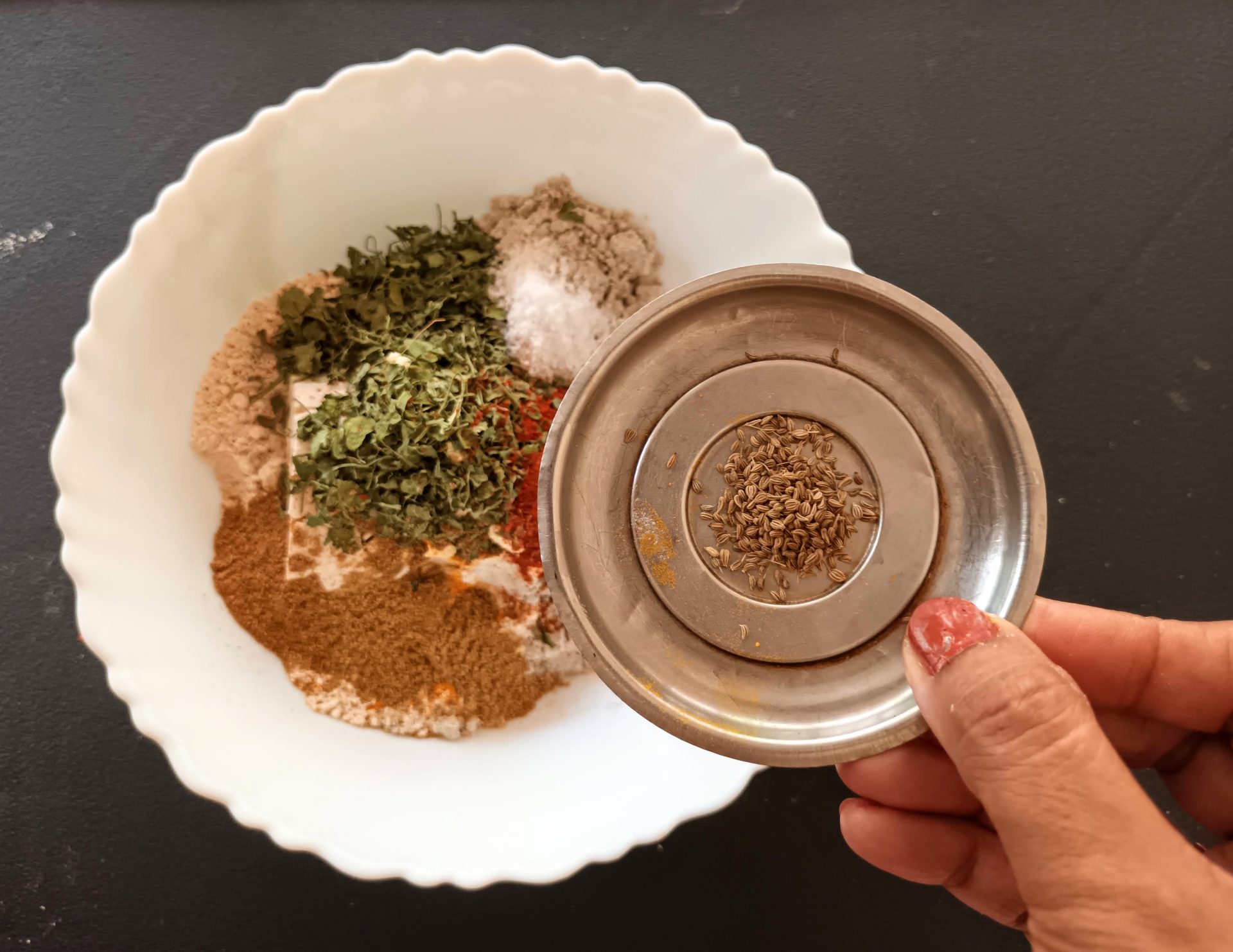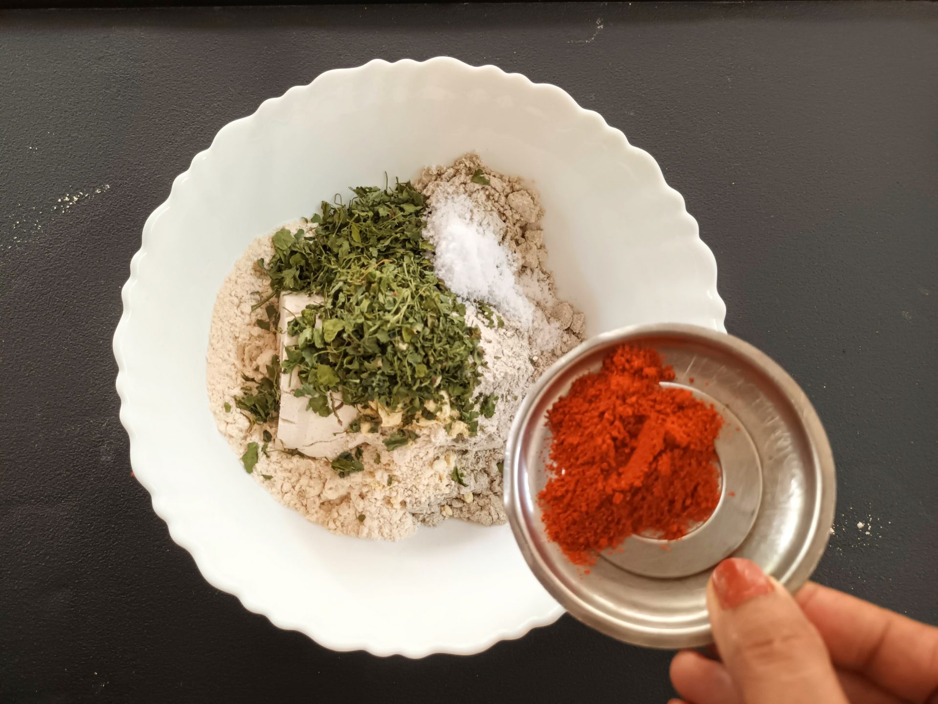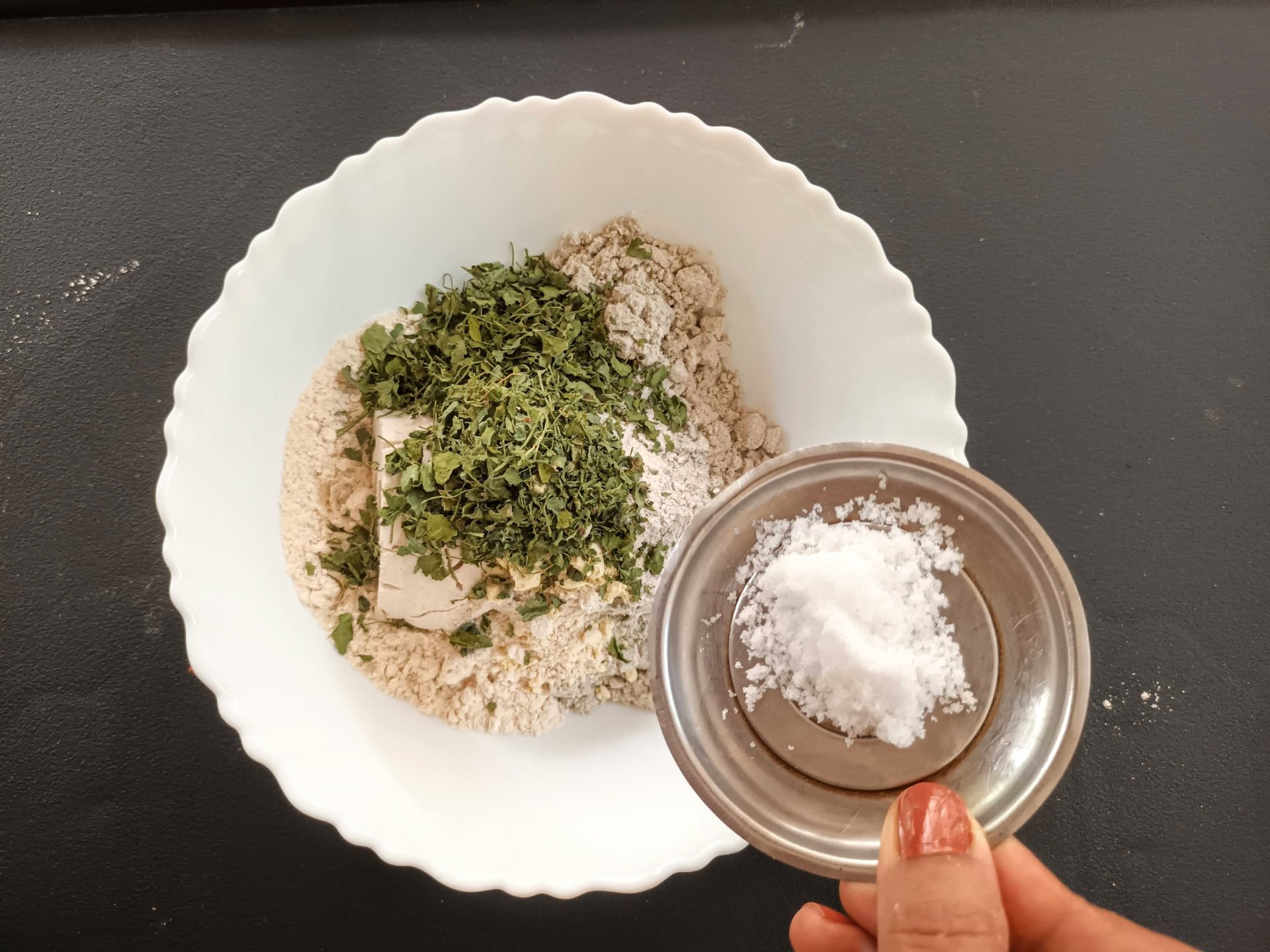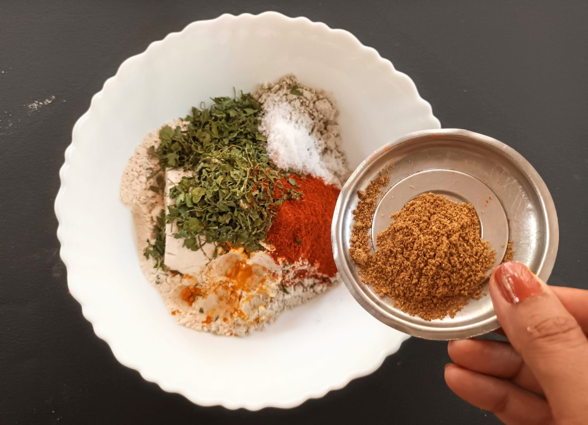 - Now add Dry Fenugreek leaves/Kasoori Methi , salt, turmeric powder, red chilli powder, coriander powder, fennel powder, and Carrom seeds. Mix everything well using a spoon or your fingers.