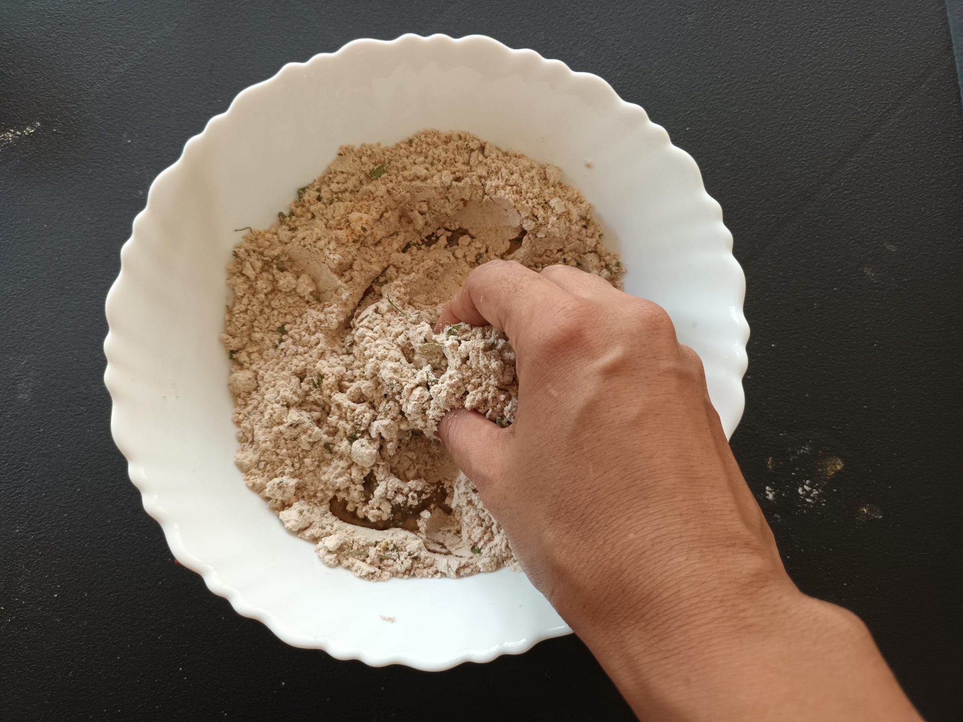 - Now add the oil and rub it into the flour well. When you take some flour and clamp it in your hand, it should hold shape(refer picture). Now adding water a little at a time,start needing. Make a stiff pliable dough. Apply a little oil over the dough, cover and rest for 10 minutes.