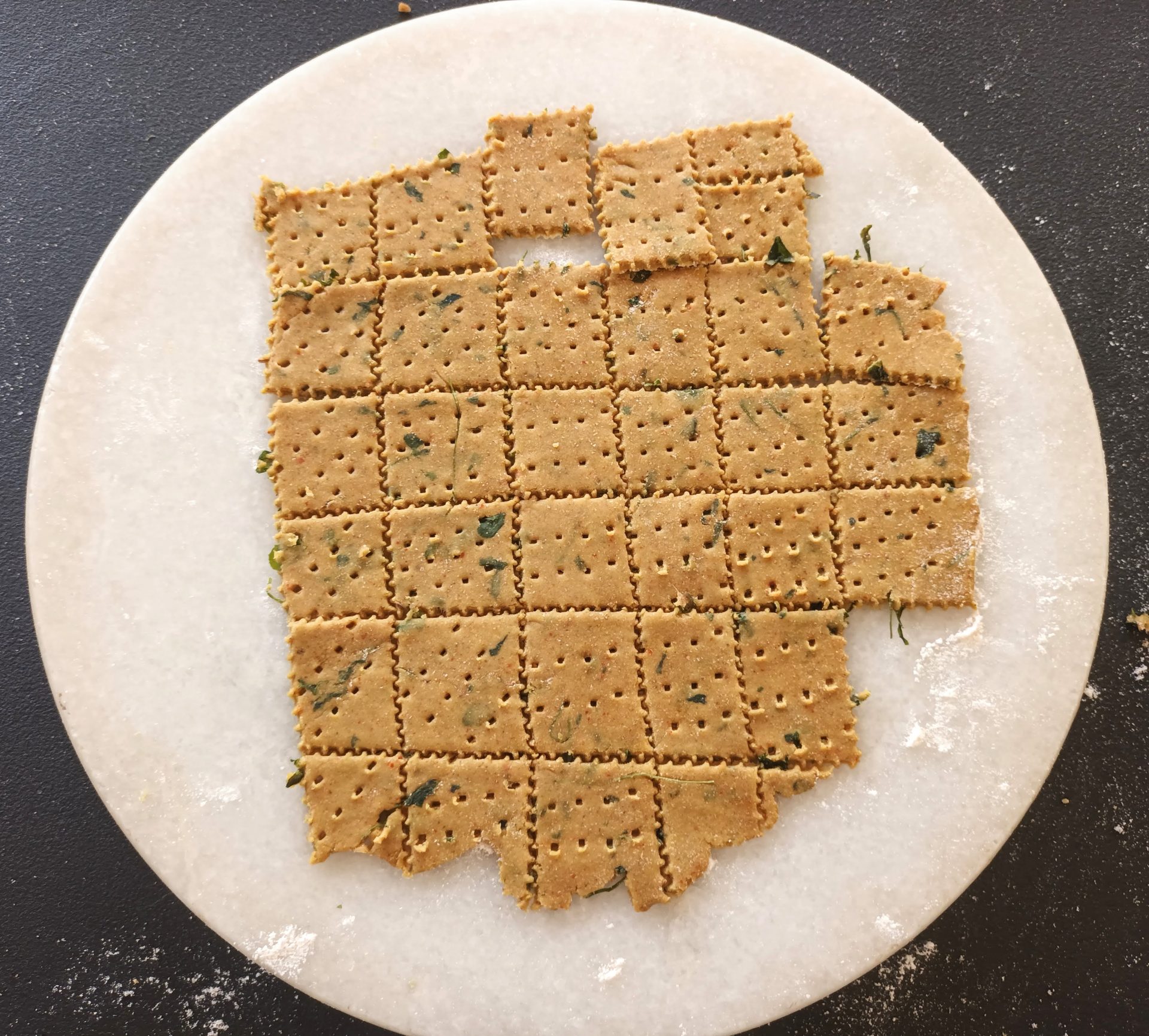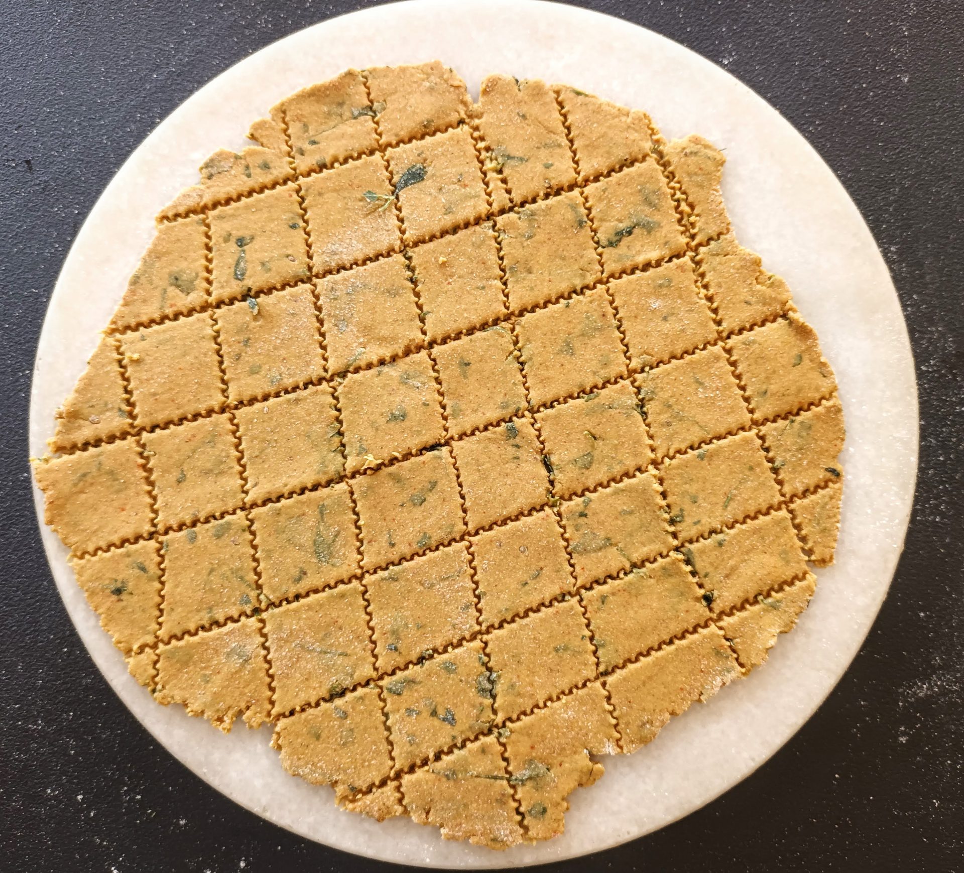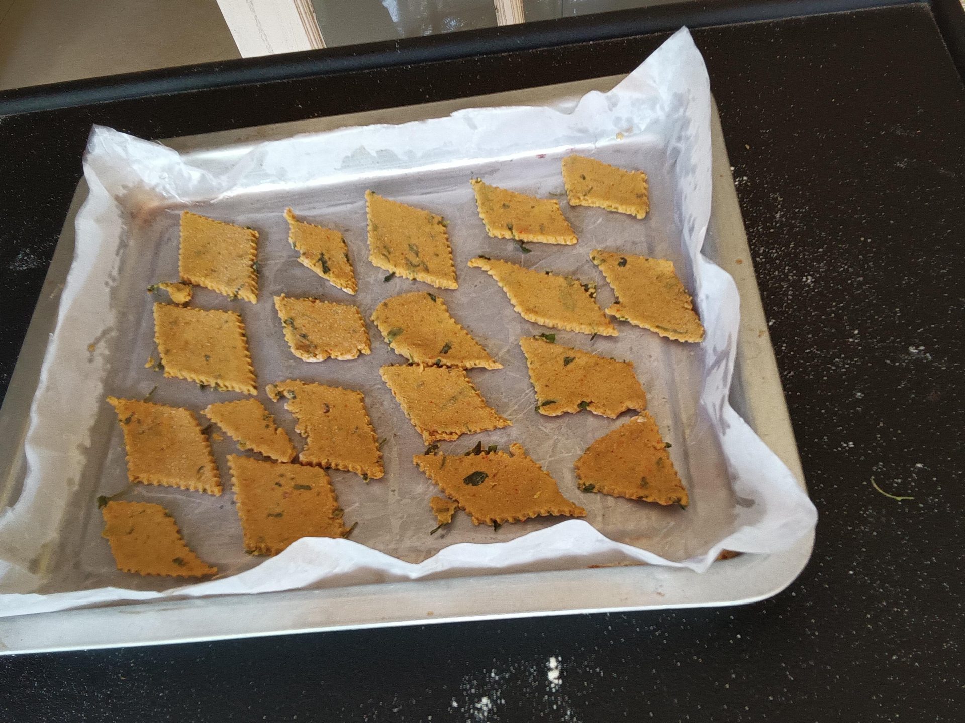 - Pre heat the oven to 200 C for 10 minutes. Divide the dough into 3 equal portions. take one portion at a time, dust with flour,and roll it into a big circle. The circle should be neither too thick, nor too thin.With a knife cut the dough into squares or diamonds. With a fork prick holes on the squares Line a baking tray with parchment paper, grease it with oil or oil spray, and place the cut sqaures/diamonds on the baking sheet. Bake at 200 C for 8 to 10 minutes, or when the crackers are light brown. Keep an eye as different ovens work differently. Store them in an air tight container.