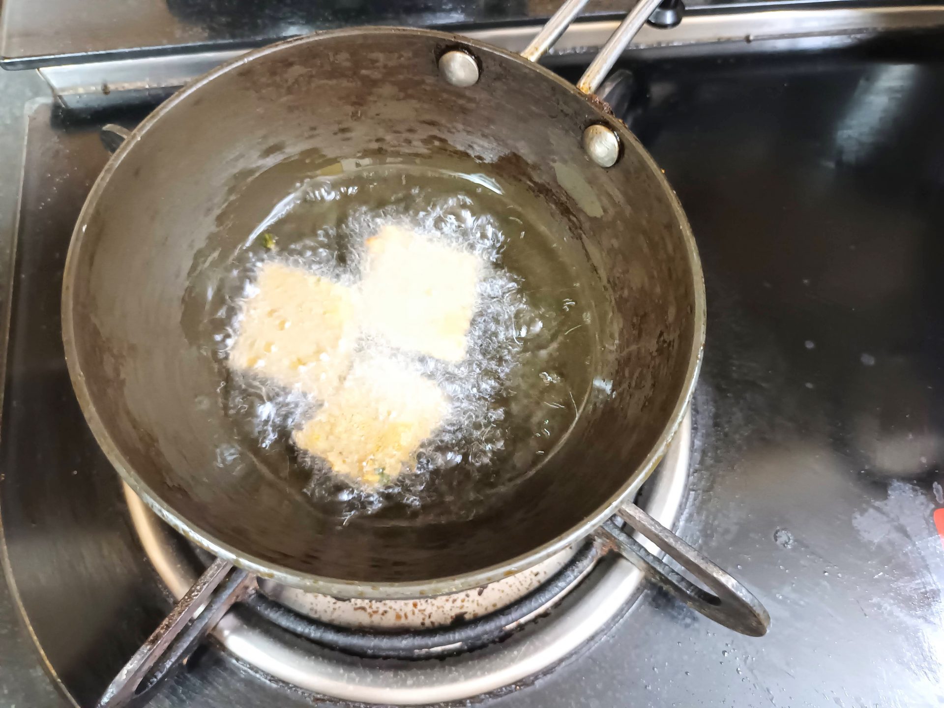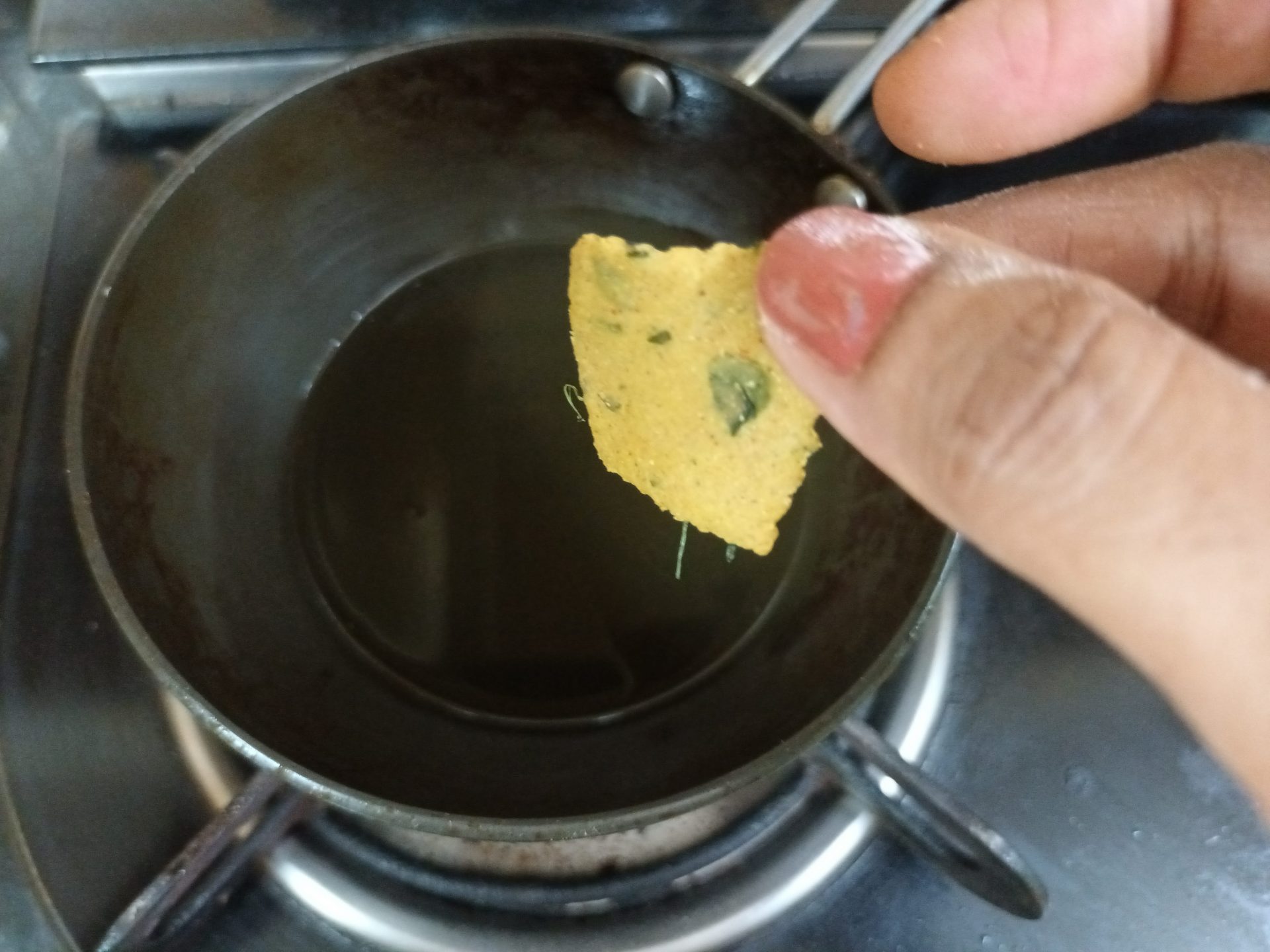 - The crackers can be deep fried also. To deep fry take oil in a Kadai/wok and heat. The oil should not be very hot. Test the oil by dropping in a small piece of the dough.If it sizzles and rises up immediately, that’s the right temperature. Drop the squares a few at a time,and fry until light brown.