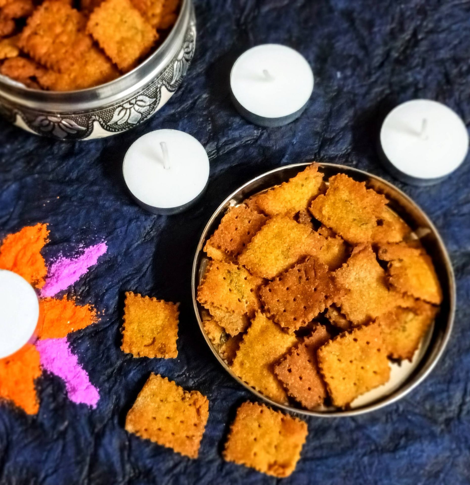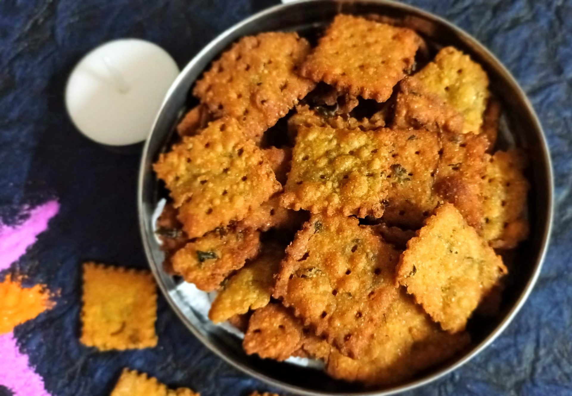 The crackers can be deep fried also. To deep fry take oil in a Kadai/wok and heat. The oil should not be very hot. Test the oil by dropping in a small piece of the dough.If it sizzles and rises up immediately, that’s the right temperature. Drop the squares a few at a time,and fry until light brown.