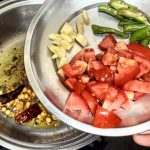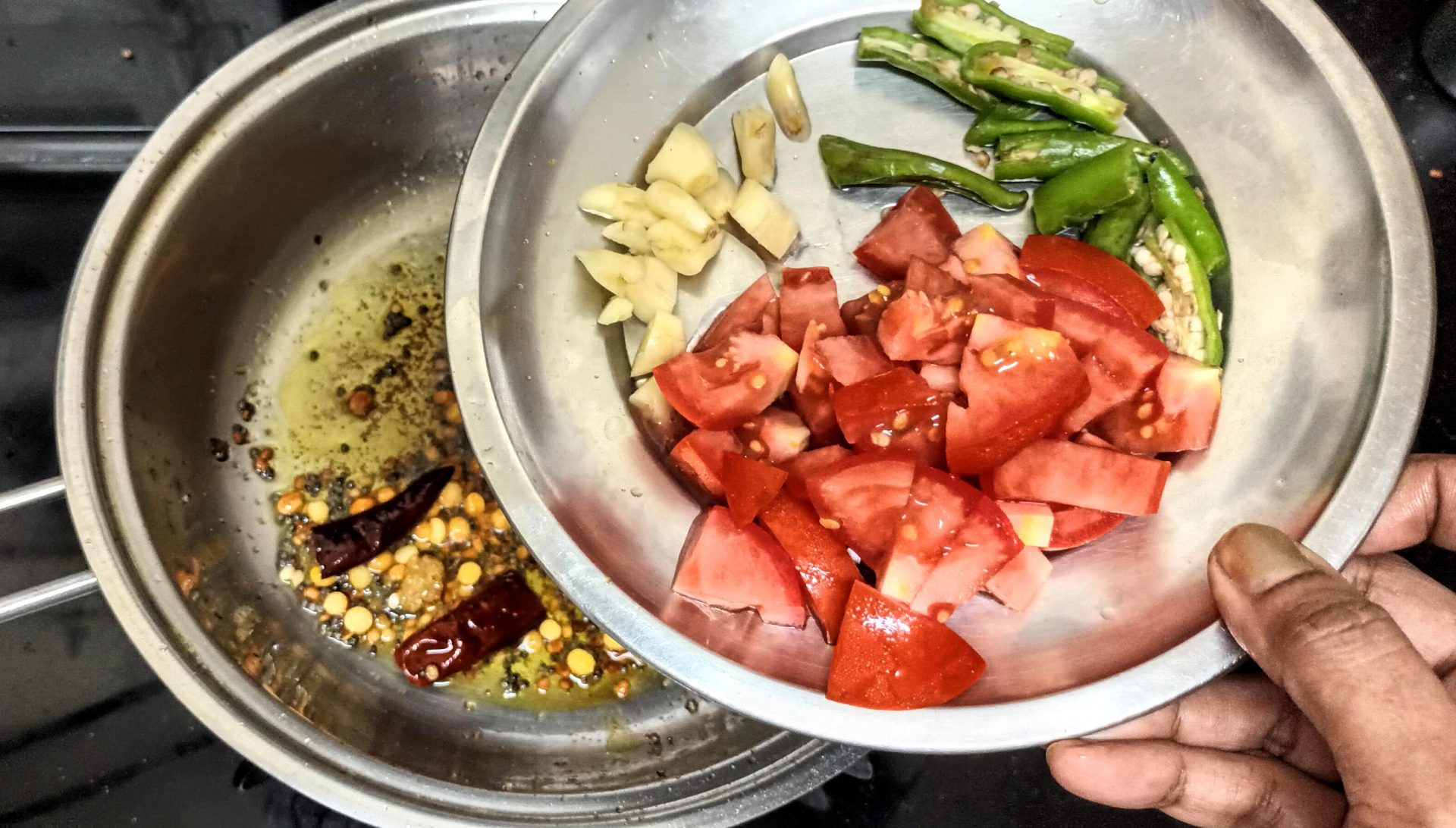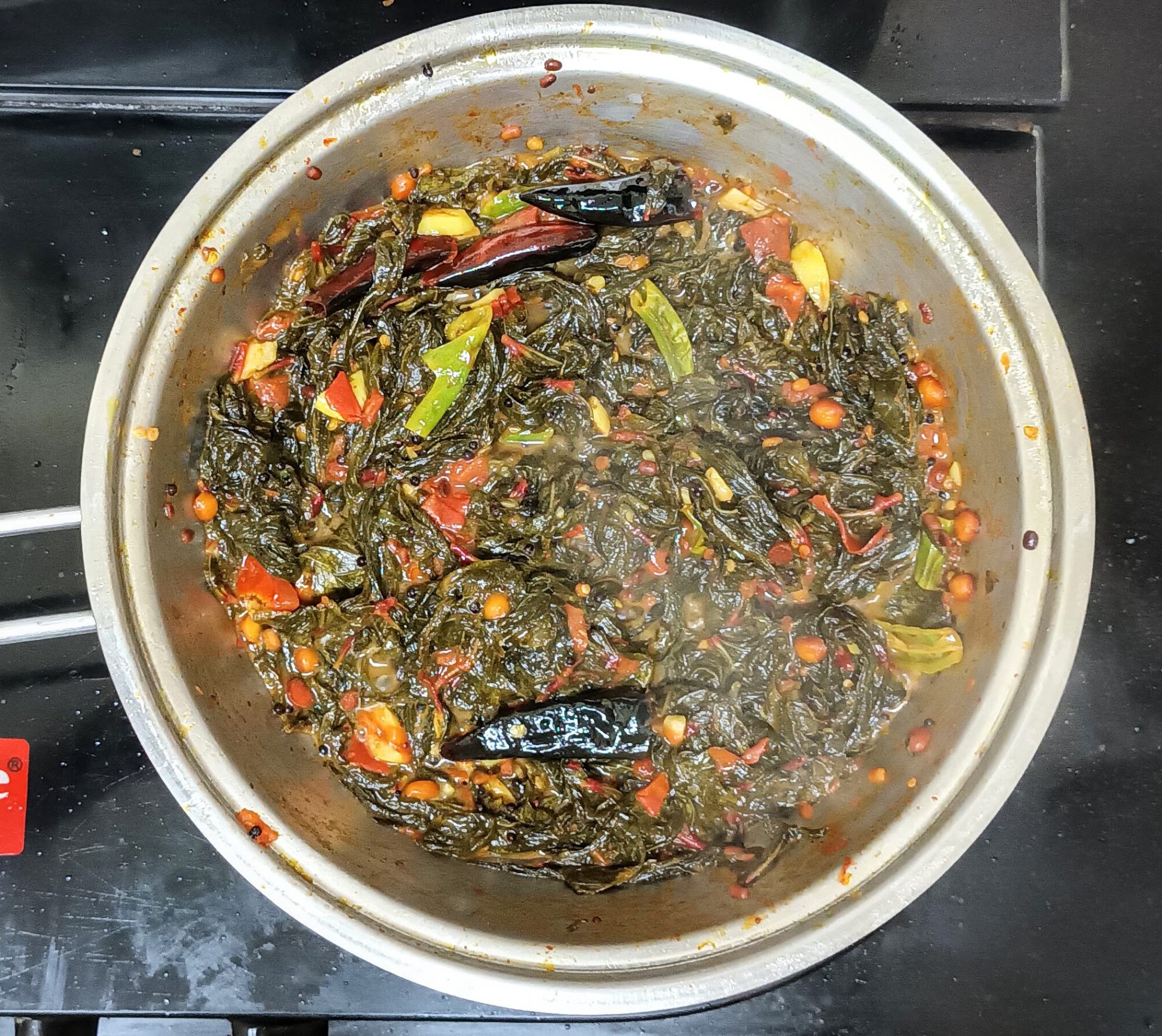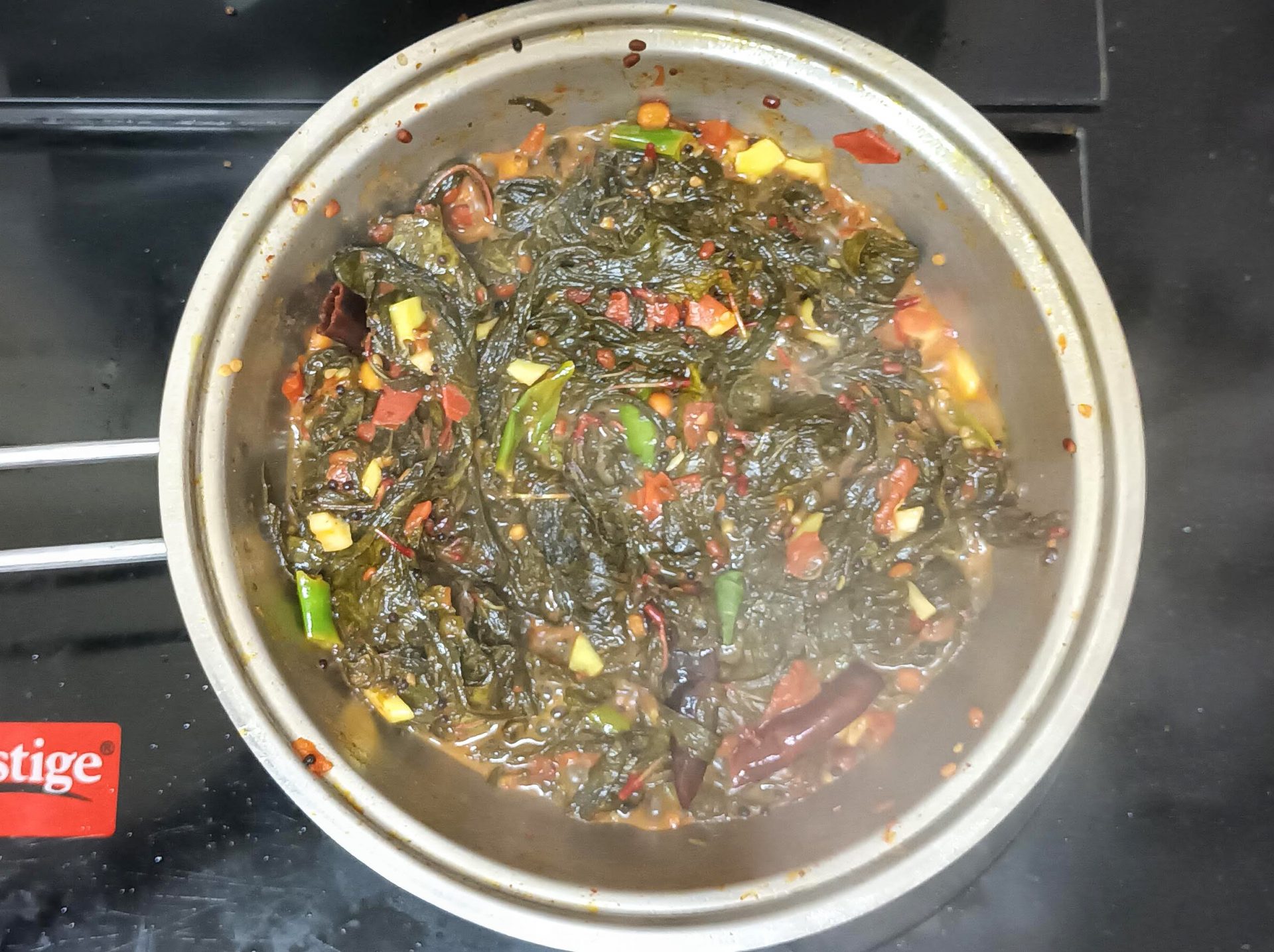 - Remove the leaves from stalk, wash and drain. Now in a Pan heat oil for tempering, and add all ingredients mentioned under “to temper”. When the mustard seeds crackle,add turmeric powder, and asafoetida, followed by tomatoes, garlic, and green chillies. Saute well in oil.