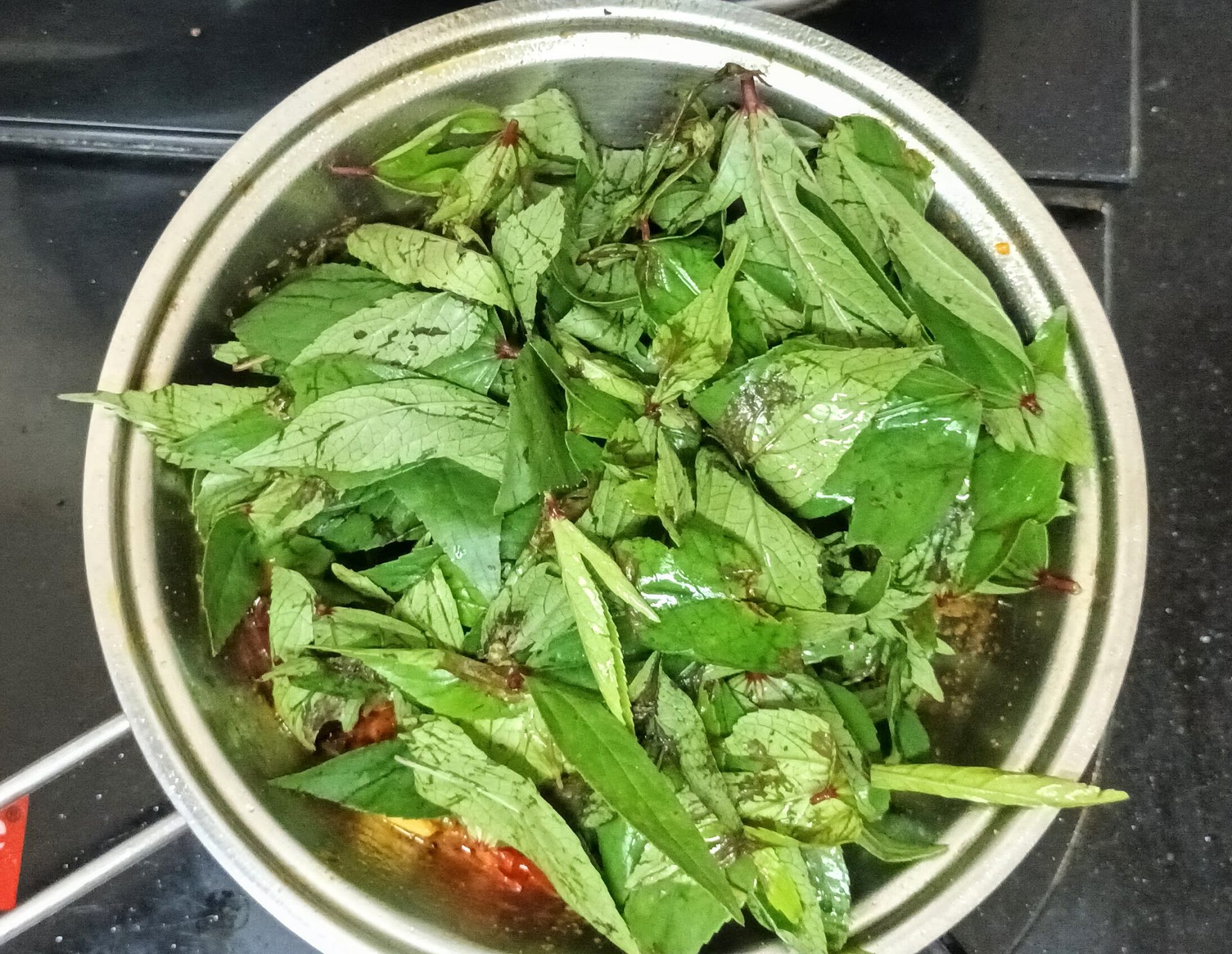 - Let the Tomatoes break and release moisture, keep mashing with the back of a ladle, so that you get a pulpy mixture,and now add the Gongura/Sorrel leaves. Keep sauteing, the leaves will wilt, releasing a lot of moisture. Continue to saute until most of the moisture dries up.