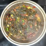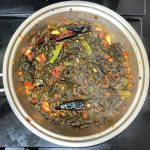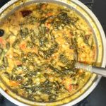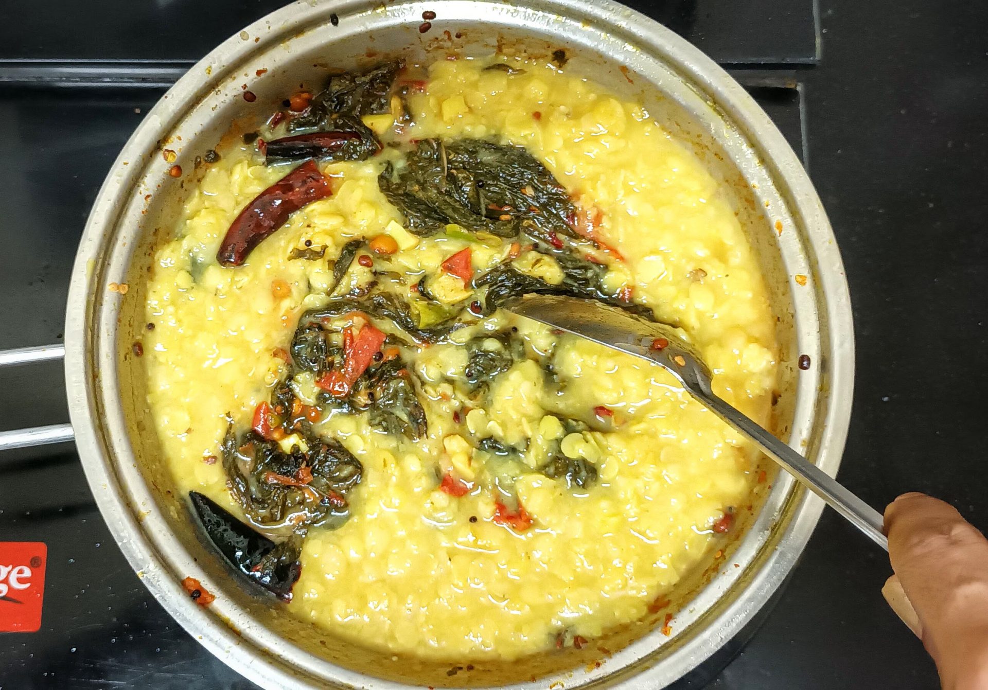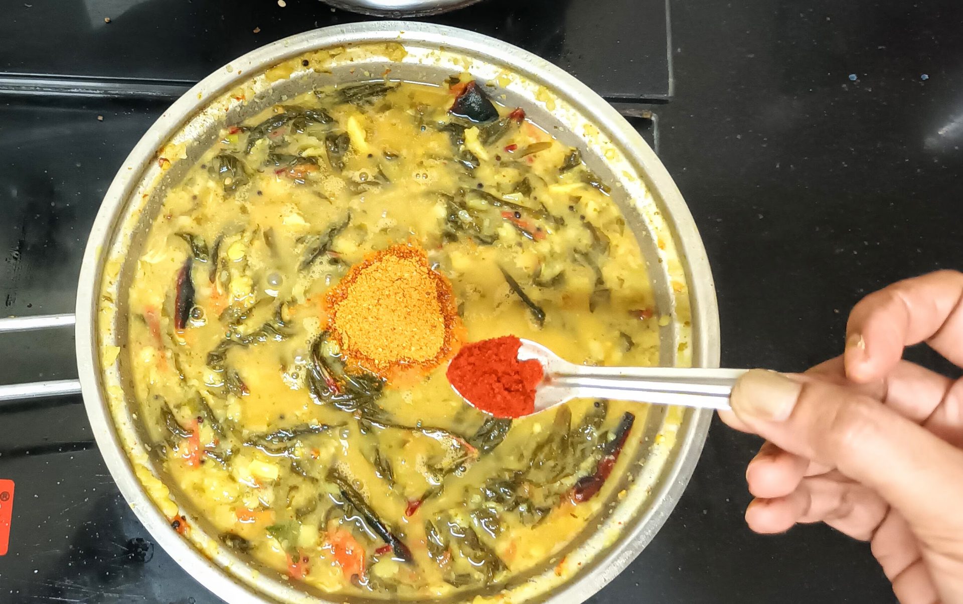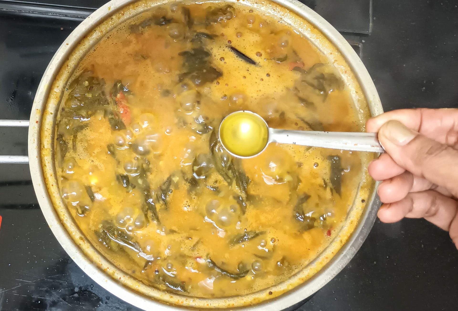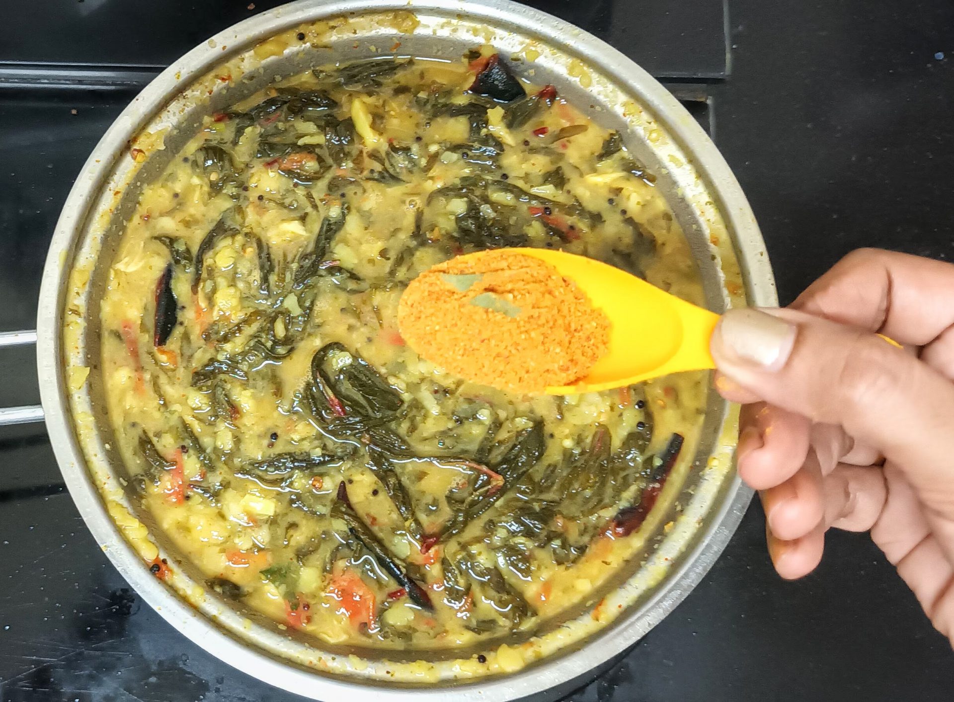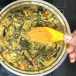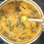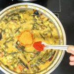 - Now add the cooked Dal to the leaves and stir well. Add a cup of water, followed by Sambar powder, and Kashmiri red chilli powder, and stir. Let the Dal simmer for 3 to 4 minutes. Add the sesame oil and turn of the flame. Serve with hot rice or Rotis.