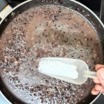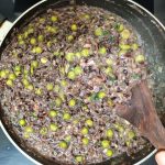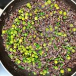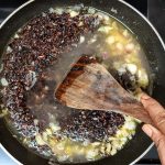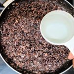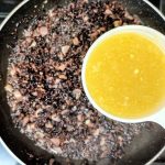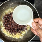 - Now add the Black rice, followed by a cup water or broth. Stir well and cook covered on medium high for until almost all water evaporates. Now add a cup of broth, stir and cook covered again on low flame for 5 minutes or until the rice is almost cooked. A little aldente is ok at this stage.