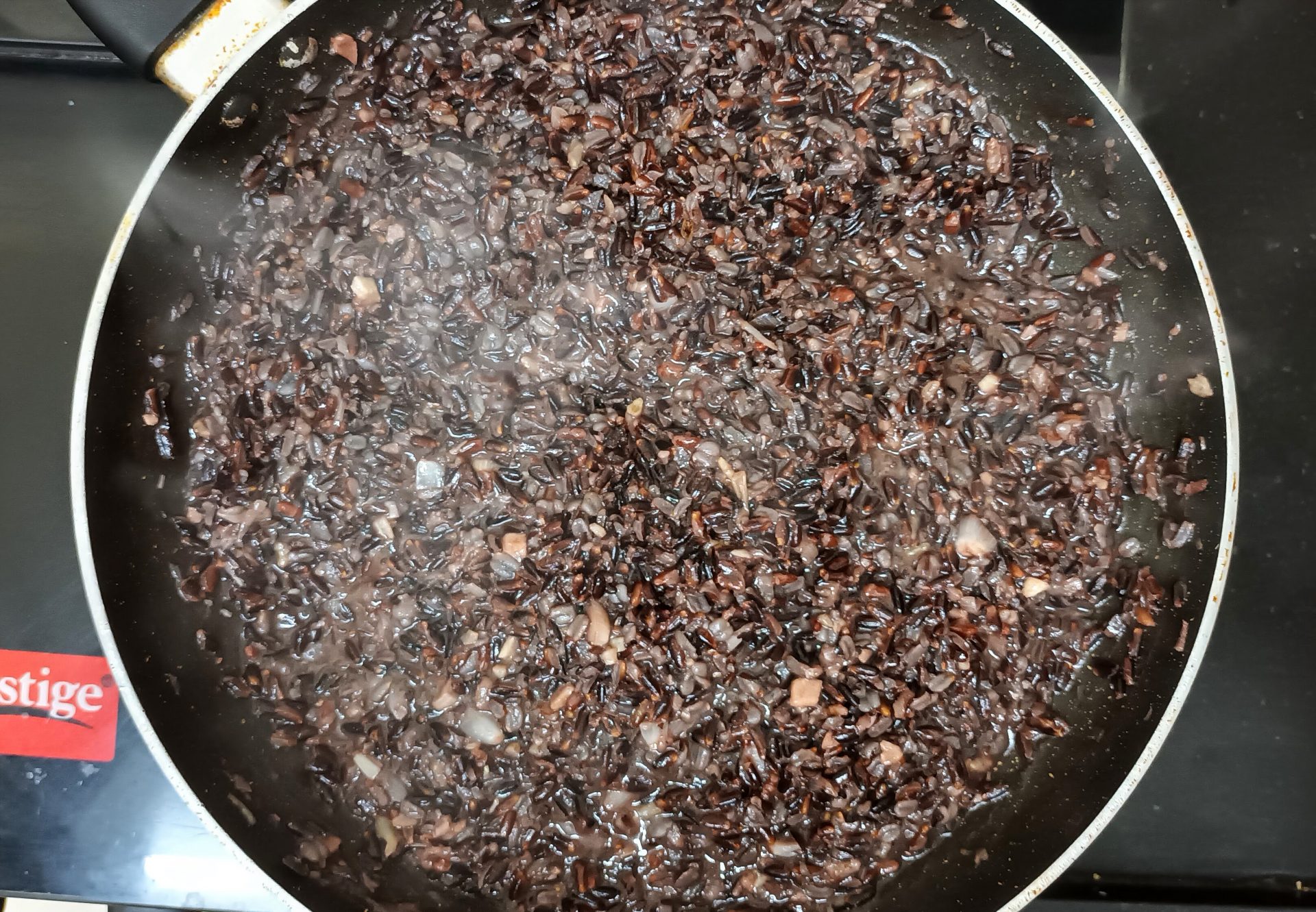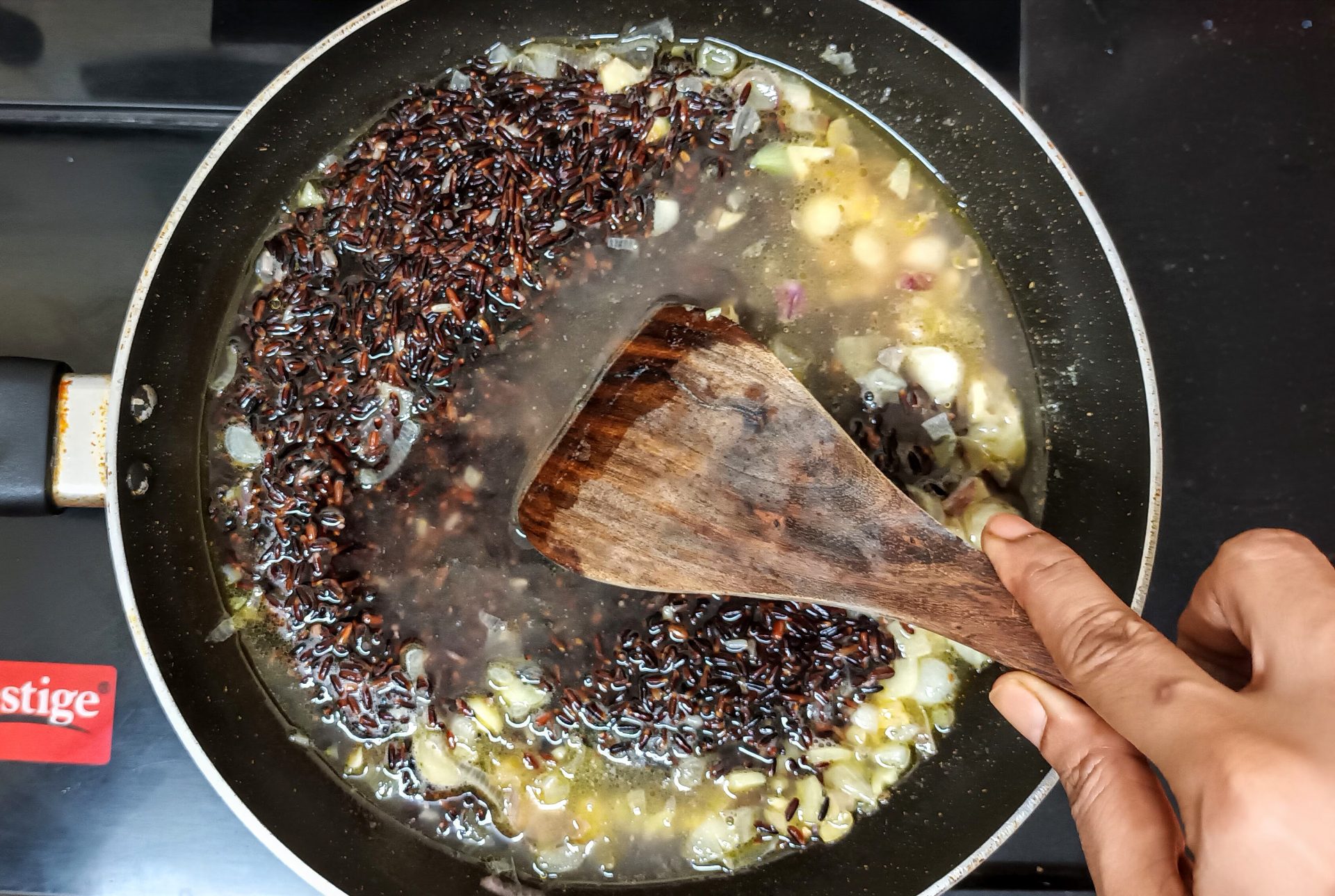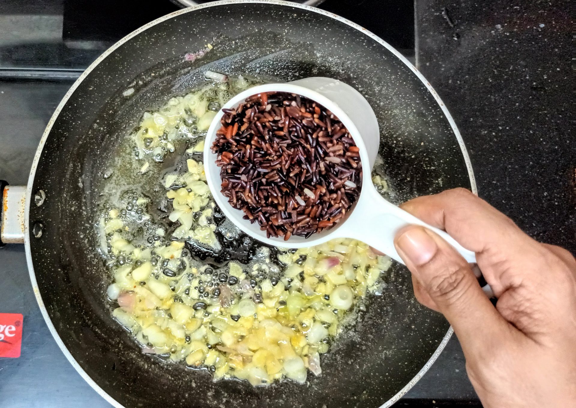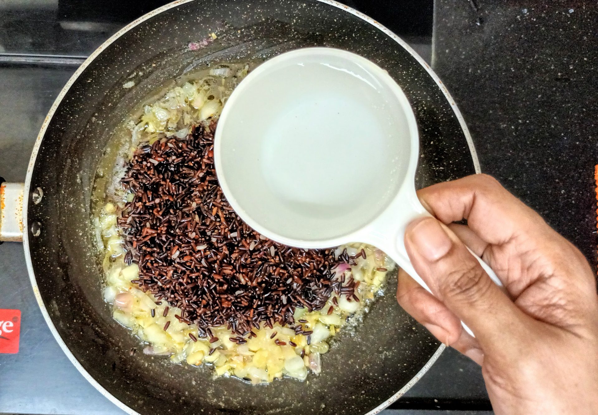 - Wash and soak the Black Rice for 4 to 5 hours. Later Rinse again, drain and keep aside. Now to a hot pan add the butter. When the butter melts, add the crushed garlic and saute for 30 seconds. Further add the onions, and saute until they turn transparent. Take care not to brown them.