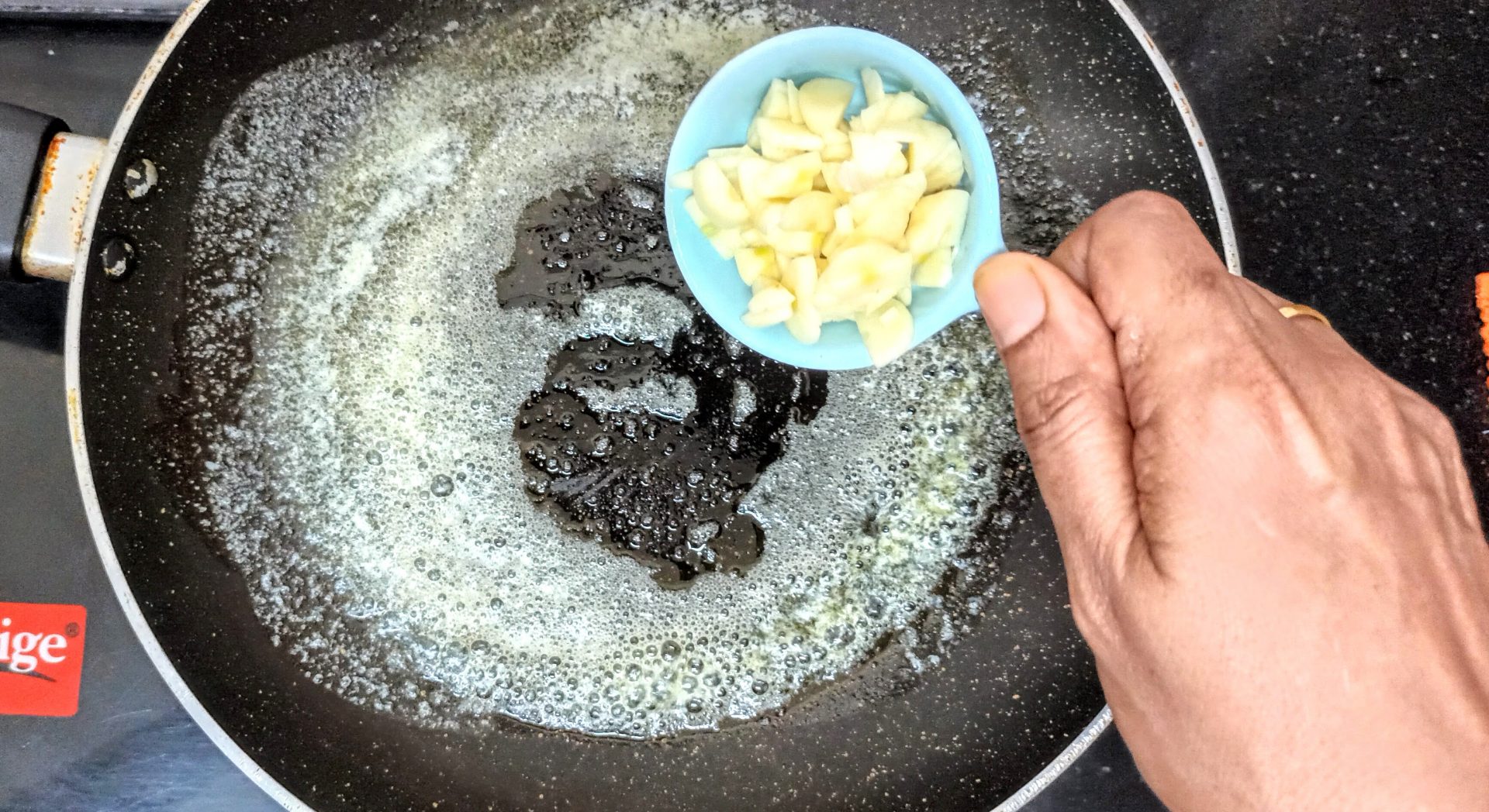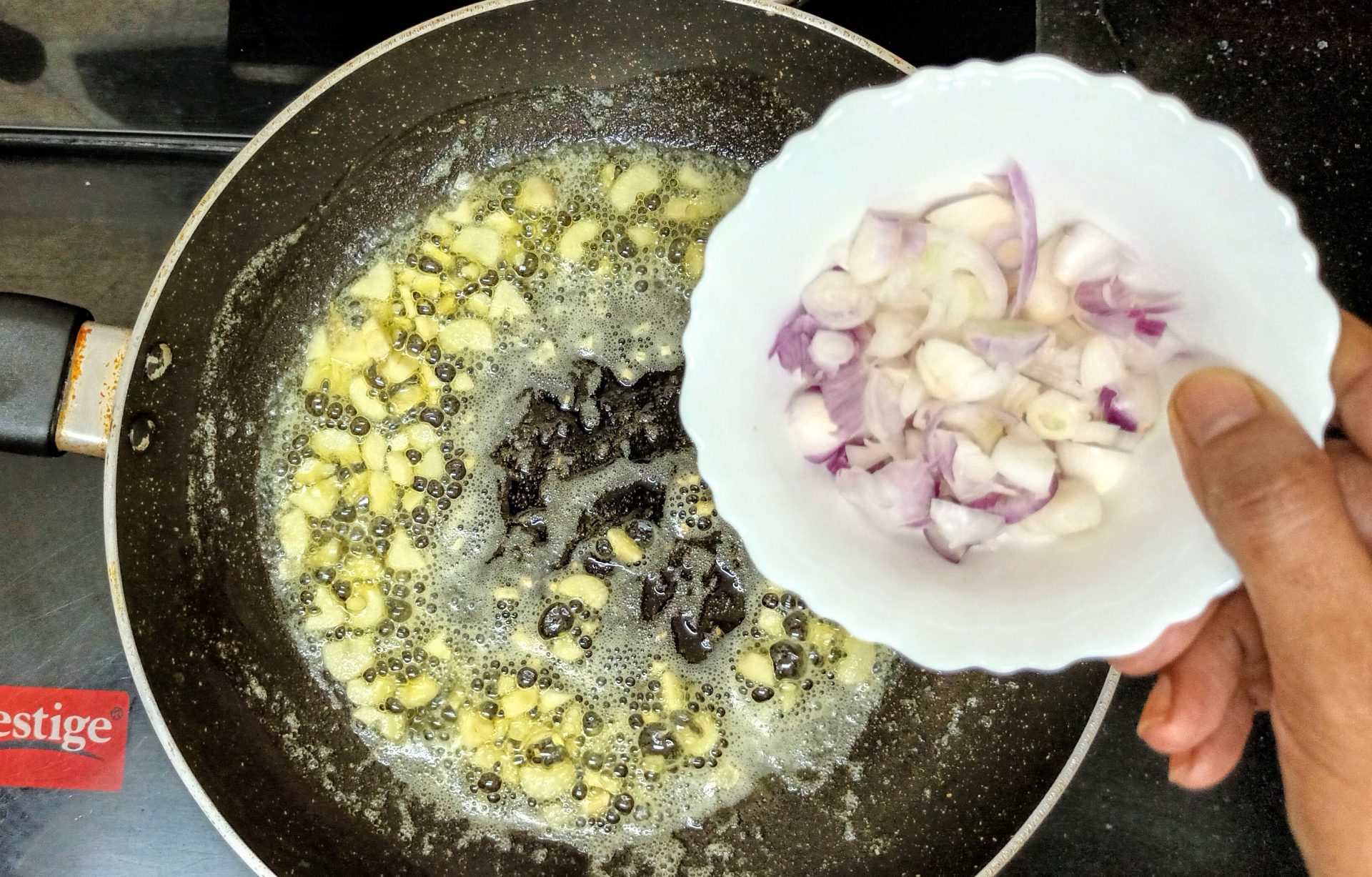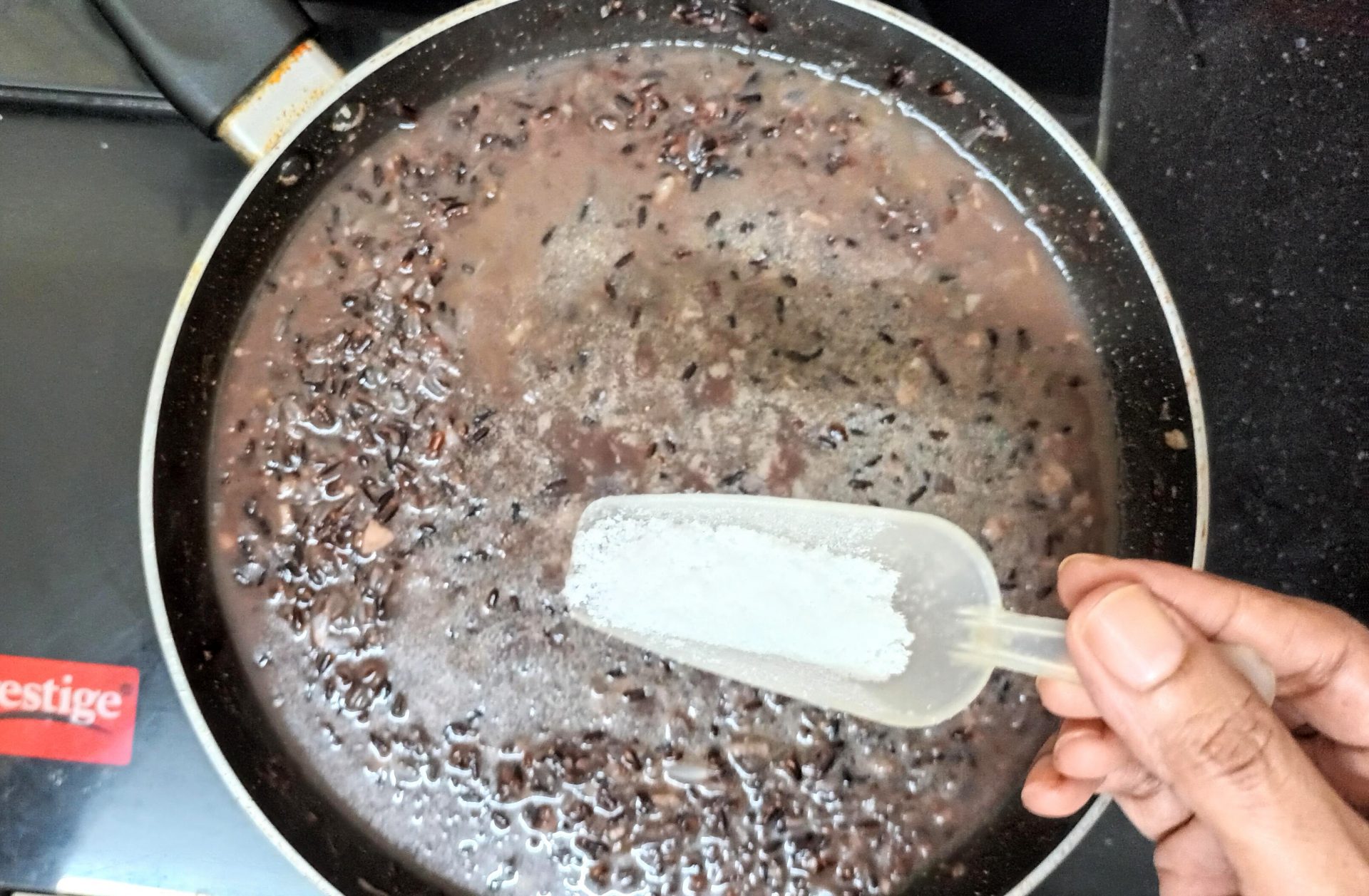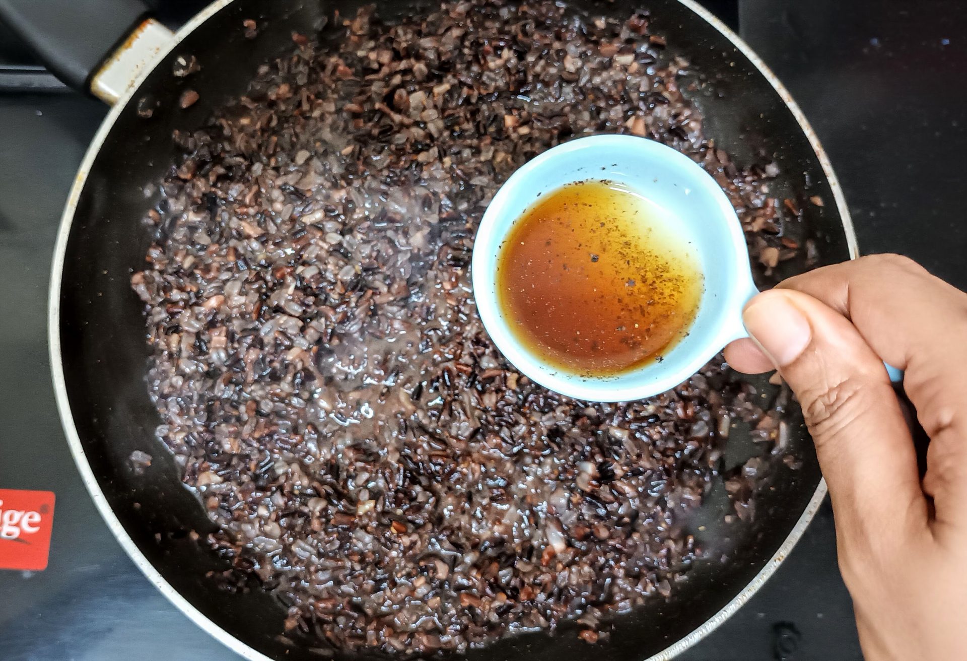 - Wash and soak the Black Rice for 4 to 5 hours. Later Rinse again, drain and keep aside. Now to a hot pan add the butter. When the butter melts, add the crushed garlic and saute for 30 seconds. Further add the onions, and saute until they turn transparent. Take care not to brown them.