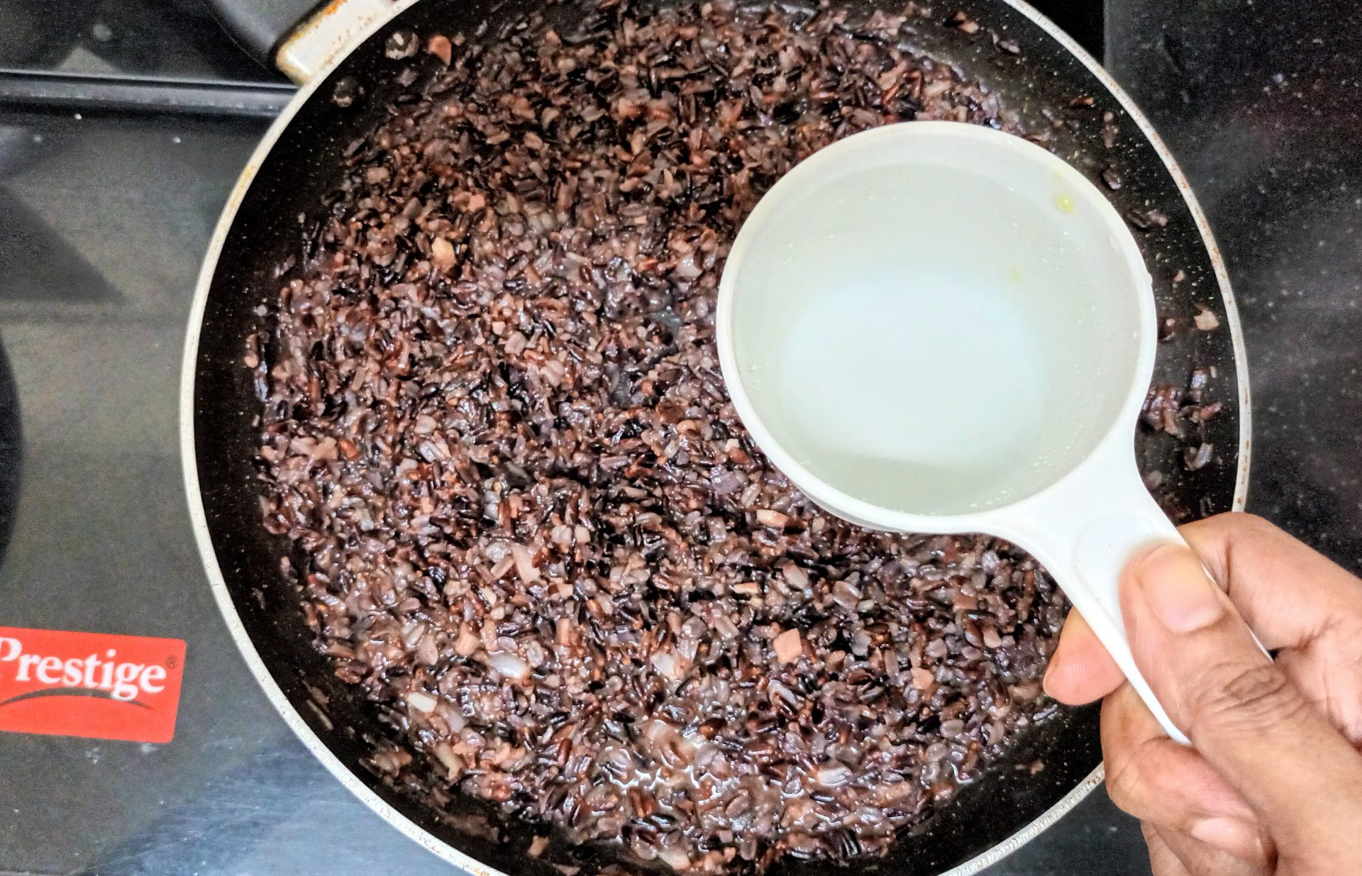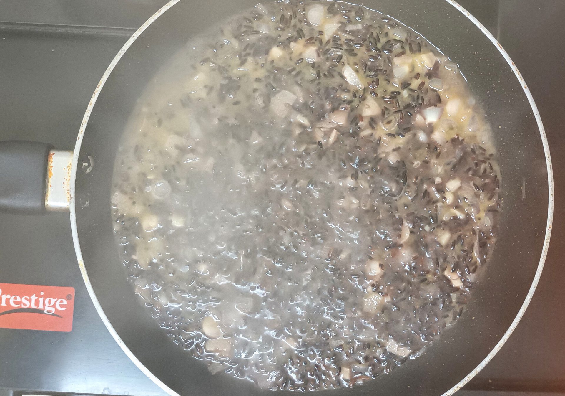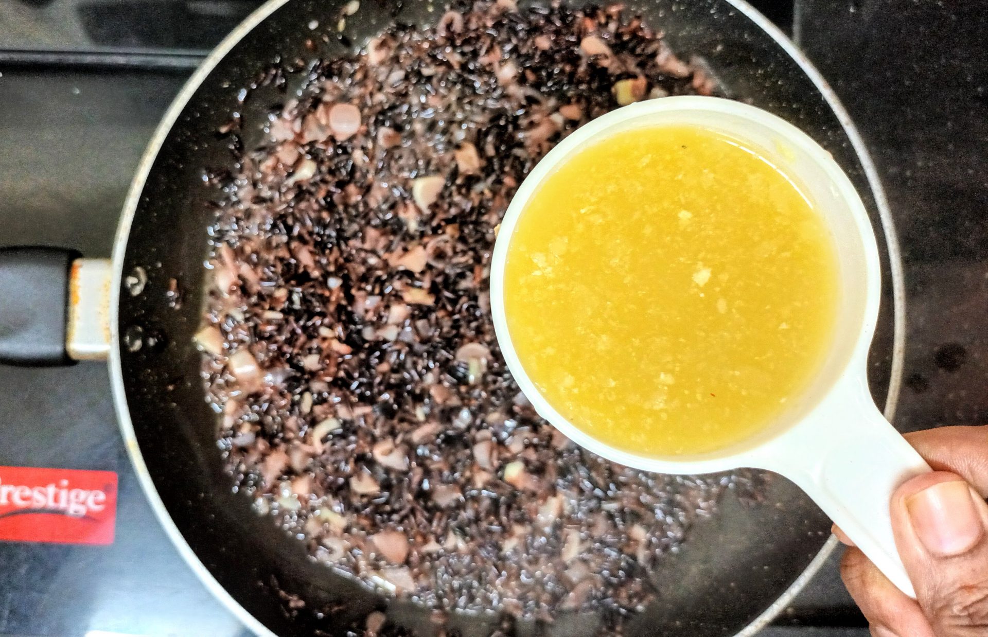 - Now add the Black rice, followed by a cup water or broth. Stir well and cook covered on medium high for until almost all water evaporates. Now add a cup of broth, stir and cook covered again on low flame for 5 minutes or until the rice is almost cooked. A little aldente is ok at this stage.