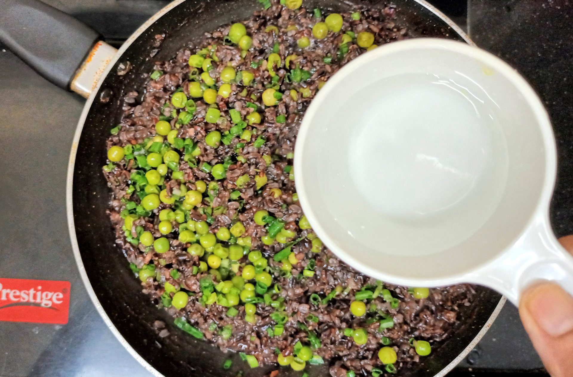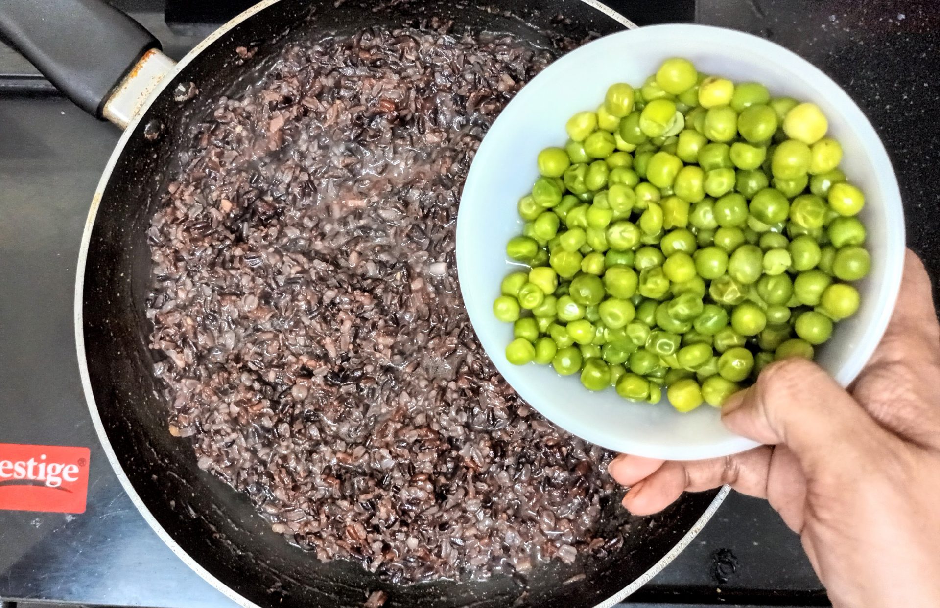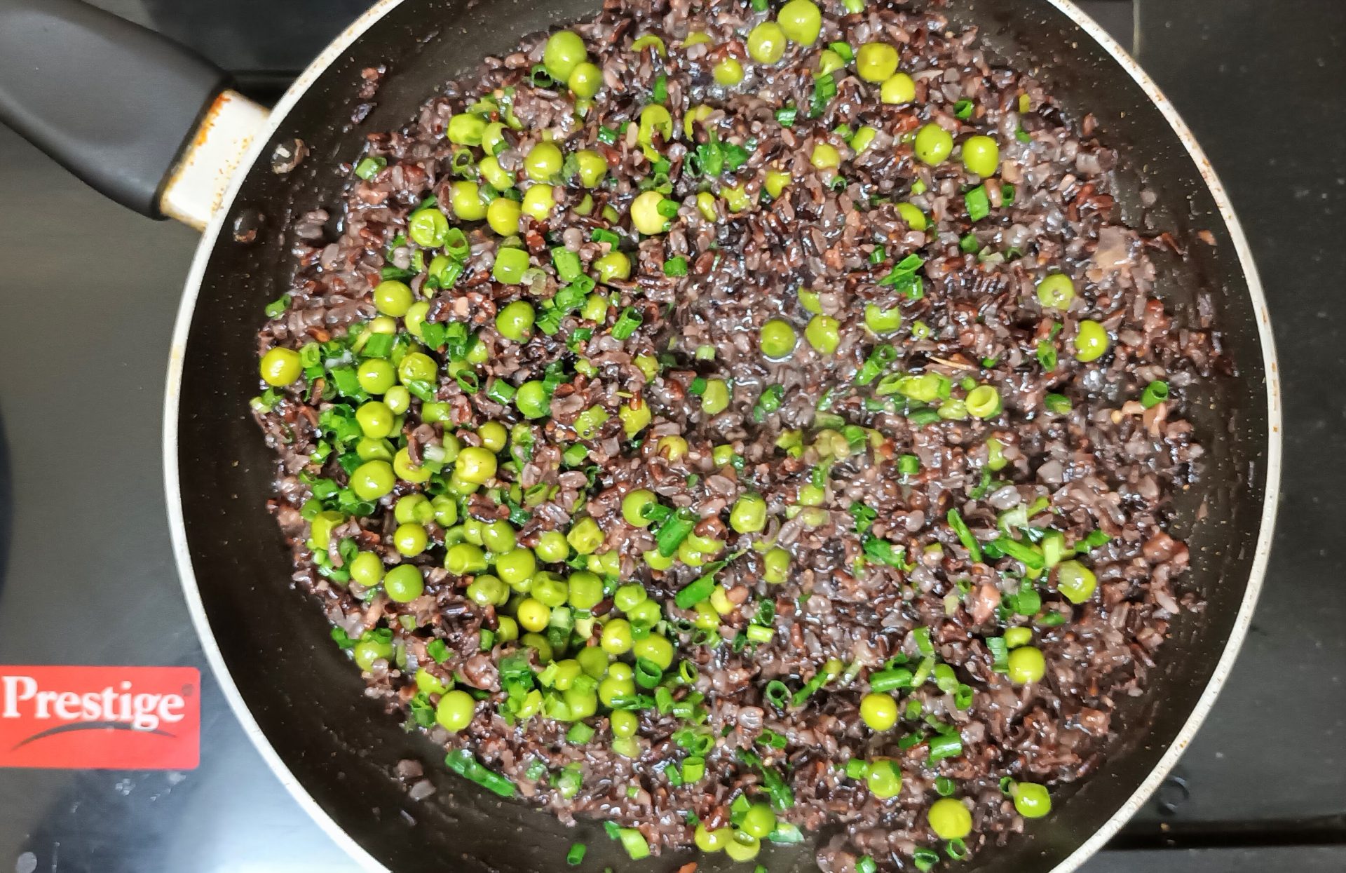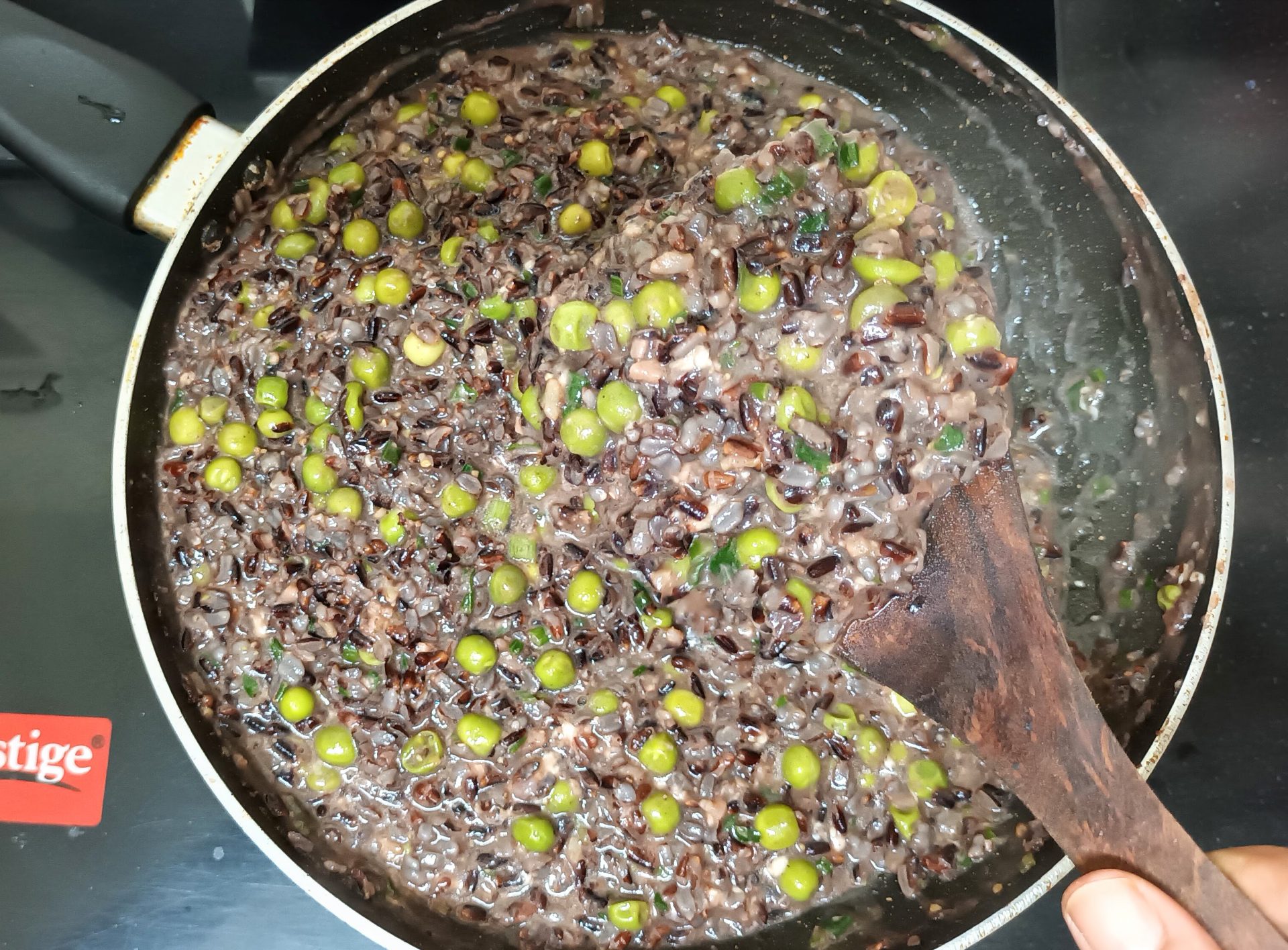 - Now add the Black rice, followed by a cup water or broth. Stir well and cook covered on medium high for until almost all water evaporates. Now add a cup of broth, stir and cook covered again on low flame for 5 minutes or until the rice is almost cooked. A little aldente is ok at this stage.