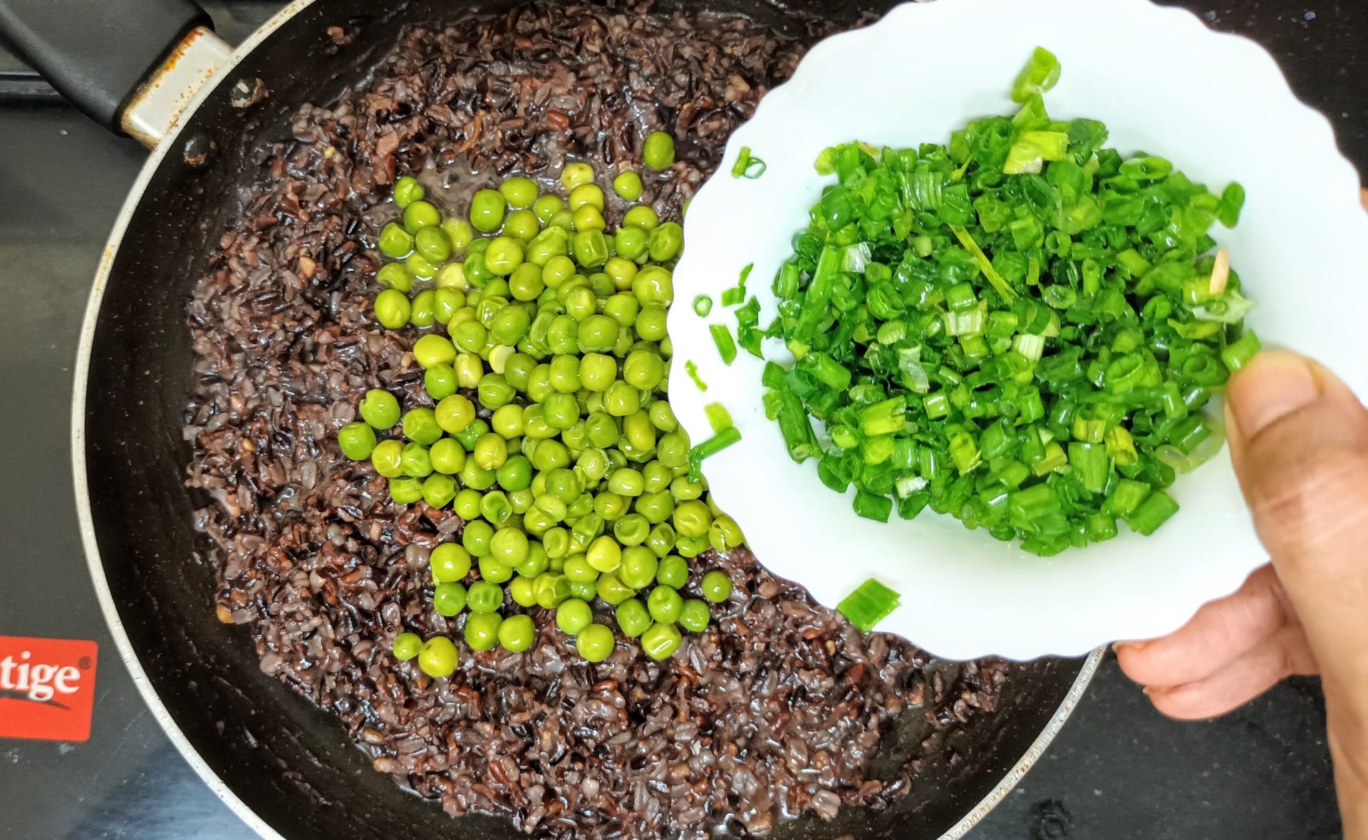 Wash and soak the Black Rice for 4 to 5 hours. Later Rinse again, drain and keep aside. Now to a hot pan add the butter. When the butter melts, add the crushed garlic and saute for 30 seconds. Further add the onions, and saute until they turn transparent. Take care not to brown them. Now add the Black rice, followed by a cup water or broth. Stir well and cook covered on medium high for until almost all water evaporates. Now add a cup of broth, stir and cook covered again on low flame for 5 minutes or until the rice is almost cooked. A little aldente is ok at this stage. Now open the lid, stir and add another cup of water or broth. Add salt, and pepper powder, cover and cook again until the rice is soft(read notes). Now open the lid, stir and add the wine if using. Further add the cooked Green Peas and the Spring Onion greens, add another cup of broth or water and cook over a low flame, uncovered. Now the rice gets creamy, to fasten the process, keep mashing with the back of a ladle, whenever you stir. Finally add the Parmesan Cheese, and keep stirring until until all the cheese melts and combines with the rice. The final result must be creamy. At this stage turn off the stove, sprinkle some cheese and serve hot.
