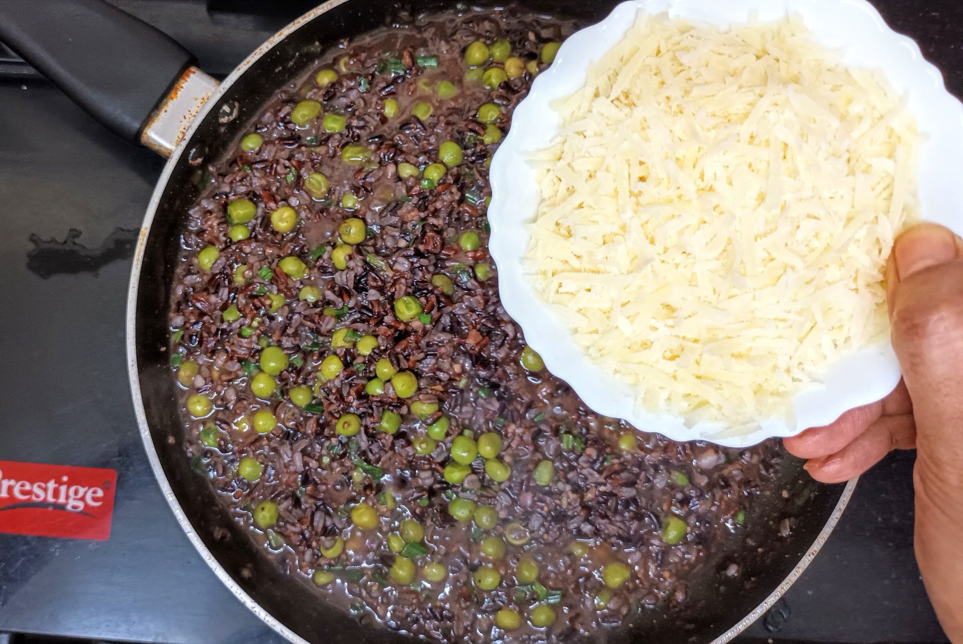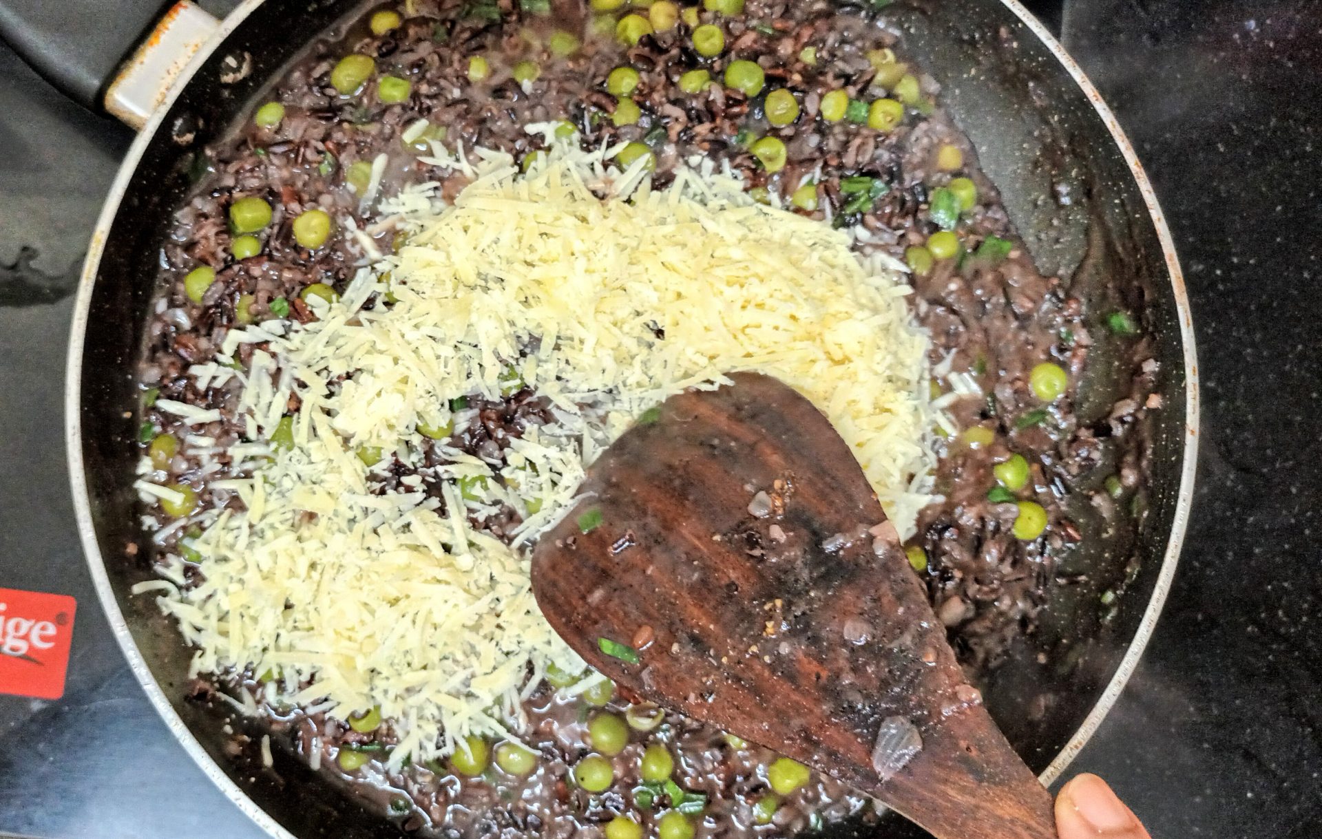 In this recipe I have used some homemade Red Wine given by a dear friend. We are a family of teetotallers, and this red wine is used only when I make Rissoto. Imagine having a bottle of homemade wine lasting 4 years. That said, using wine is optional. The wine helps to bring out the taste of the rice and cheese. Black Rice has a naturally nutty flavour, so using wine is not critical to the recipe.
