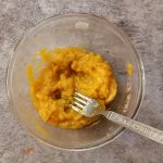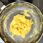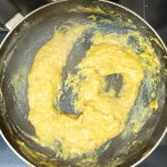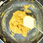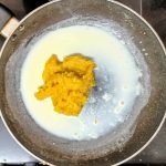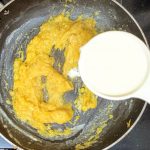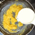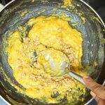 - Now pour 1/4 cup milk into the same pan, and reduce flame to low. Add the mashed banana and stir well. When all the milk is absorbed by the banana, add another 1/4 cup milk and stir nicely. Now add the brown sugar, mix until dissolved.