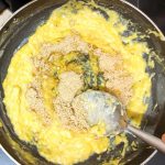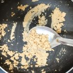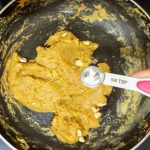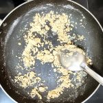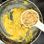 - Now to a pan add a tablespoon of ghee( clarified butter). Add the broken nuts and fry until brown. Remove the nuts on to a plate and to the same ghee add the whole wheat flour and roast. Keep stirring to avoid burning of the flour. Thus needs to be done on medium heat. The flour will turn crumbly. Continue to roast until you get a nice nutty aroma ( just like wheat halwa). Remove the roasted flour to a plate.