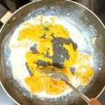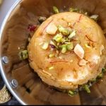- Stir until the Halwa( pudding) comes together . When it is done, the mixture will leave the sides of the pan, and will not stick to the bottom. Now add a tablespoon of Ghee/ clarified butter, and mix. Add the toasted nuts, and edible camphor now( if using), followed by another tablespoon of ghee. Turn off the flame and enjoy warm.