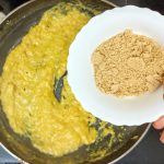 - When the sugar dissolves, reduce the flame, and add the roasted wheat flour to the mashed banana. Mix well ( using cut and fold method), breaking any lumps in the wheat flour to get a smooth texture.