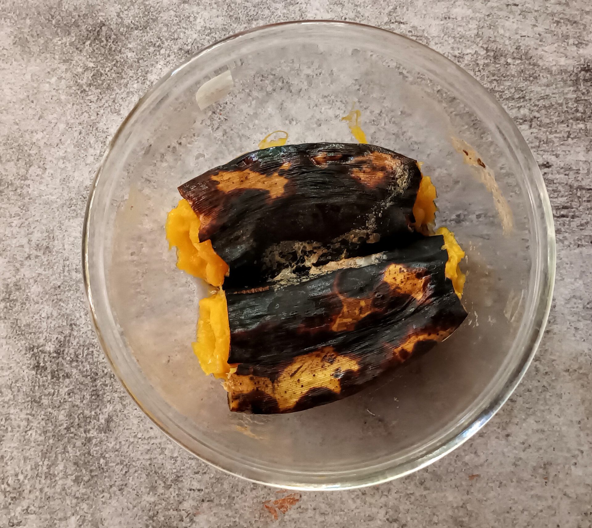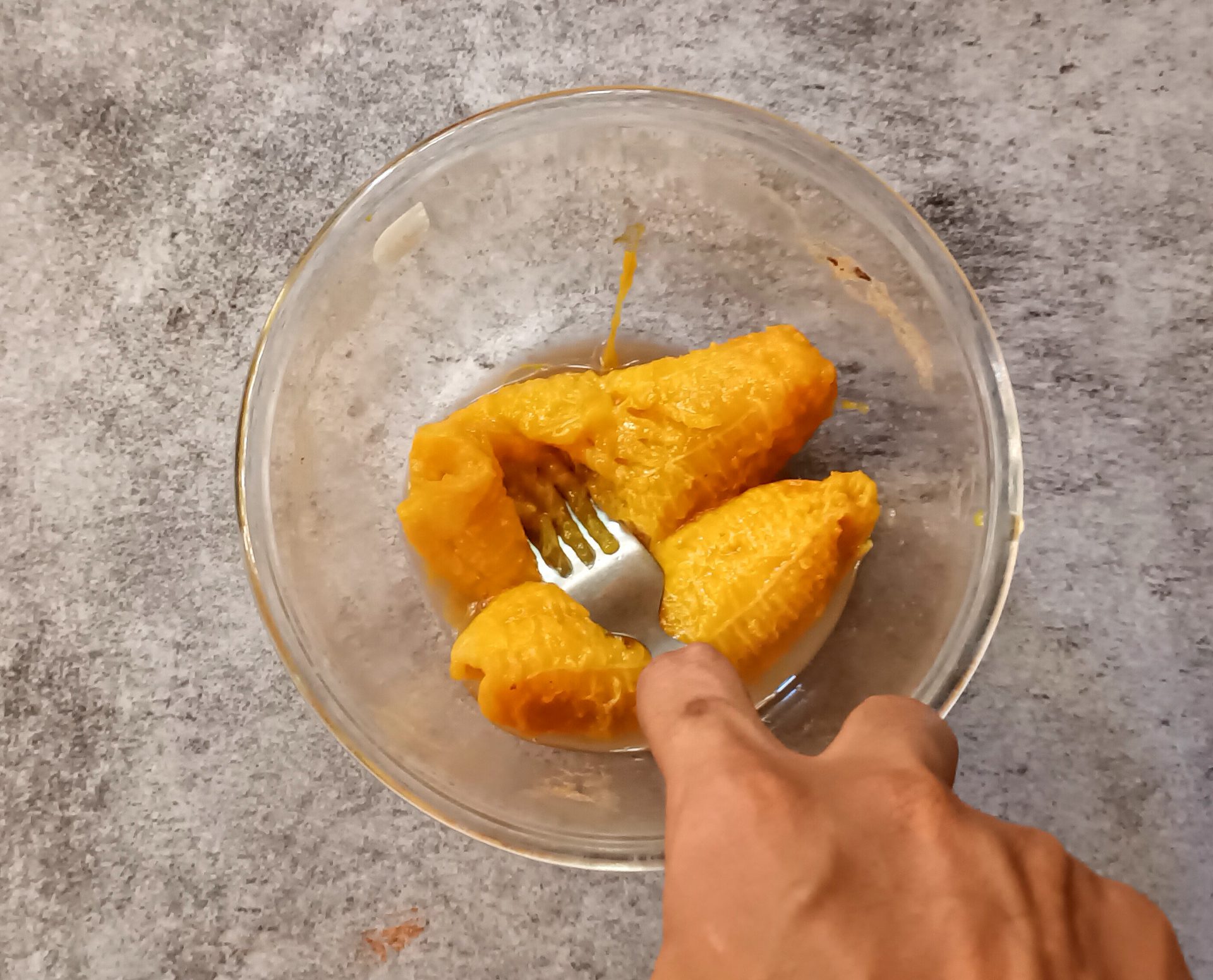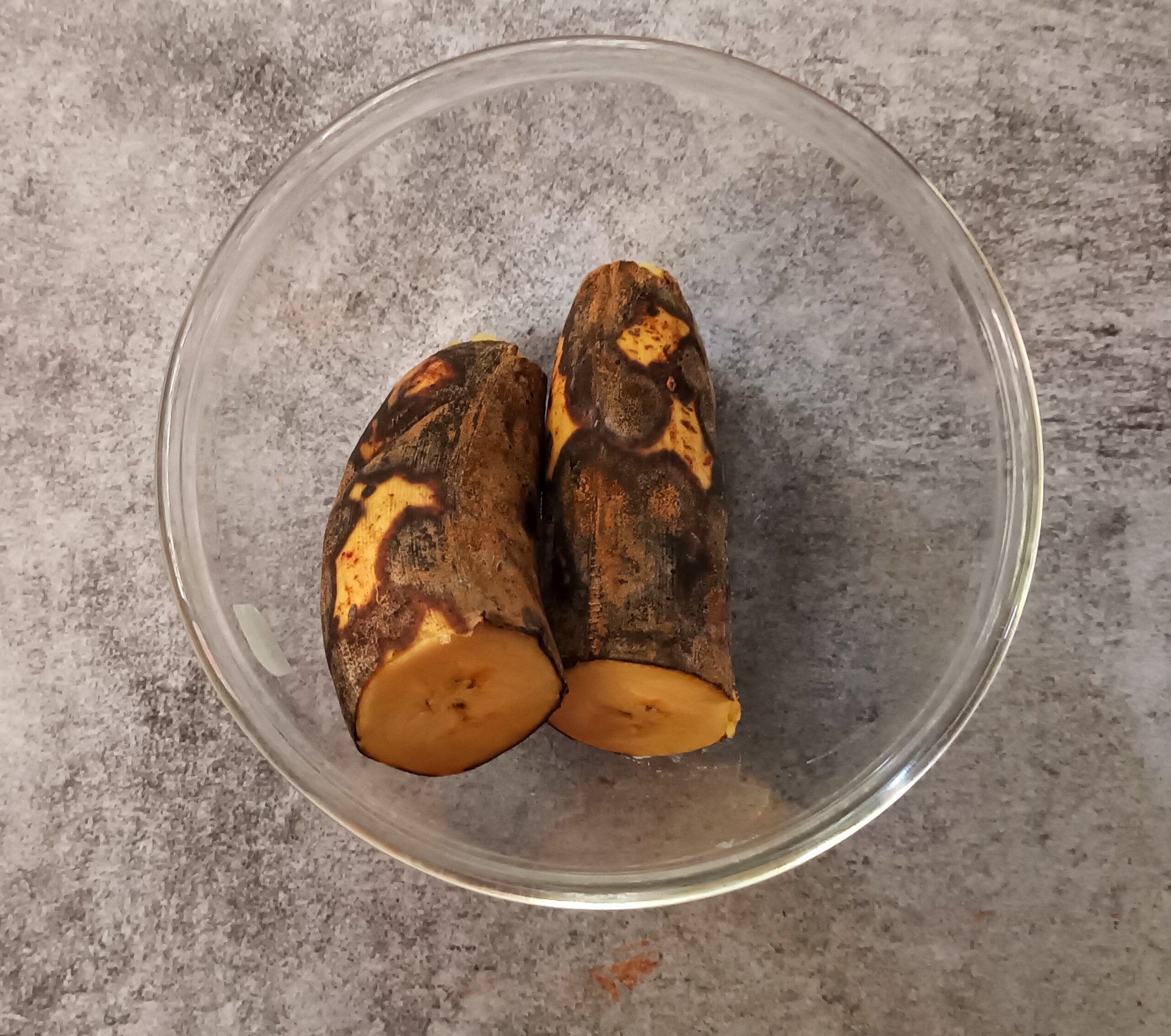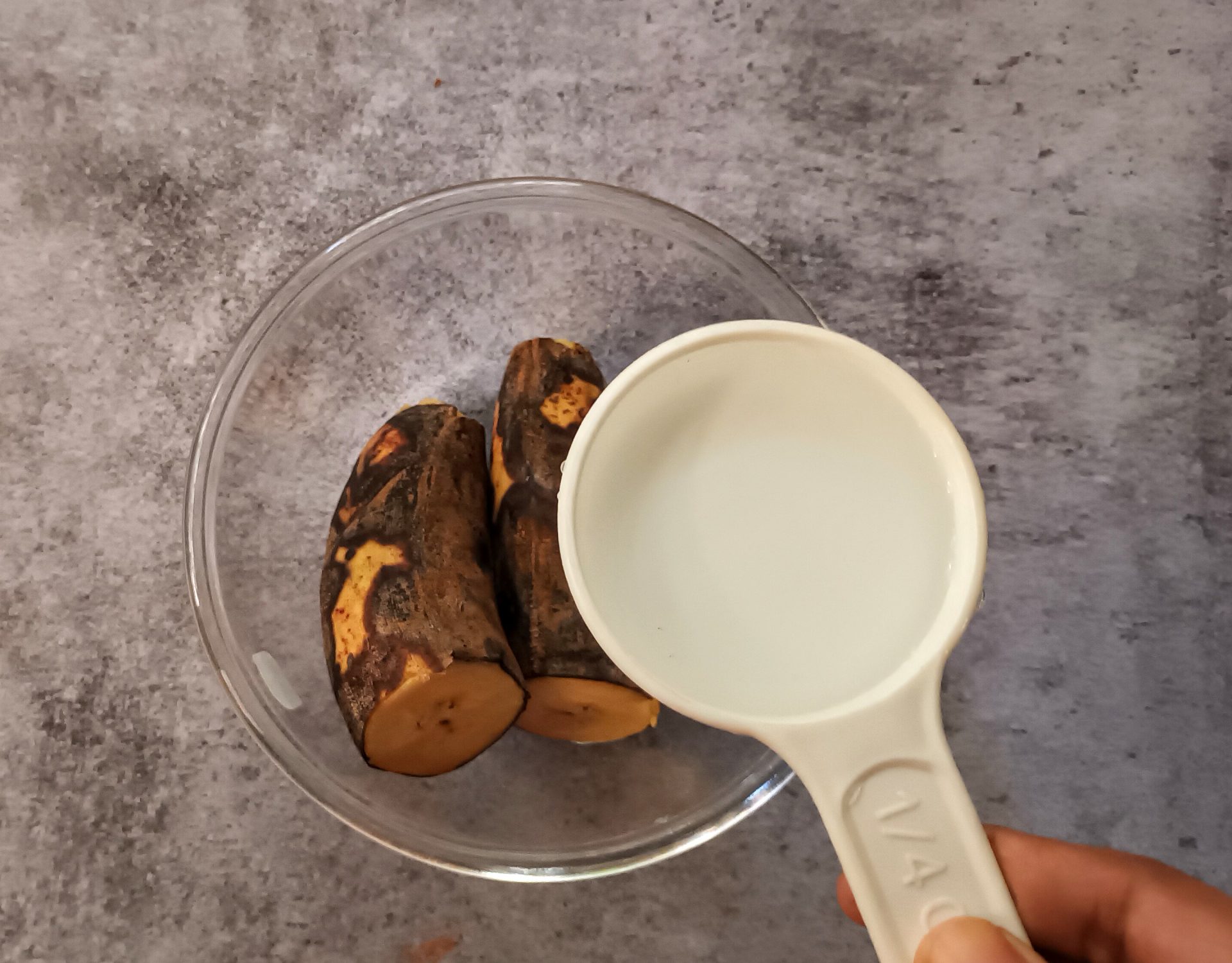 - Take a well ripened Nendran Banana, cut it into 2 halves, add quarter cup and steam it with the skin, in a pressure cooker for 5 minutes or Microwave on high for 3 minutes. Cool it, discard the skin and mash well with a fork.