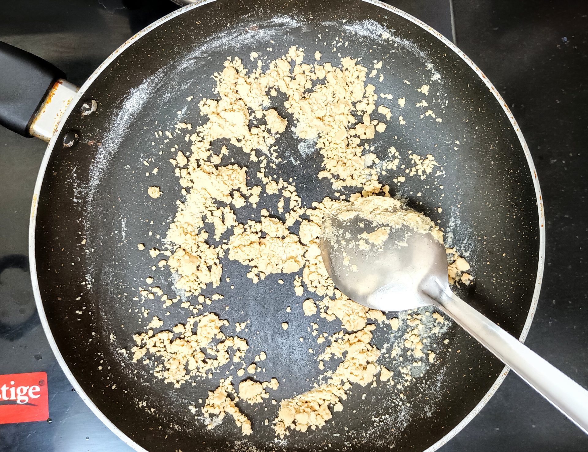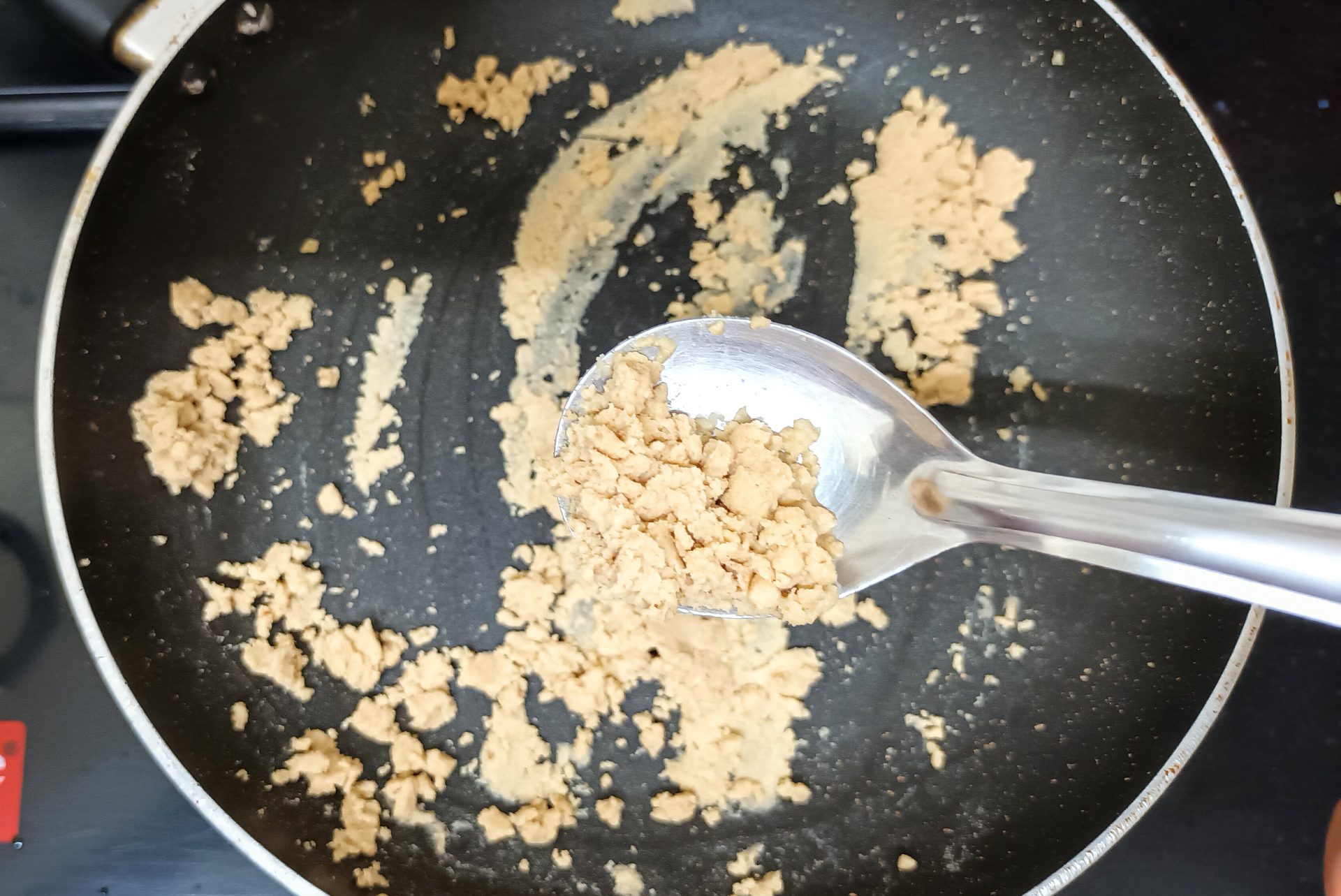 - Now to a pan add a tablespoon of ghee( clarified butter). Add the broken nuts and fry until brown. Remove the nuts on to a plate and to the same ghee add the whole wheat flour and roast. Keep stirring to avoid burning of the flour. Thus needs to be done on medium heat. The flour will turn crumbly. Continue to roast until you get a nice nutty aroma ( just like wheat halwa). Remove the roasted flour to a plate.