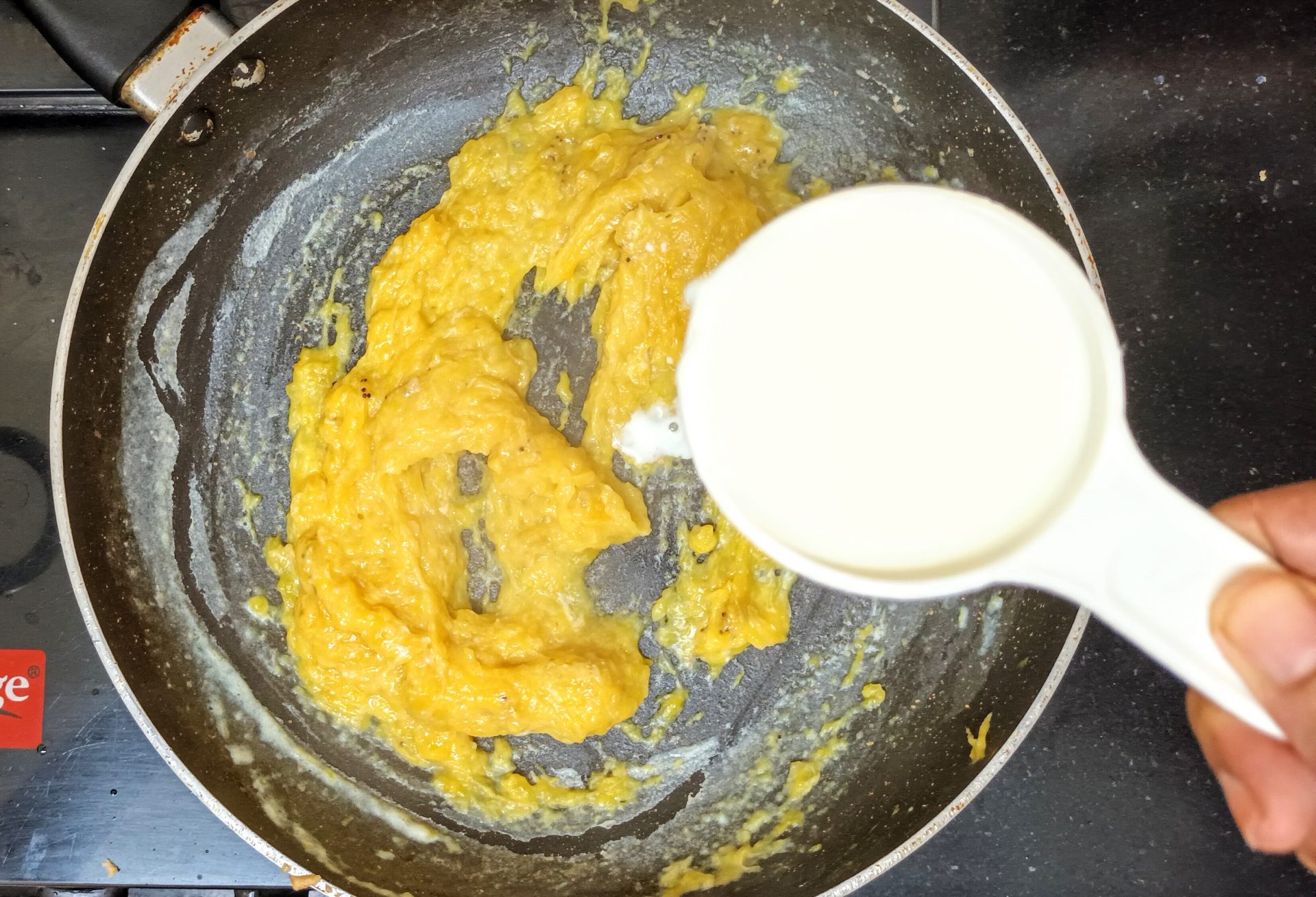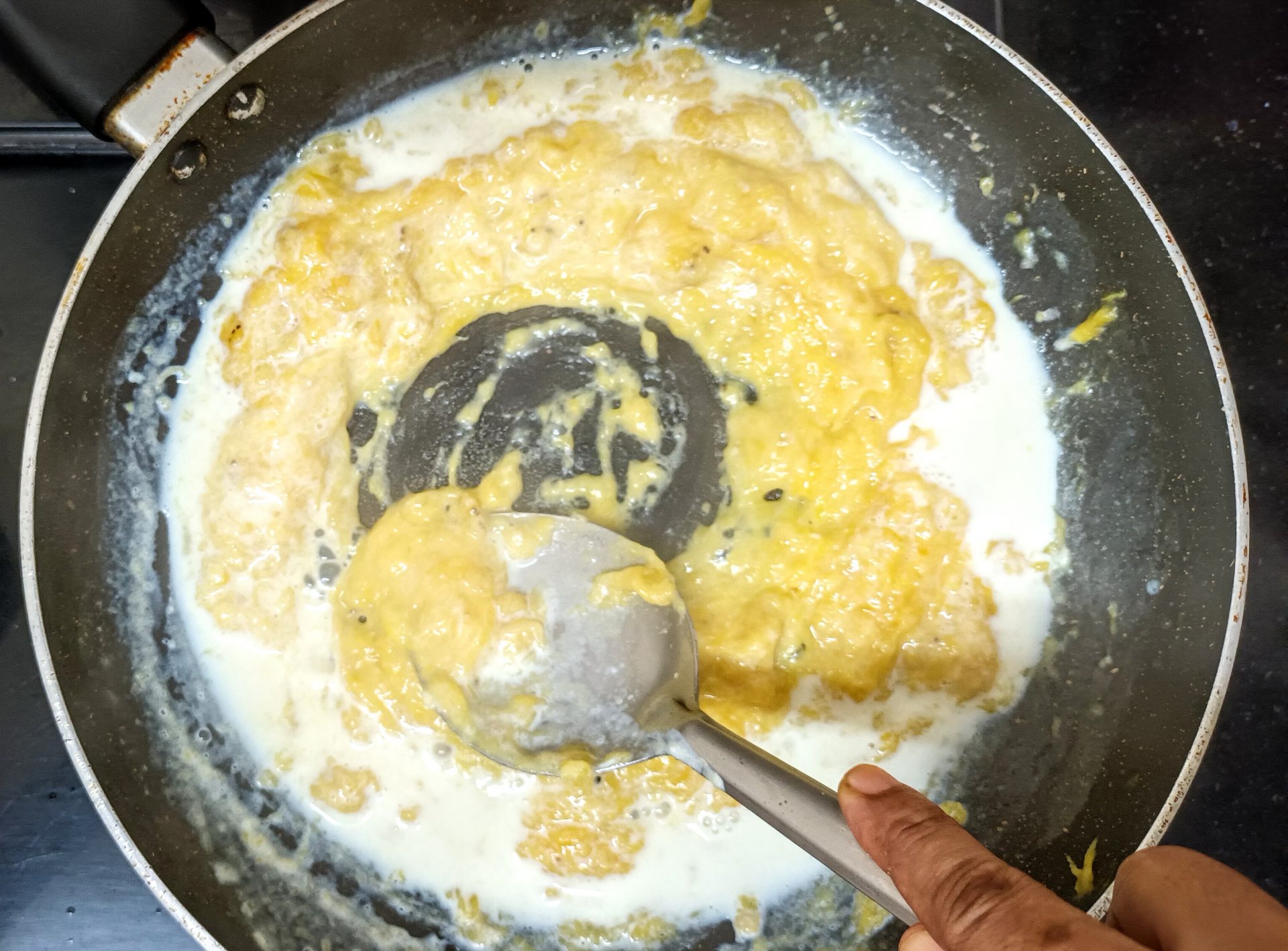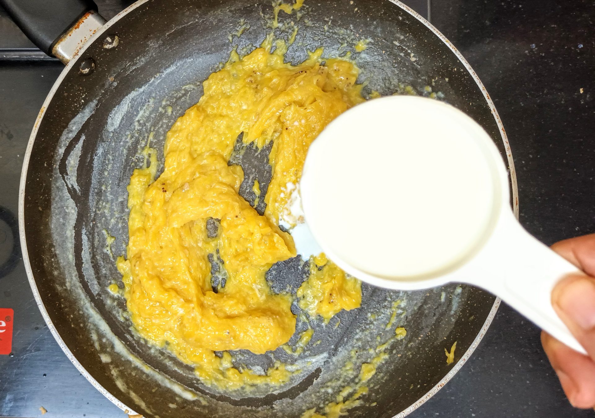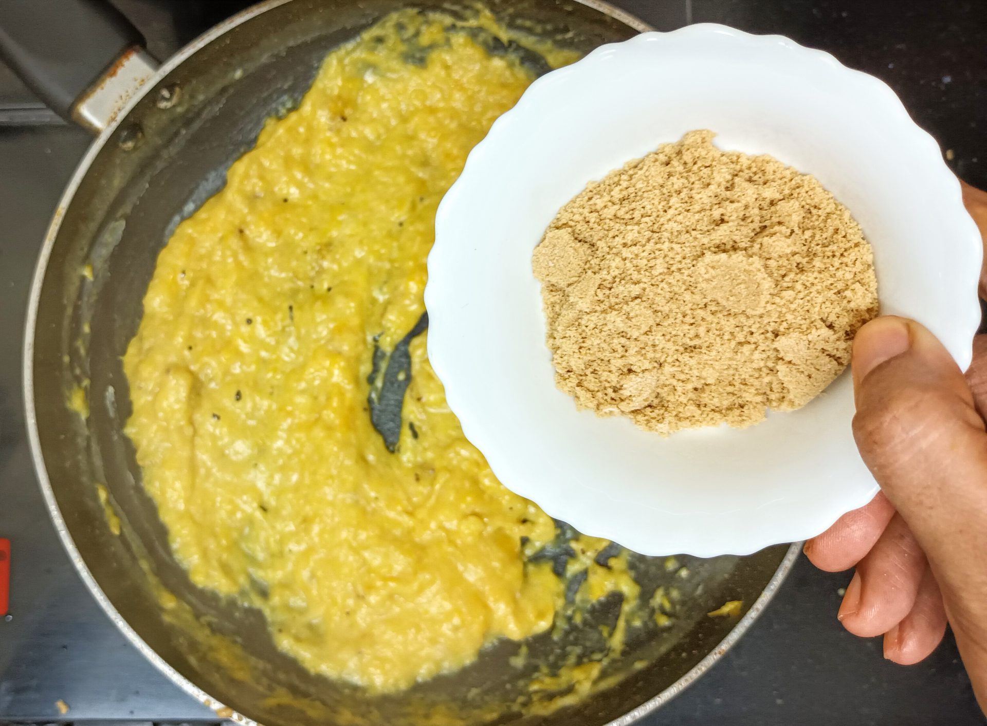 - Now pour 1/4 cup milk into the same pan, and reduce flame to low. Add the mashed banana and stir well. When all the milk is absorbed by the banana, add another 1/4 cup milk and stir nicely. Now add the brown sugar, mix until dissolved.