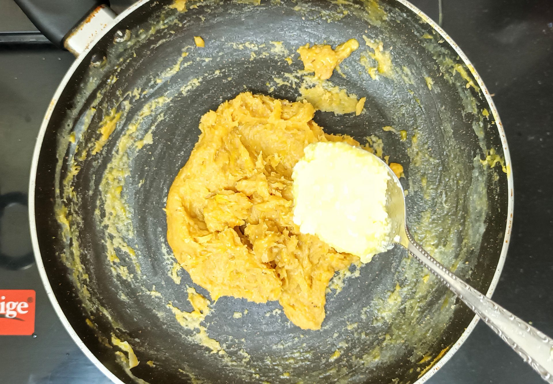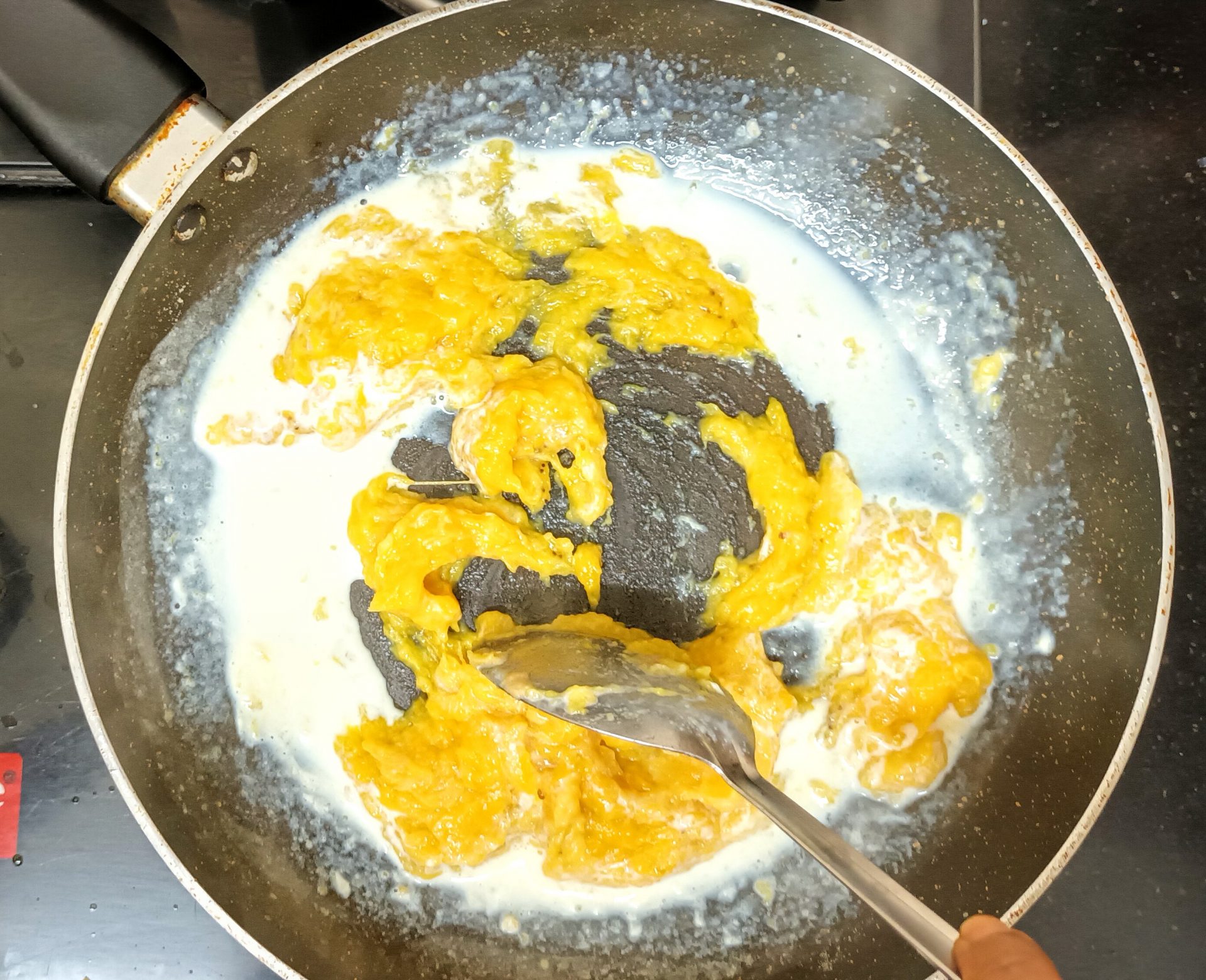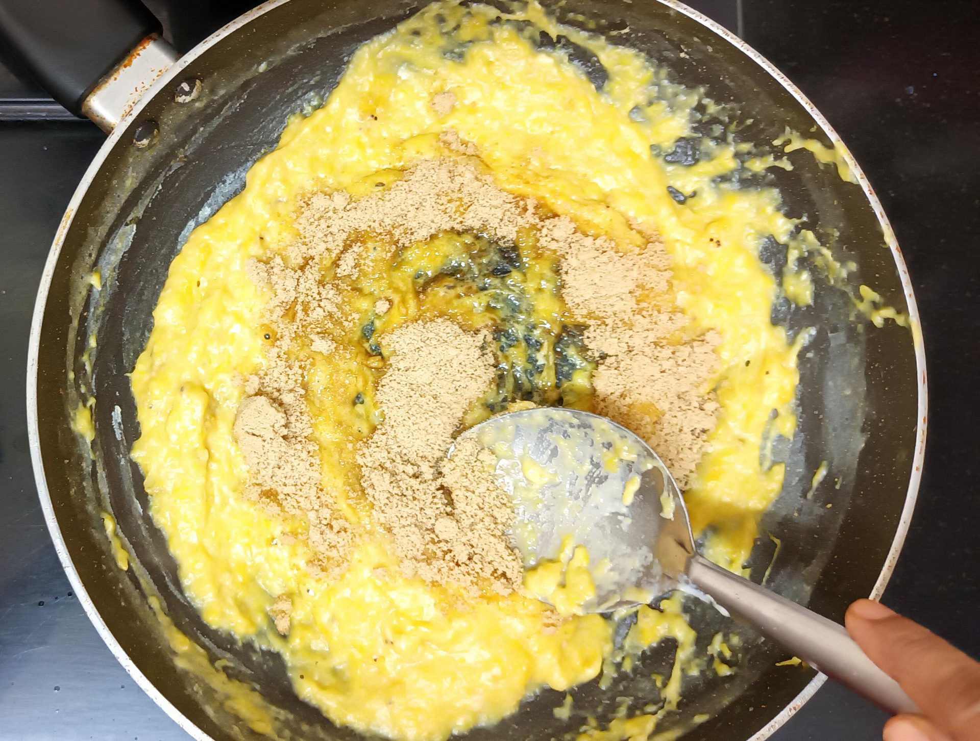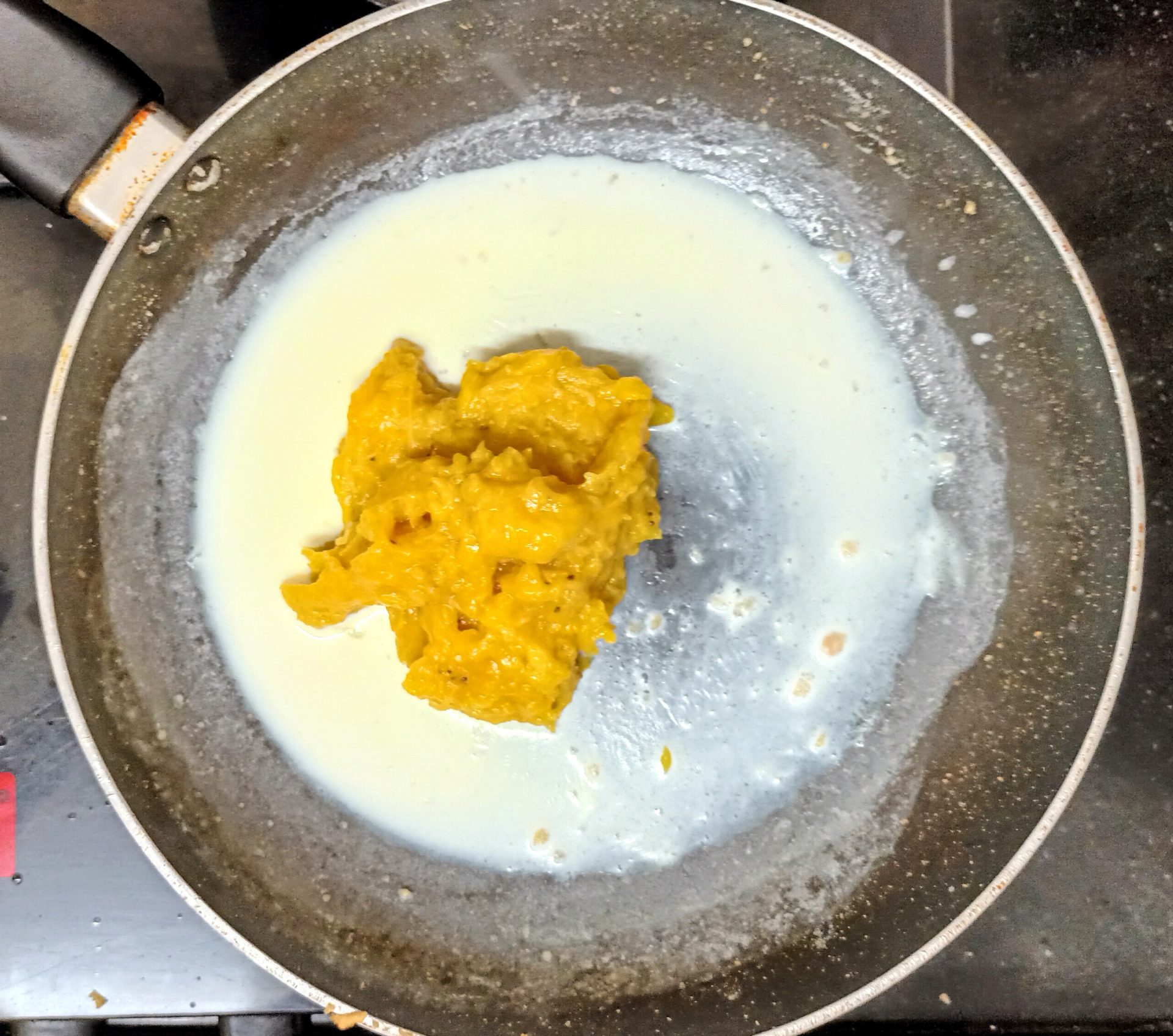 - Now pour 1/4 cup milk into the same pan, and reduce flame to low. Add the mashed banana and stir well. When all the milk is absorbed by the banana, add another 1/4 cup milk and stir nicely. Now add the brown sugar, mix until dissolved.