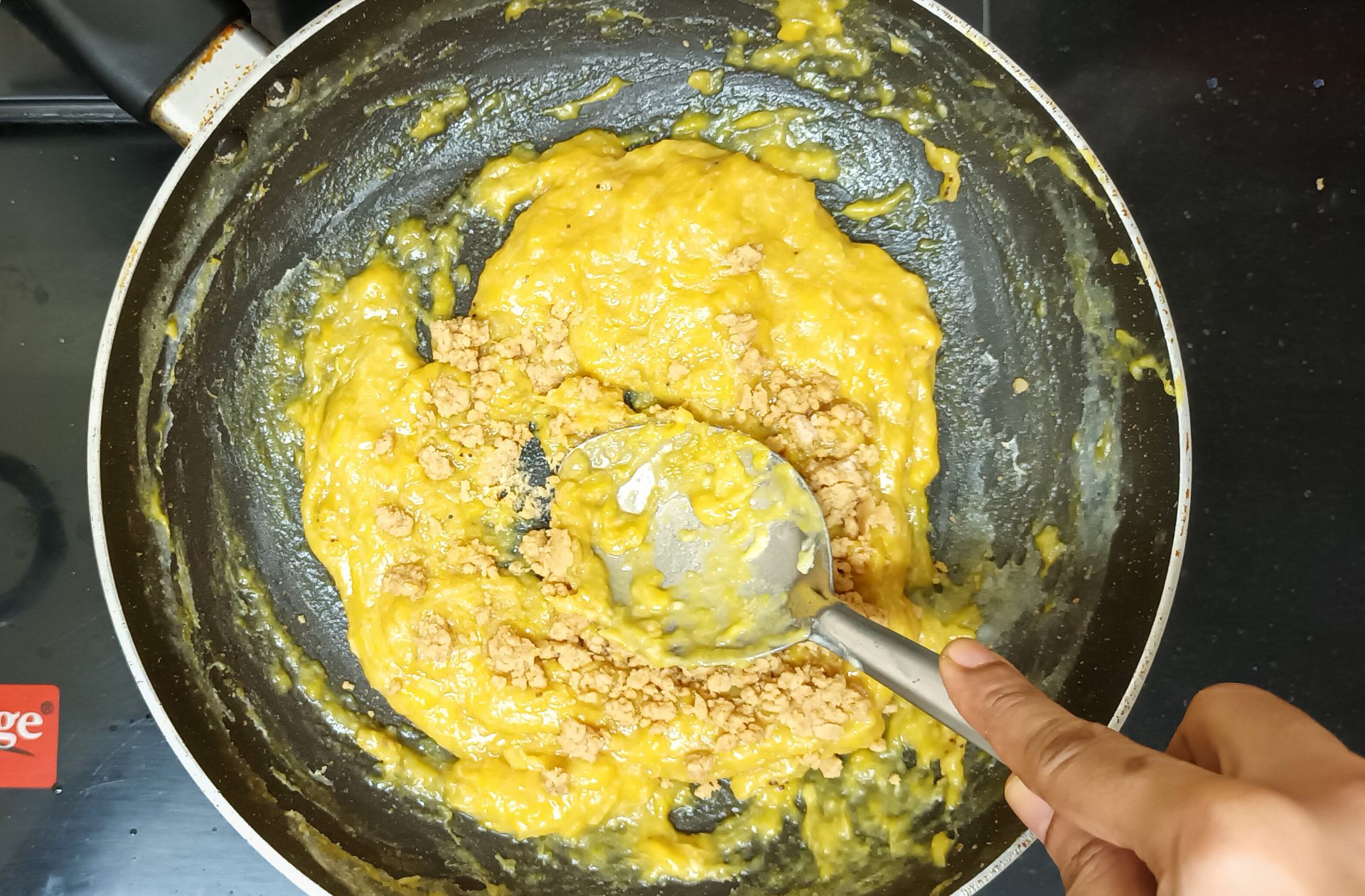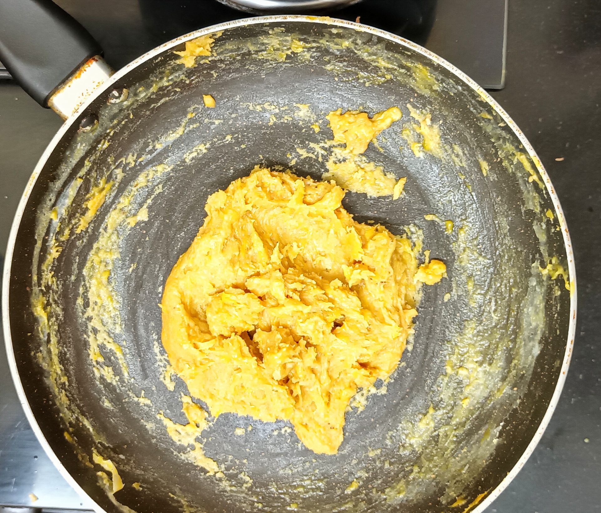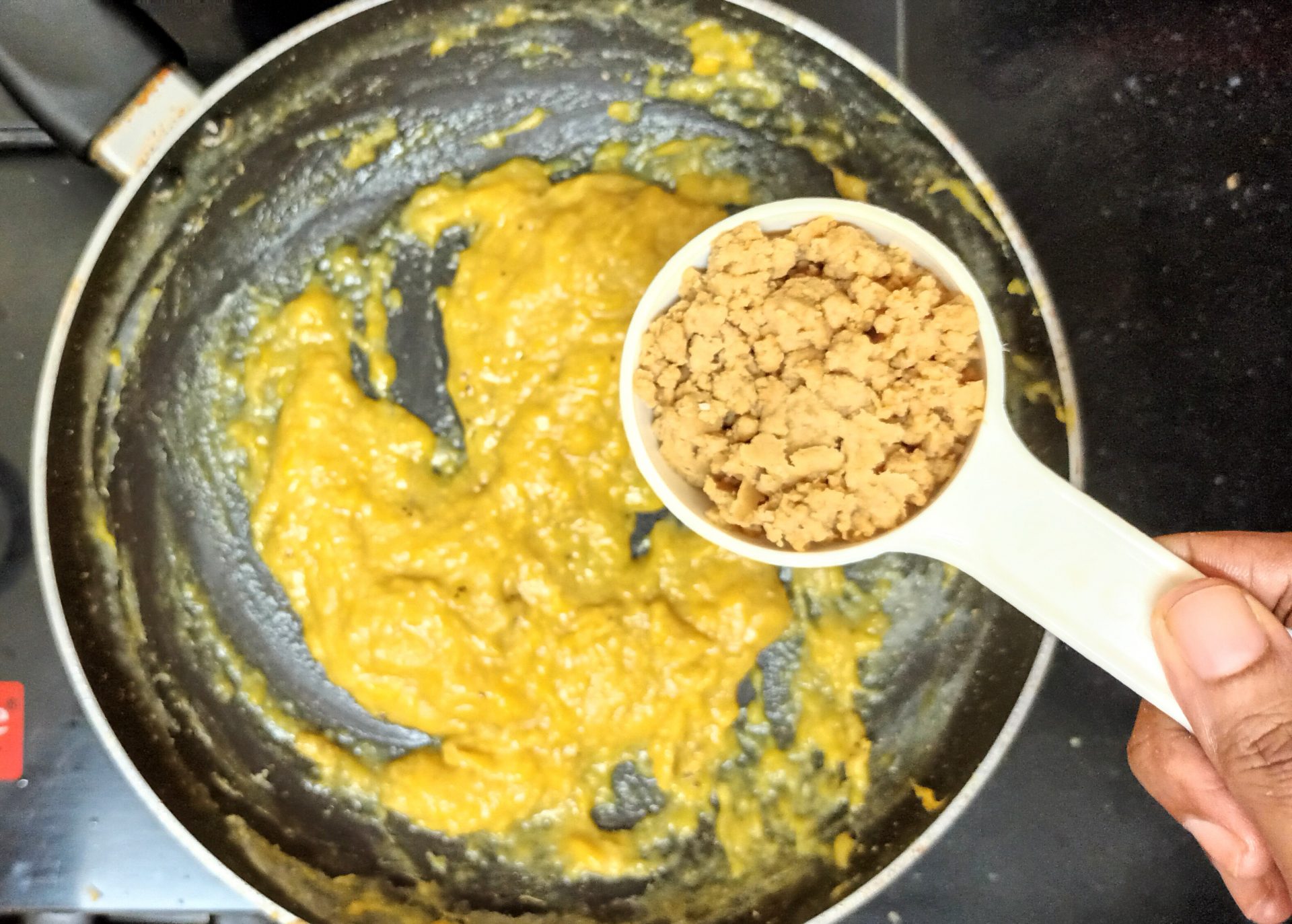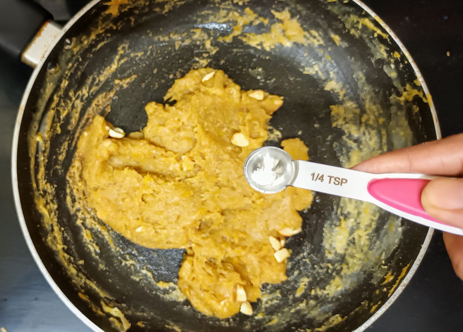 - Now pour 1/4 cup milk into the same pan, and reduce flame to low. Add the mashed banana and stir well. When all the milk is absorbed by the banana, add another 1/4 cup milk and stir nicely. Now add the brown sugar, mix until dissolved.