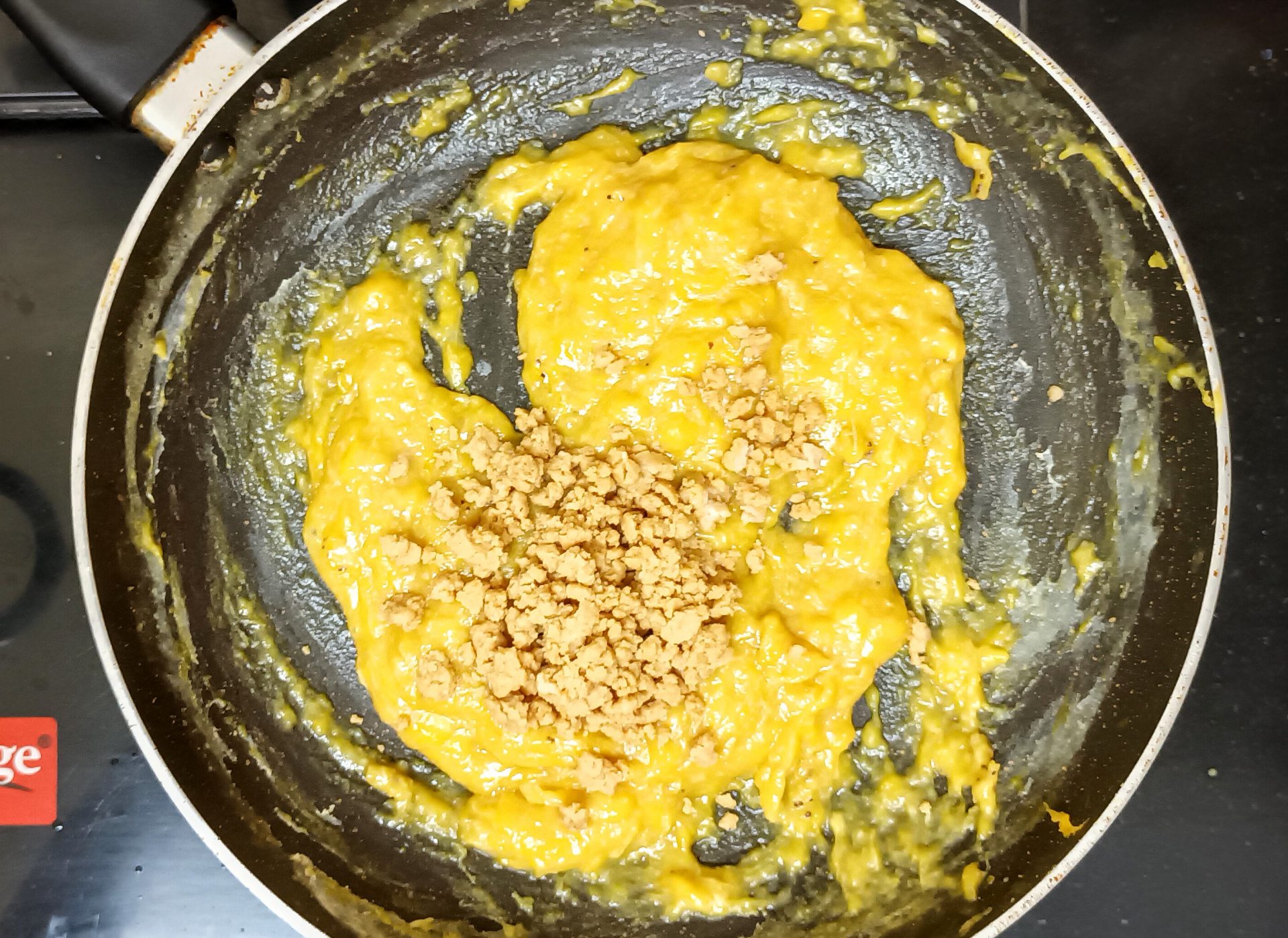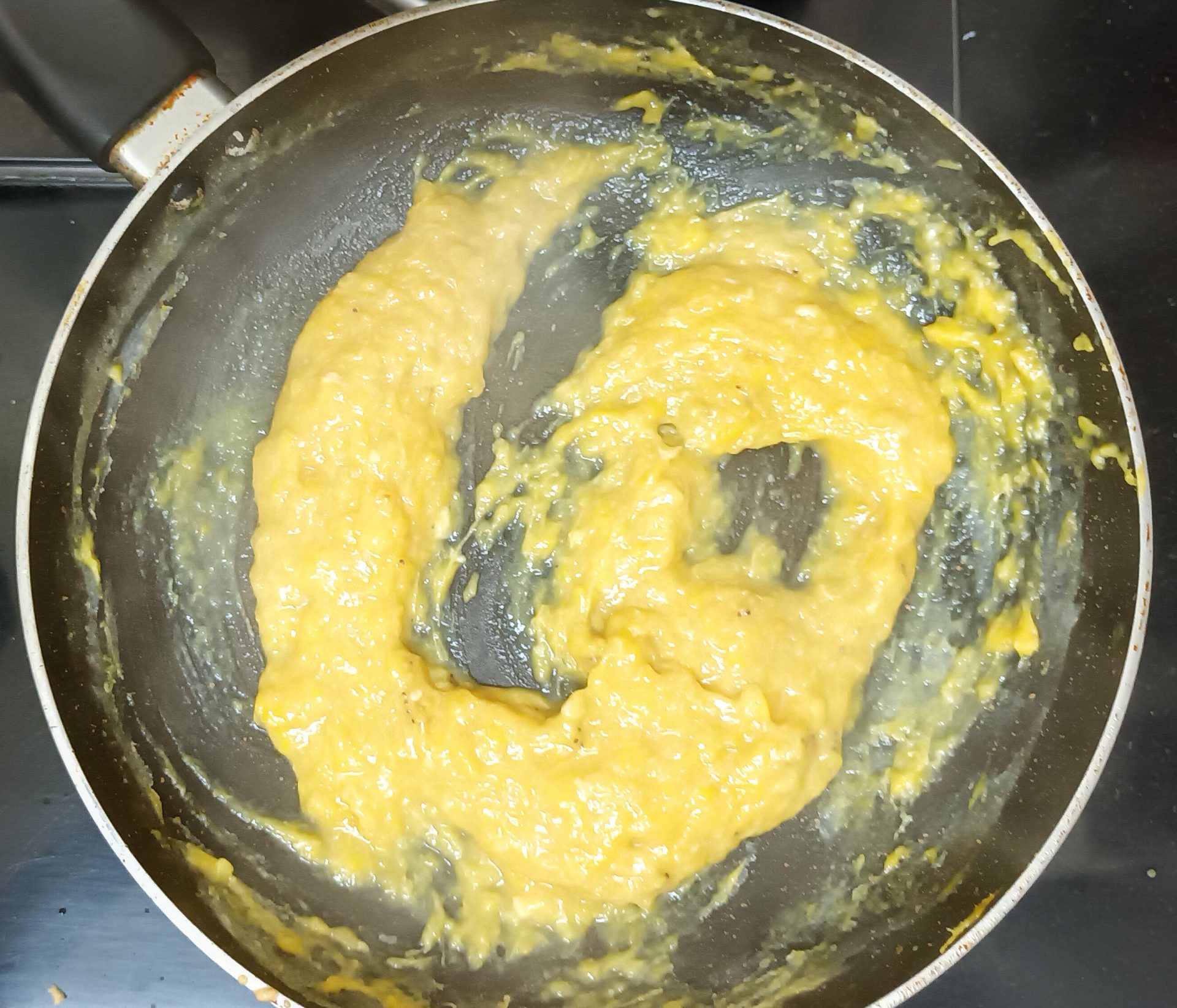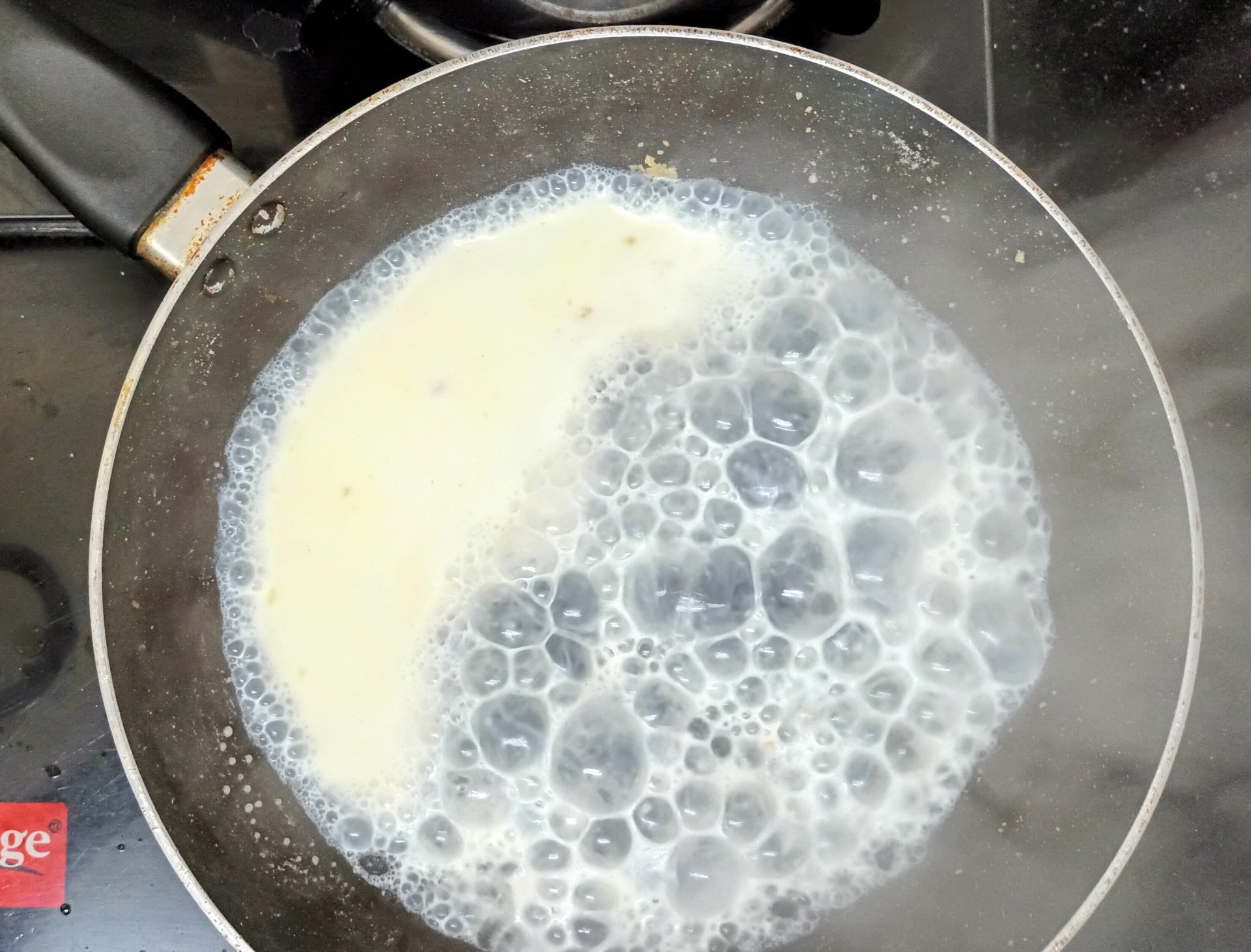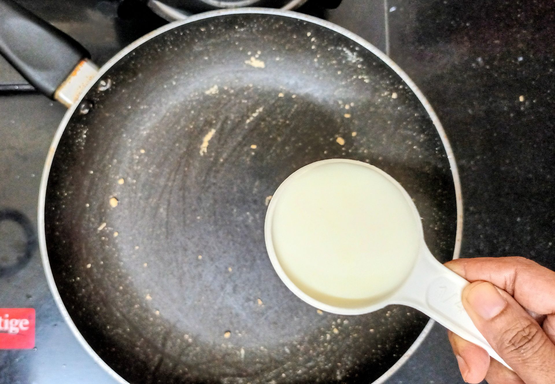 - Now pour 1/4 cup milk into the same pan, and reduce flame to low. Add the mashed banana and stir well. When all the milk is absorbed by the banana, add another 1/4 cup milk and stir nicely. Now add the brown sugar, mix until dissolved.