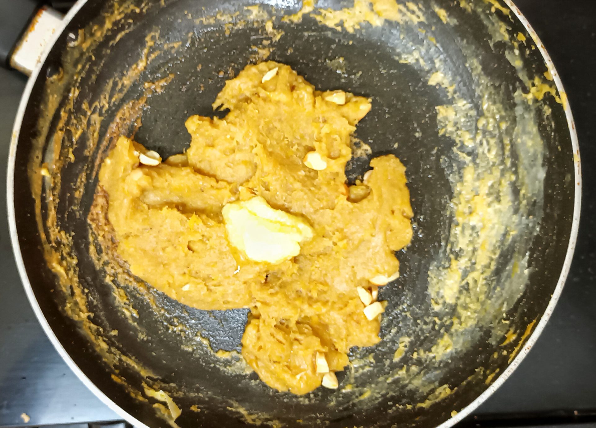 - Stir until the Halwa( pudding) comes together . When it is done, the mixture will leave the sides of the pan, and will not stick to the bottom. Now add a tablespoon of Ghee/ clarified butter, and mix. Add the toasted nuts, and edible camphor now( if using), followed by another tablespoon of ghee. Turn off the flame and enjoy warm.