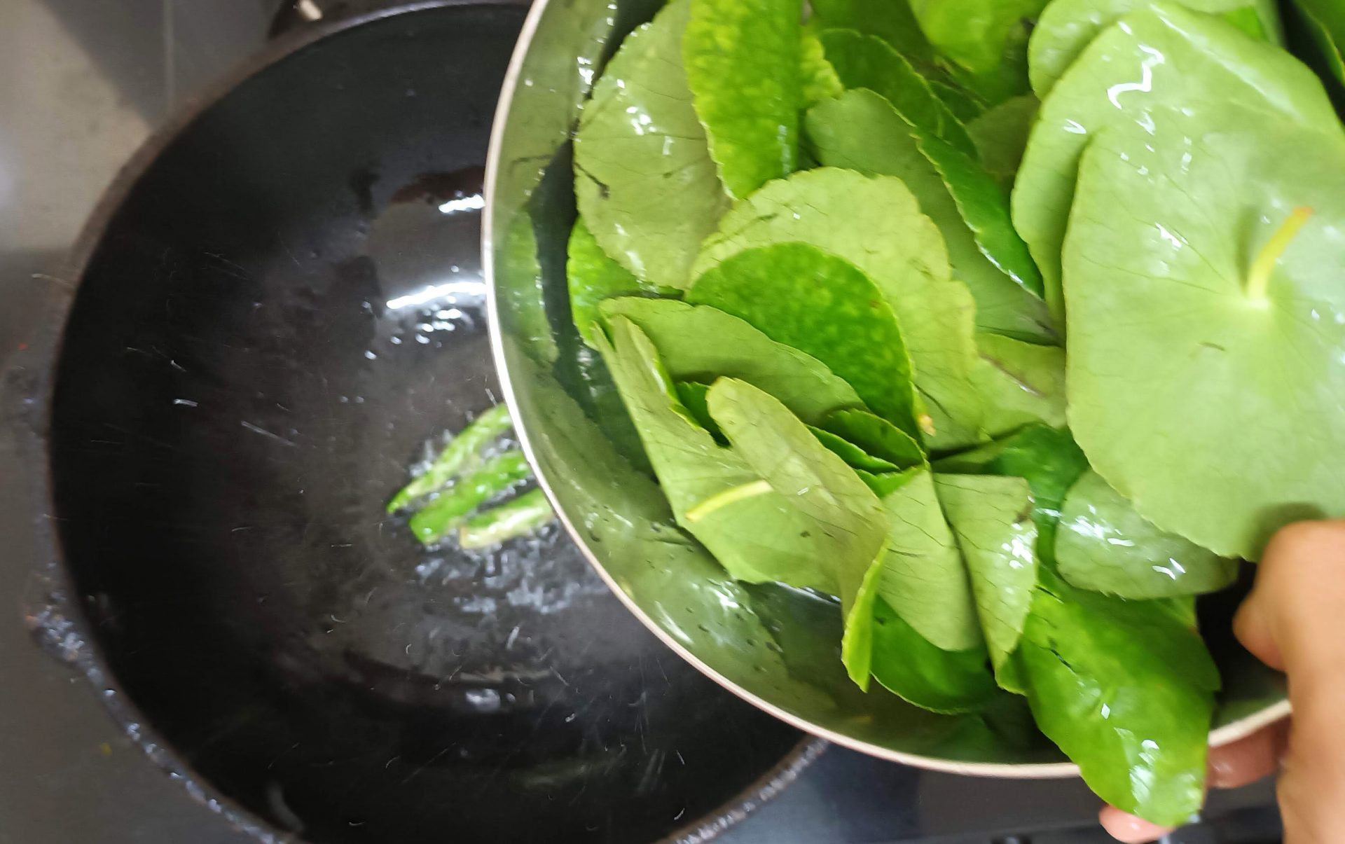 - Wash and drain the Brahmi leaves and set aside. Take oil in a pan/kadai and heat. To this add the green chillies, and fry for 30 seconds. Now add the leaves and fry until they wilt a bit. Add the tomatoes and continue to saute. Now add the Fried Gram dal followed by the coconut, and salt, and saute everything together until the tomatoes become a little tender and the leaves wilt further. Leave to cool. Now put this mixture into a blender jar and grind to the desired consistency adding a little water. If using lemon juice, add it now and give everything a good mix. Finally take oil in a tadka Kadai,, and add mustard seeds and when they splutter add the Urad dal followed by asafoetida. Pour the Tadka into the chutney and enjoy its benefits with Idli, Dosa, Apam and more.