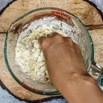 - Then add the flour a little at a time, and keep mixing with a spatula. Once all the flour is added, using your hands, knead lightly and bring the flour together.