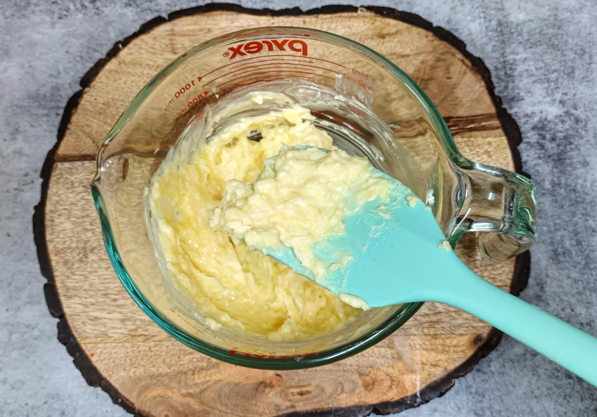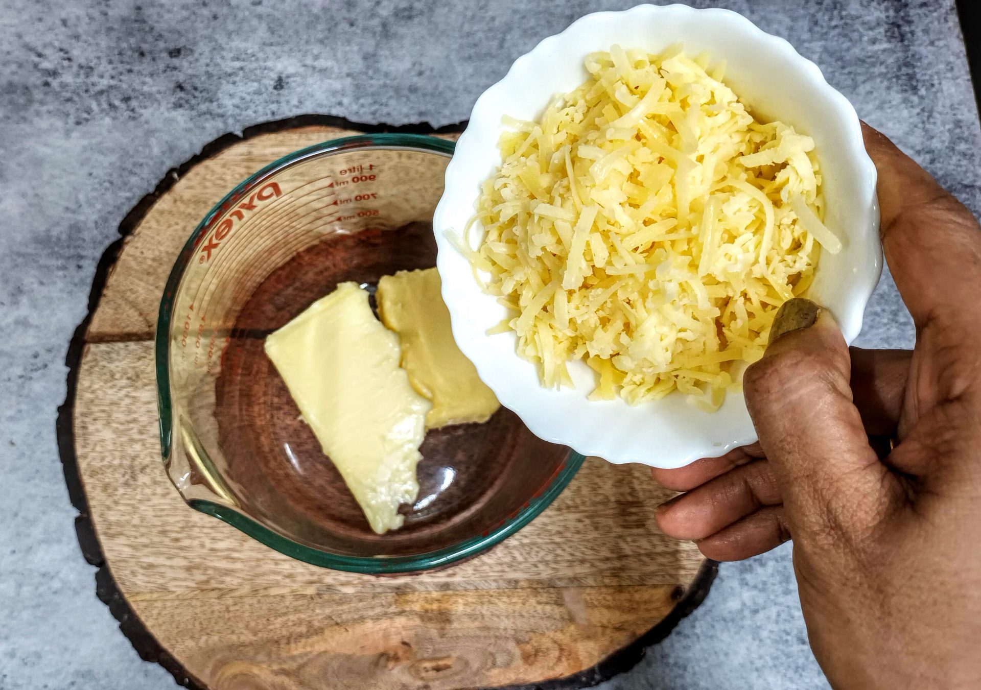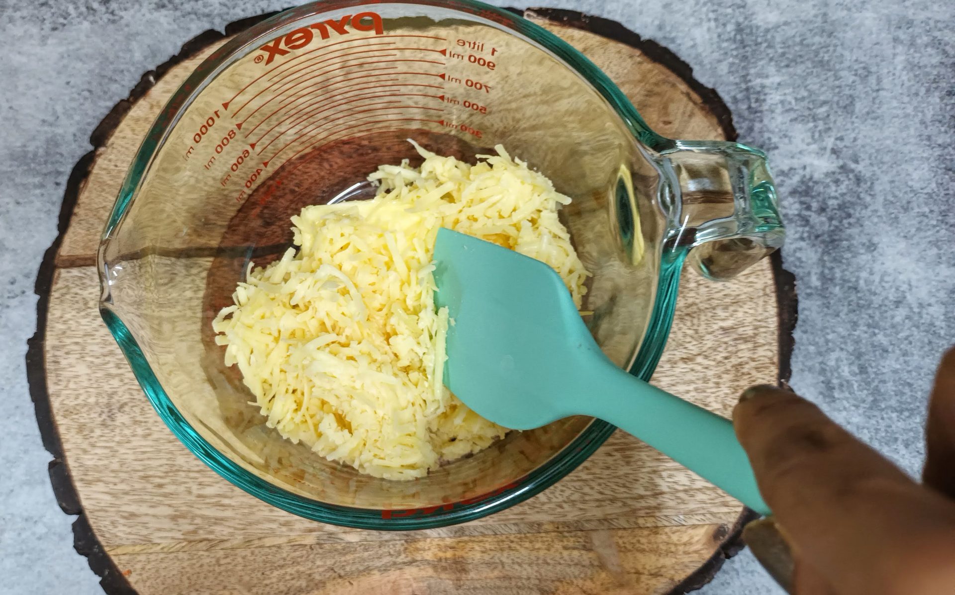 - In a mixing bowl take the butter at room temperature and add the grated Cheddar Cheese to it. Using a spatula cream them until smooth. ( no beater required).