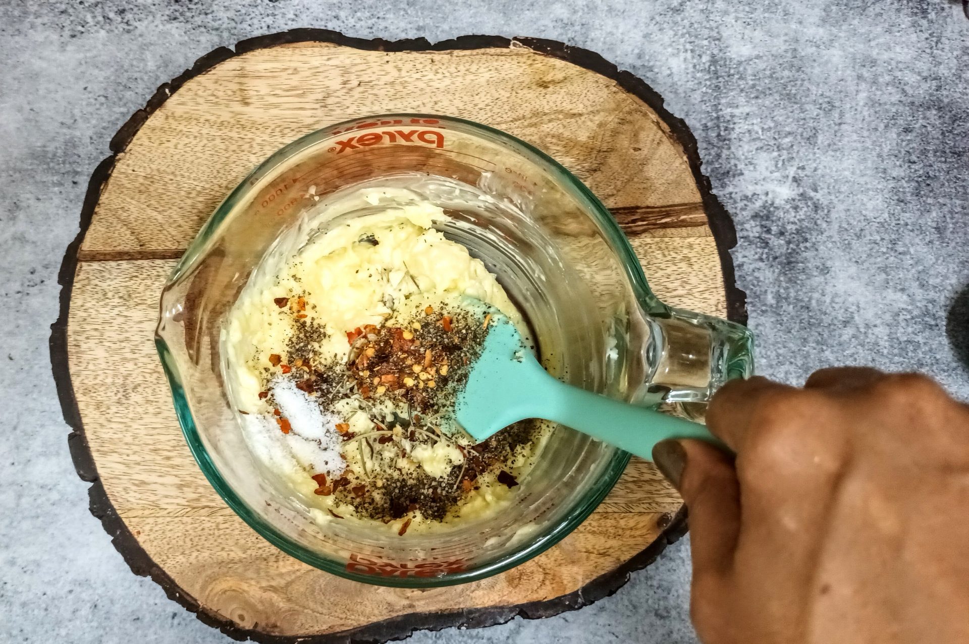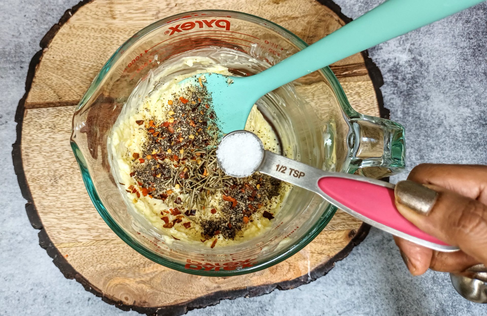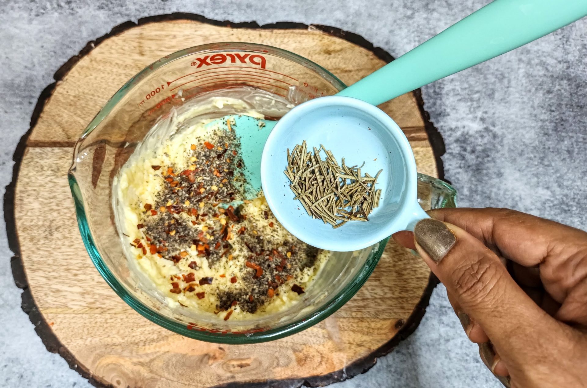- Now add the Chilli flakes, Pepper powder, salt and dried Rosemary and fold well.