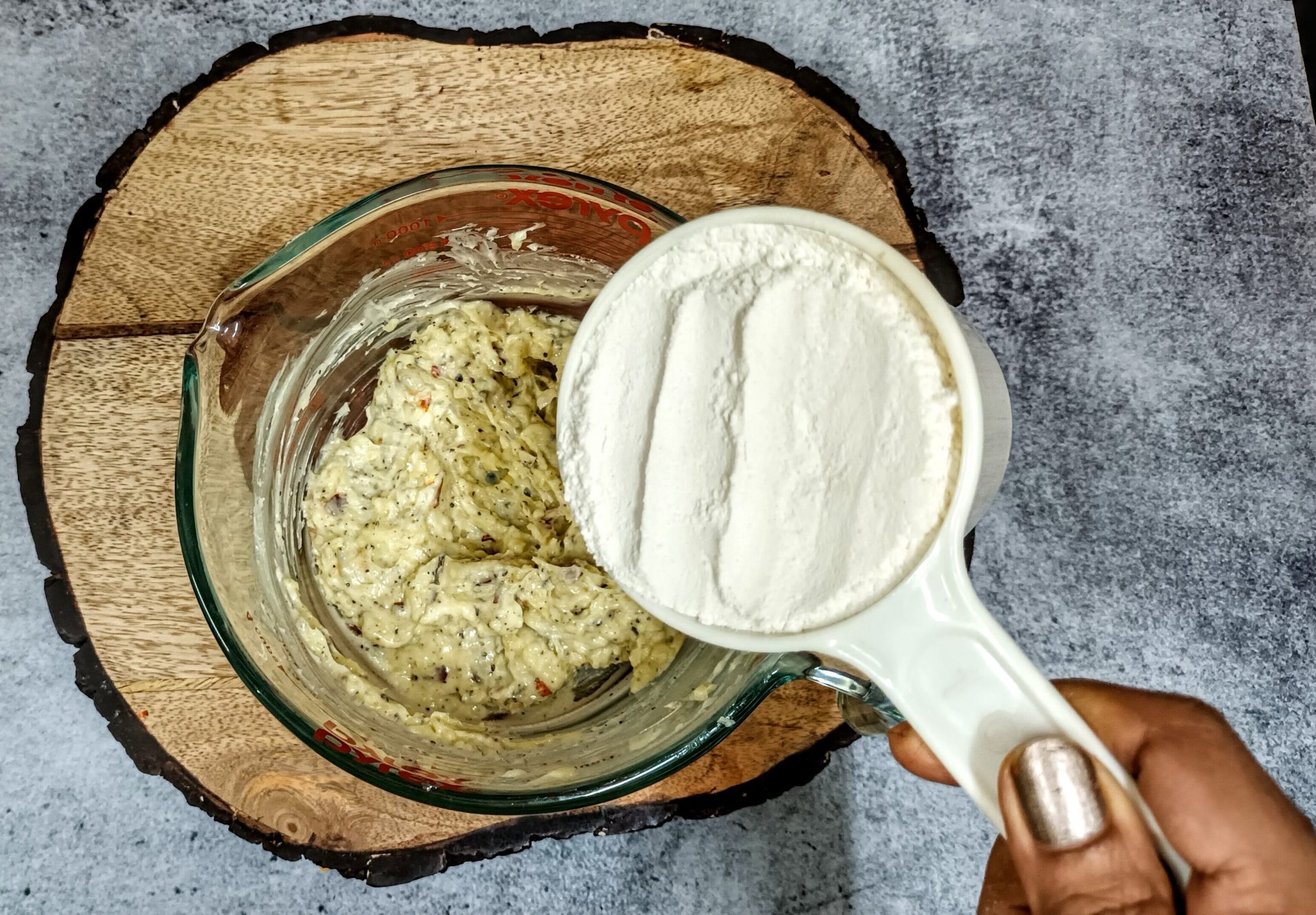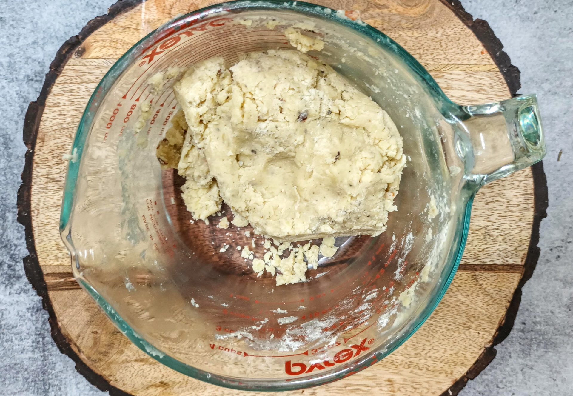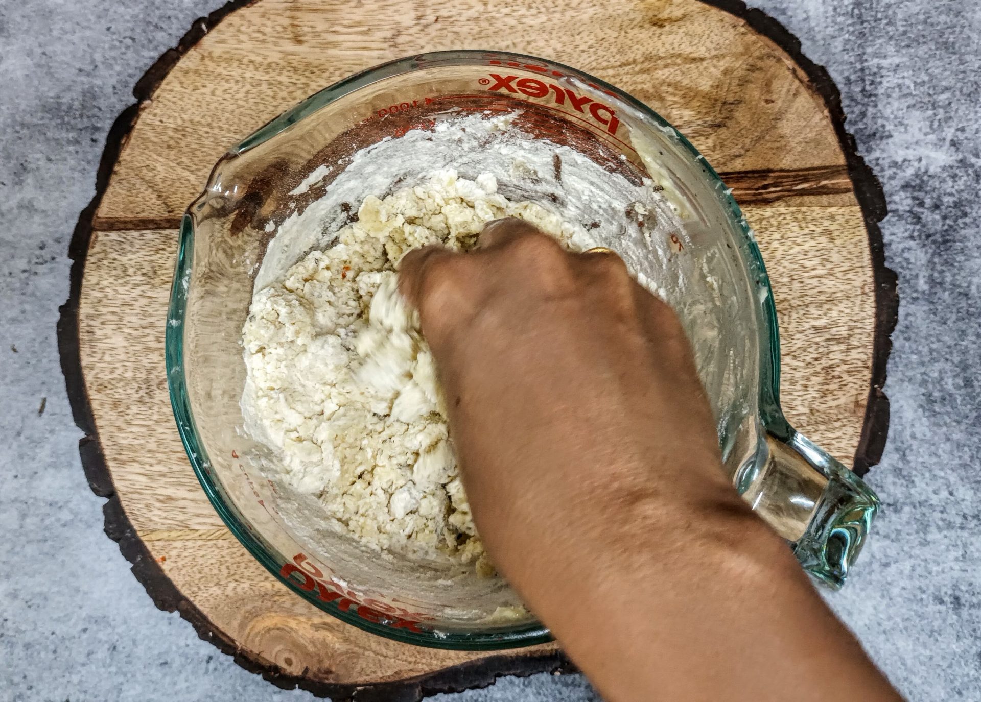 - Then add the flour a little at a time, and keep mixing with a spatula. Once all the flour is added, using your hands, knead lightly and bring the flour together.
