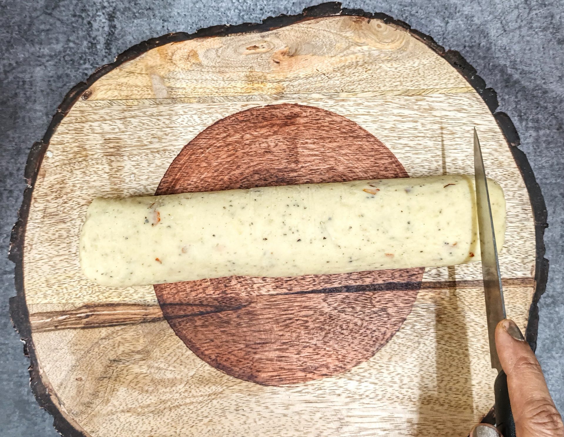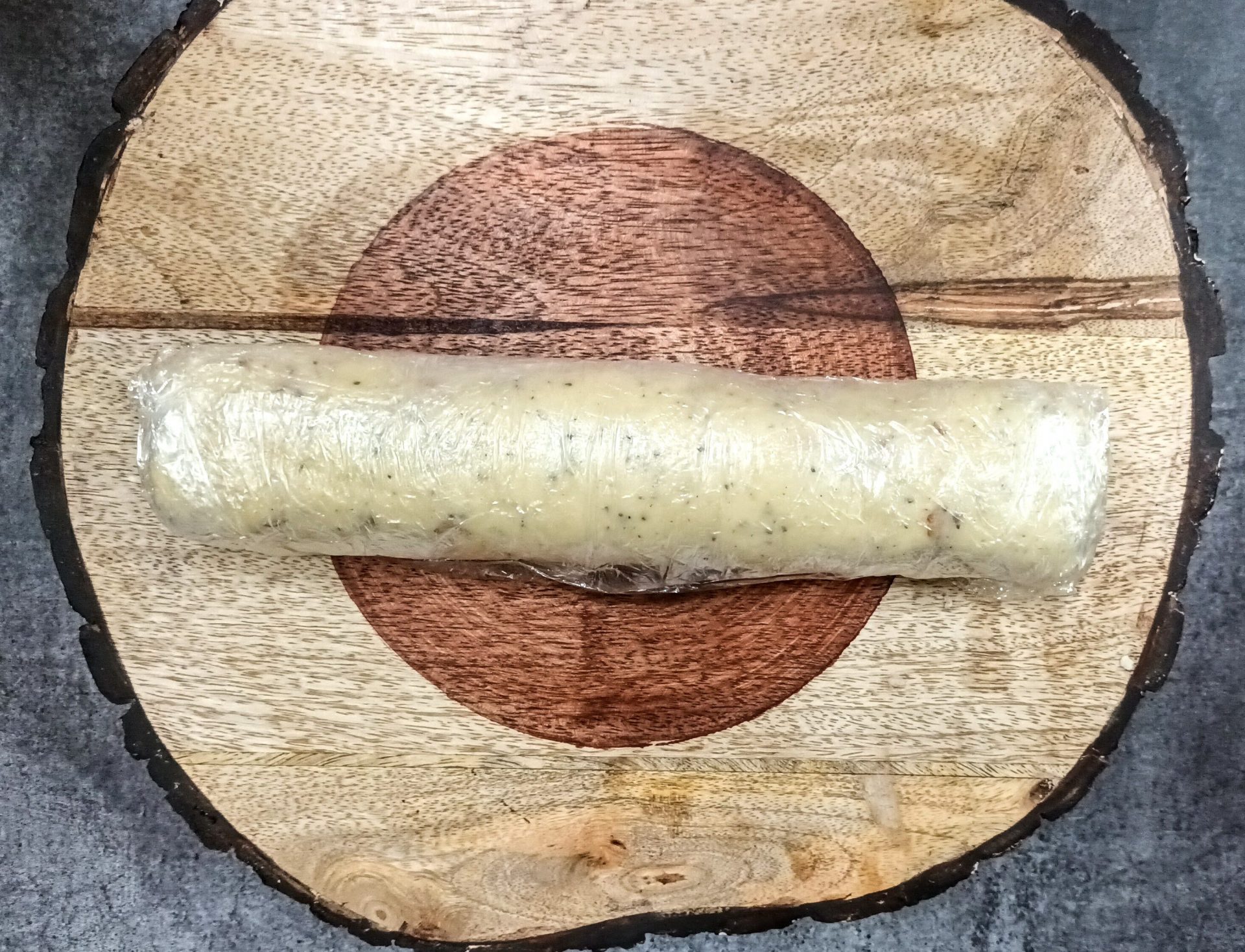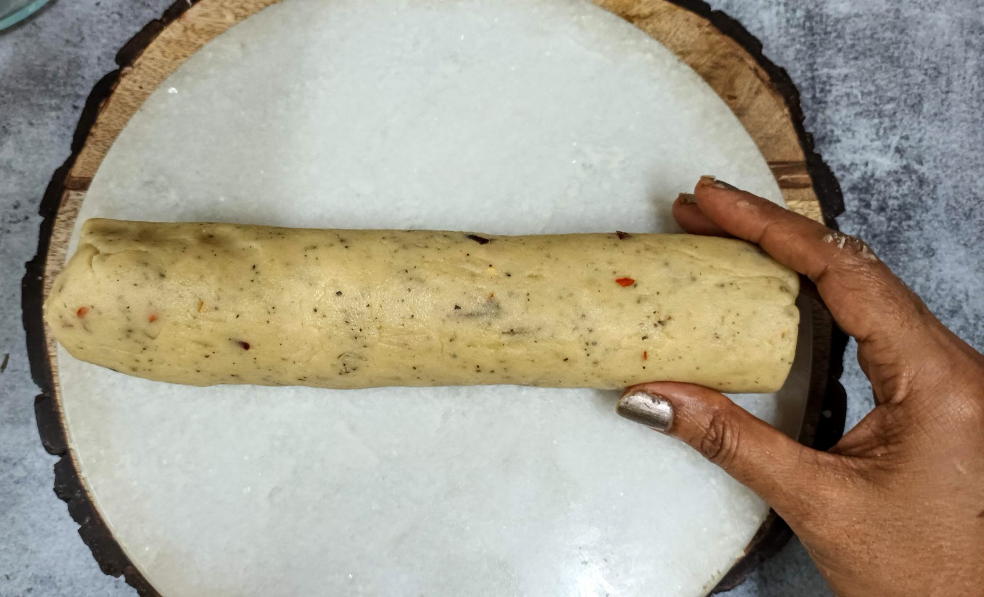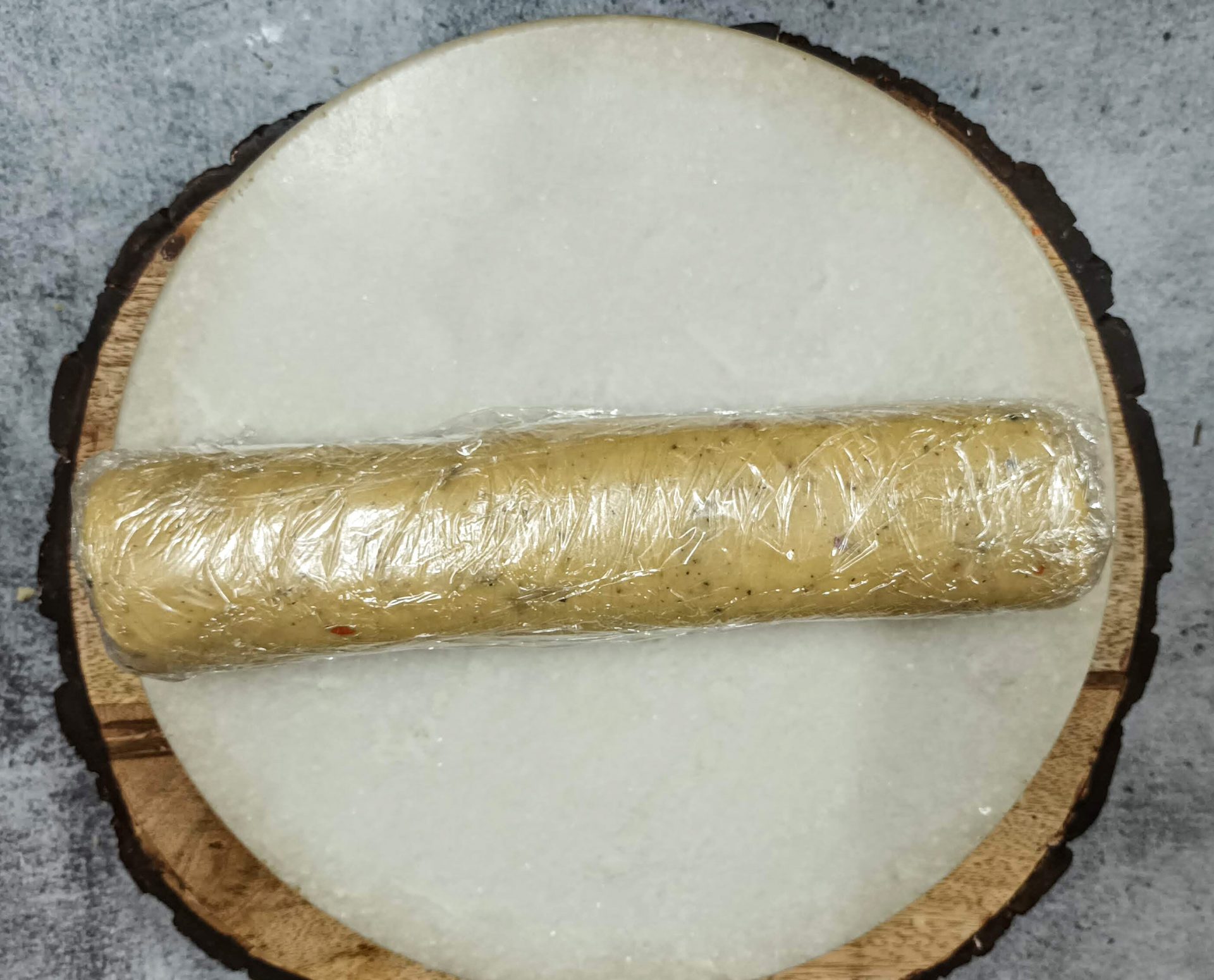 - Now shape the cookie dough into a cylinder, and wrap it well with a cling wrap. Put this into the fridge for chilling, for at least an hour.