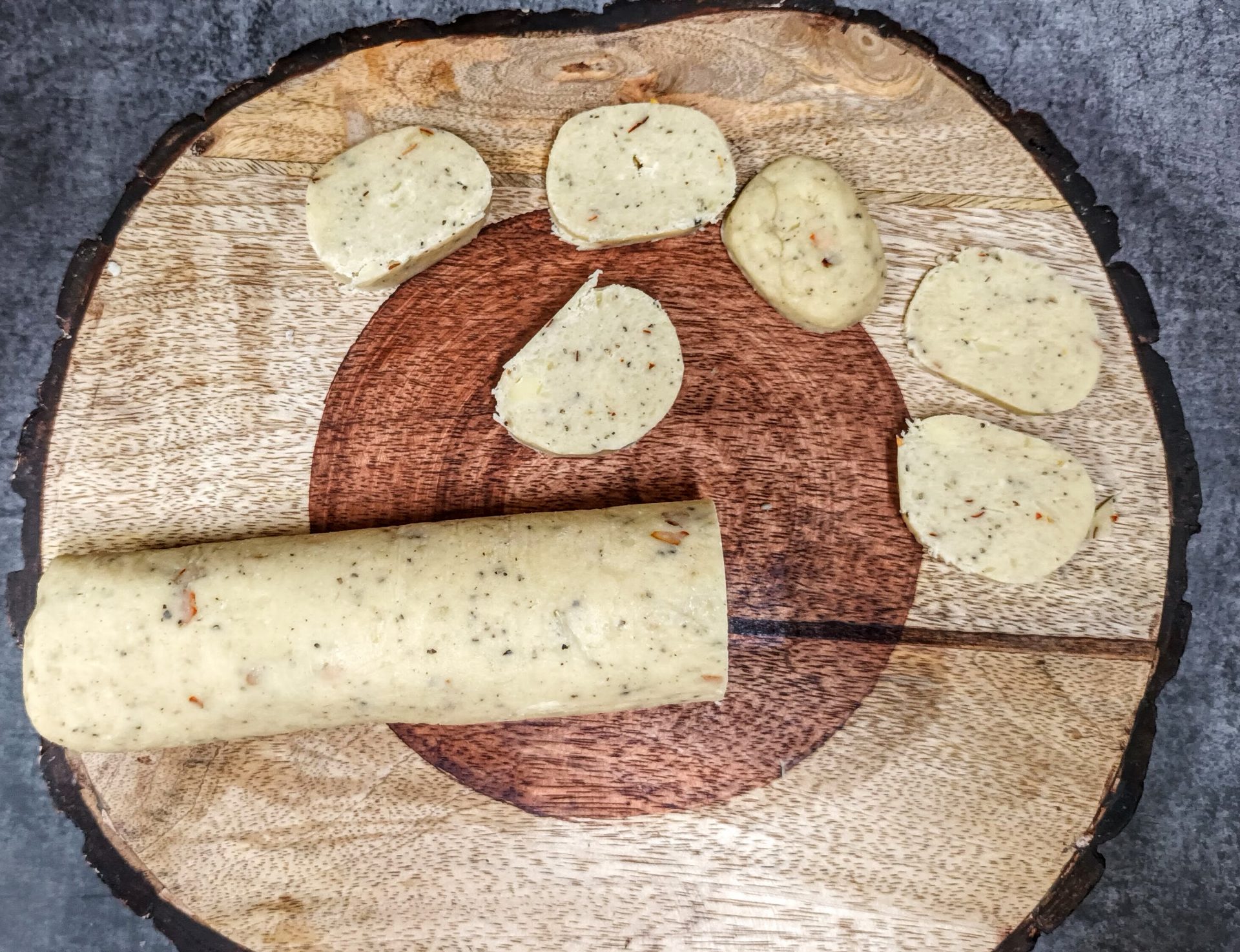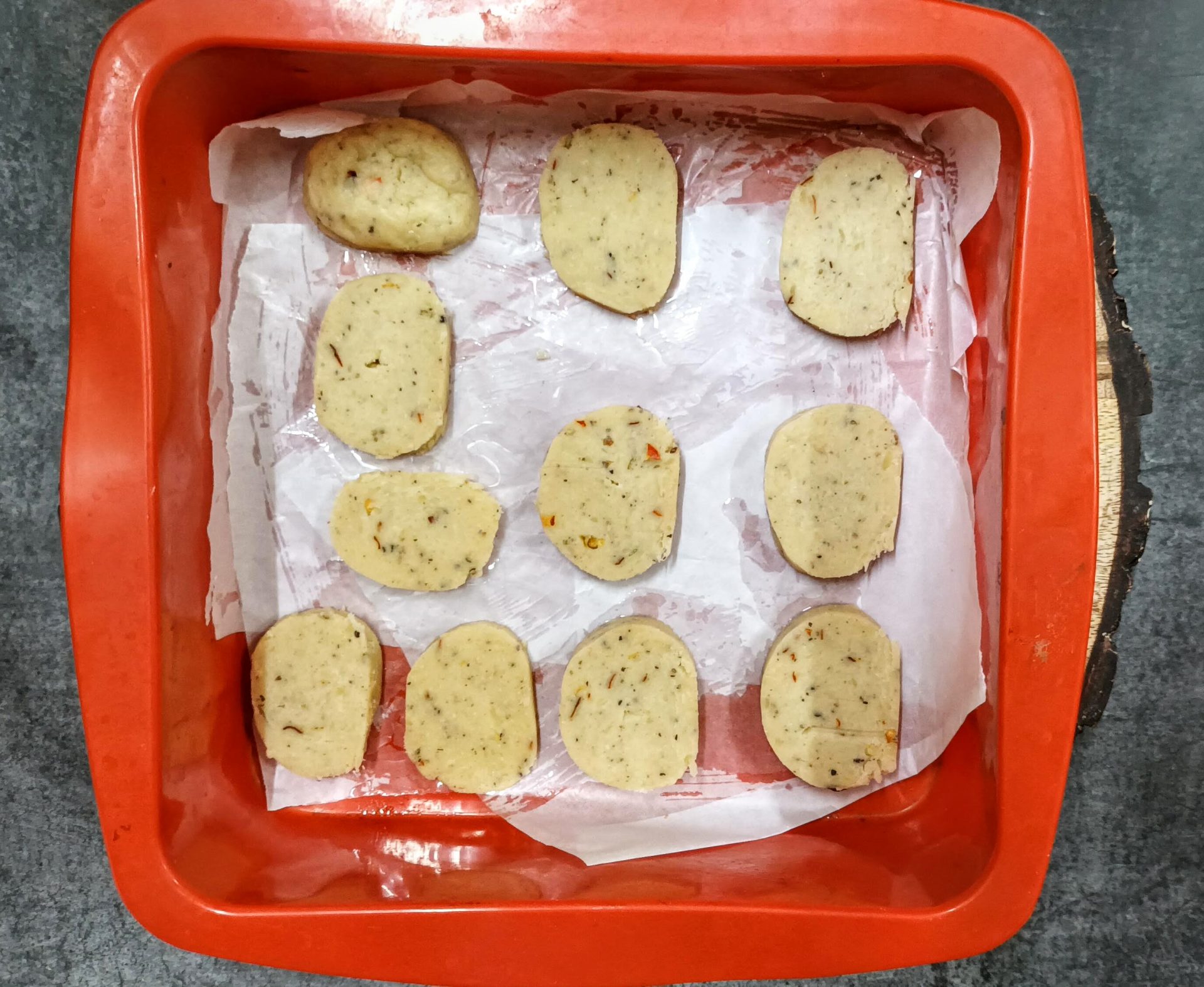 - When you are ready Preheat the oven to 350 ° F / 180 ° C for 10 minutes. In the meantime, line the baking tray with parchment paper, and apply oil/ butter to it. Now remove the Cookie dough from the fridge and unwrap it. With a knife slice it into medium sized roundels. Place them on the baking tray with 1 inch gap in-between.