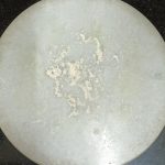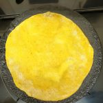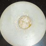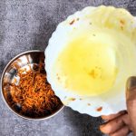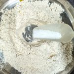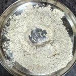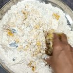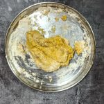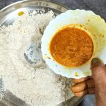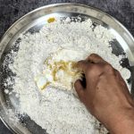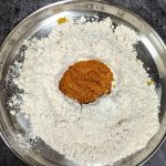 - Now take the flour in a mixing bowl/Paraat. Make a well in the centre, and pour the turmeric paste. Add the fresh cream, and salt and rub this into the flour. (don’t add water at this stage). You will have a dry flour mixture now.