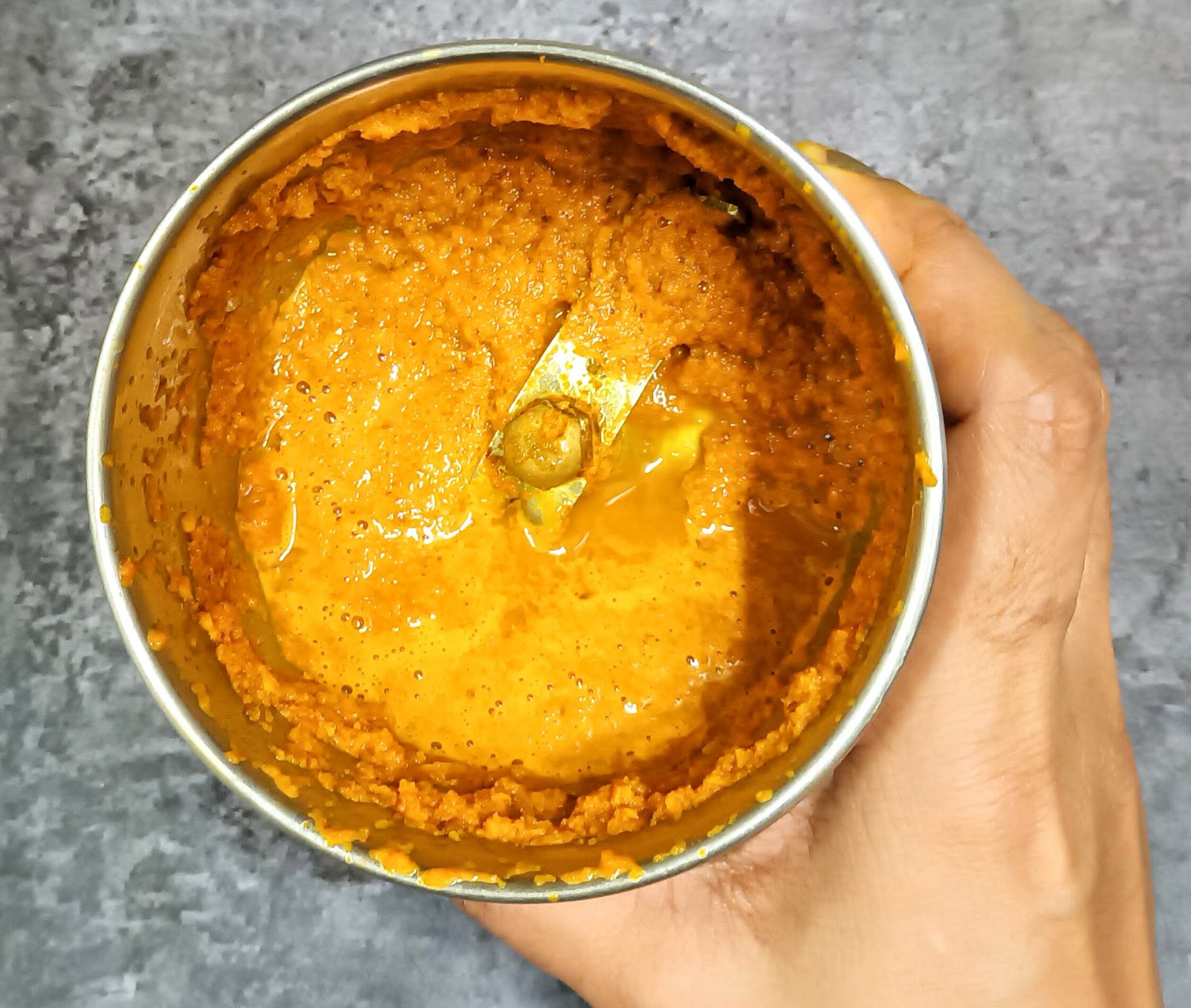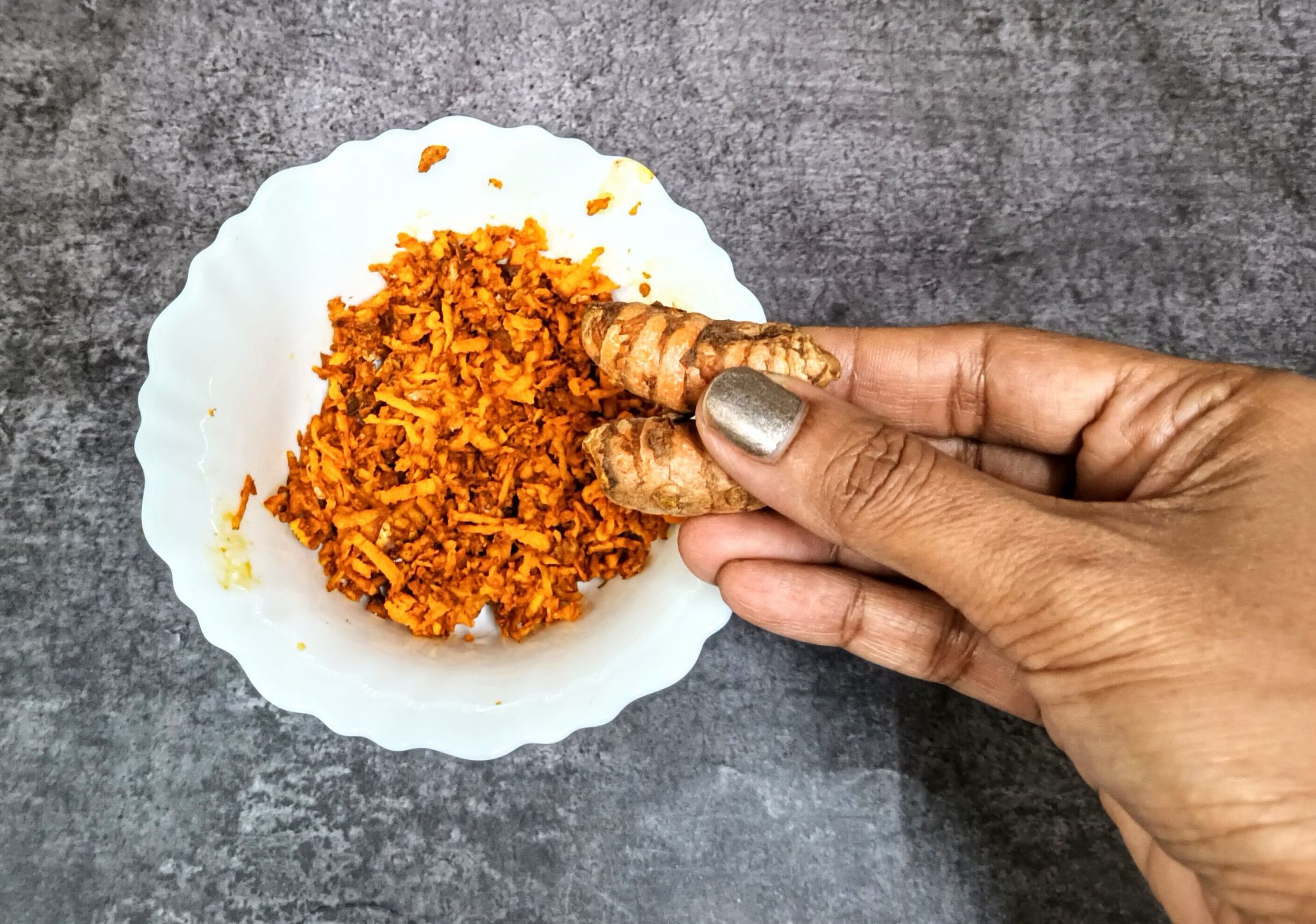- Grate the fresh Turmeric rhizomes and put it in a blender. Add about 2 tbsp water and grind to a smooth paste. Keep this aside.