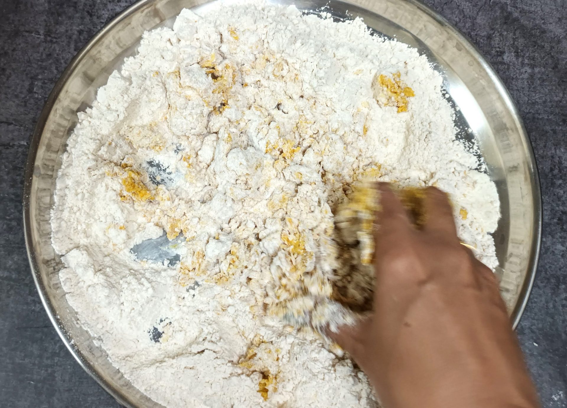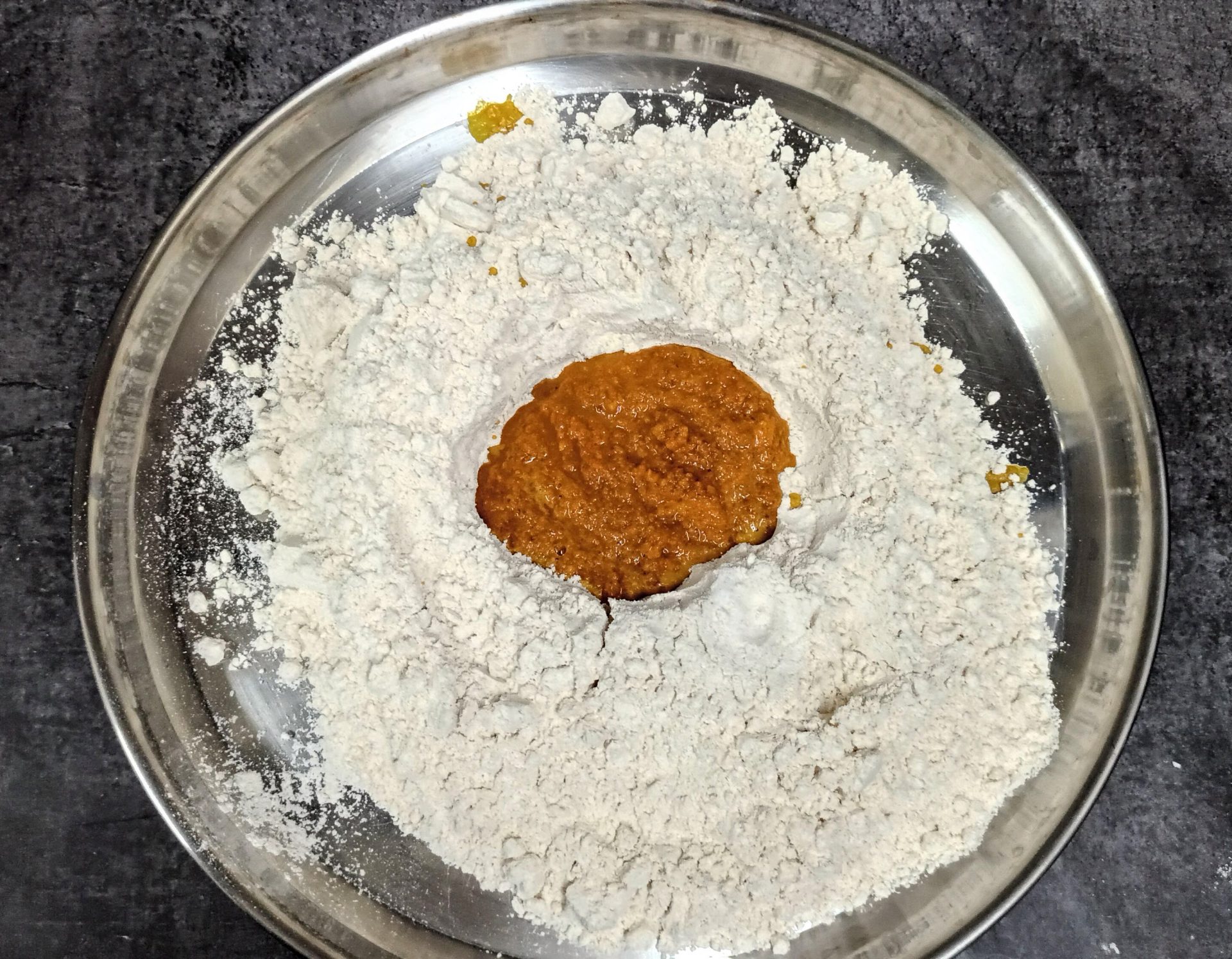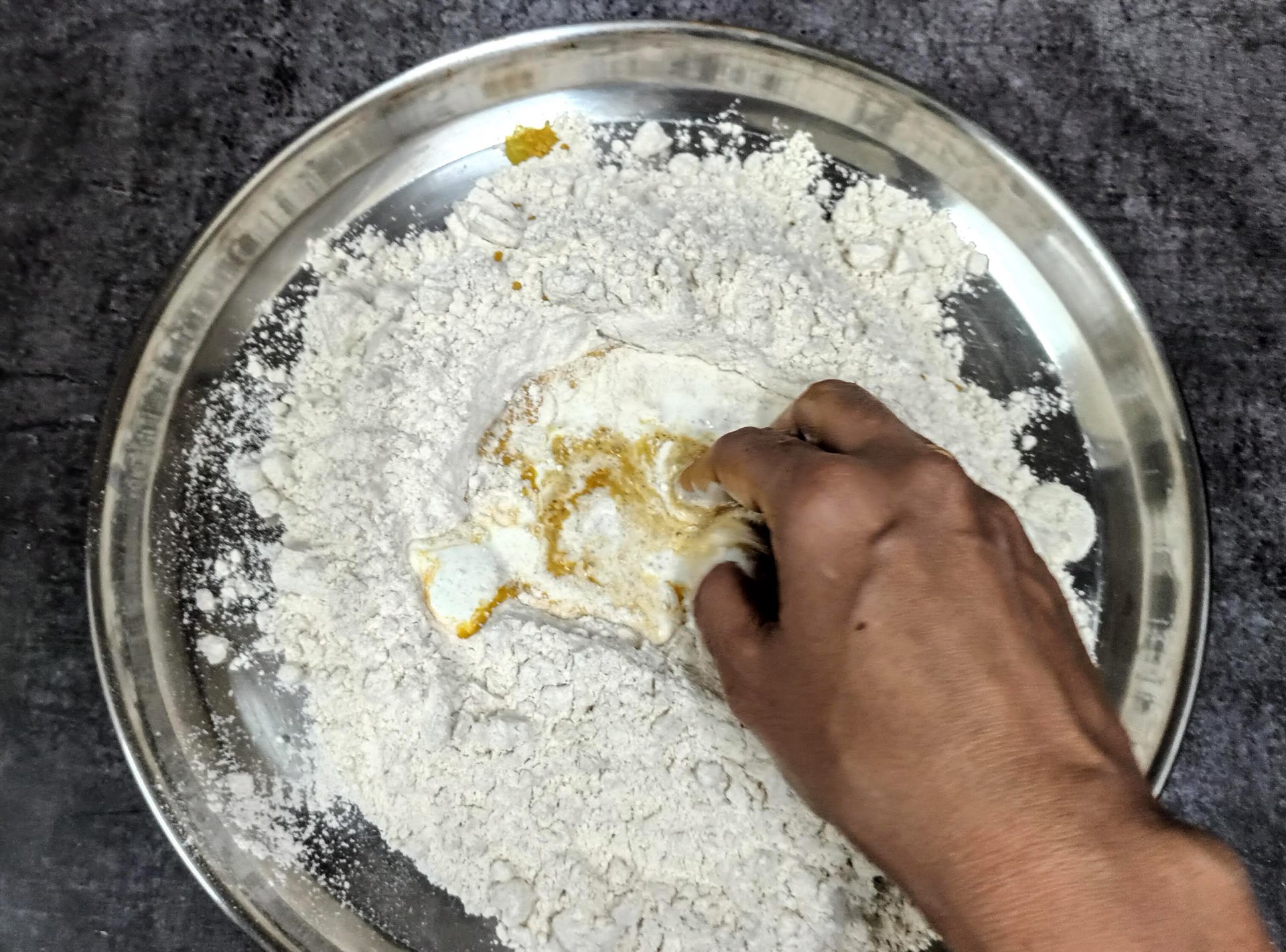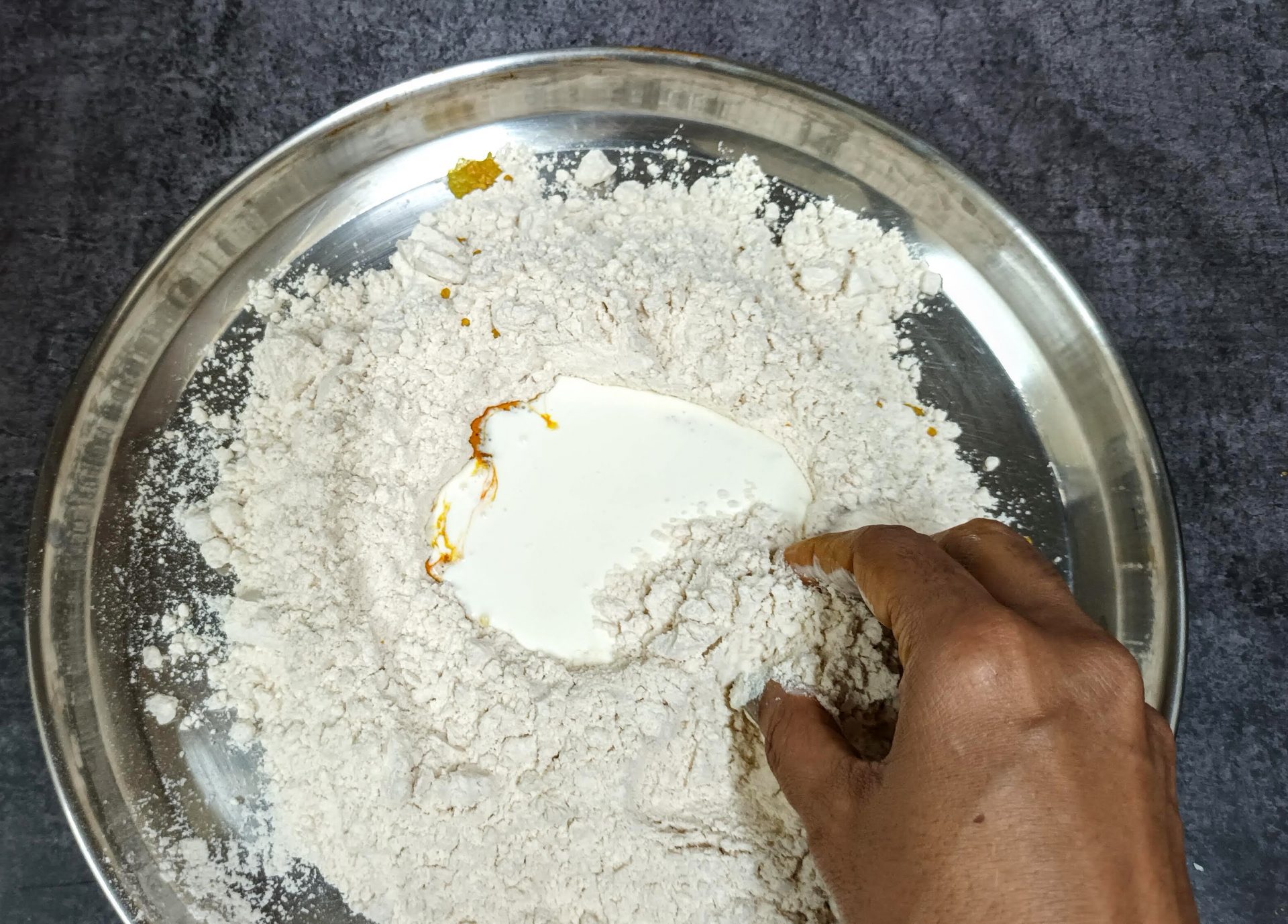 - Now take the flour in a mixing bowl/Paraat. Make a well in the centre, and pour the turmeric paste. Add the fresh cream, and salt and rub this into the flour. (don’t add water at this stage). You will have a dry flour mixture now.