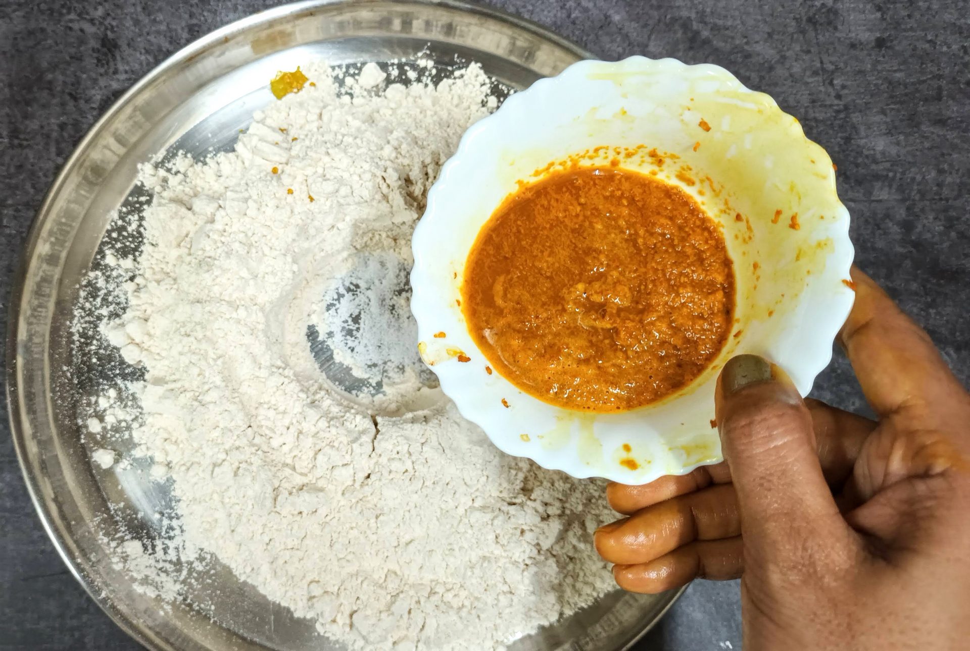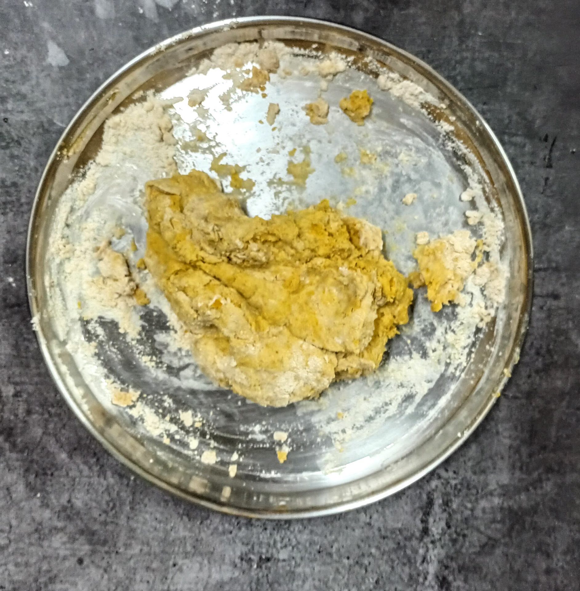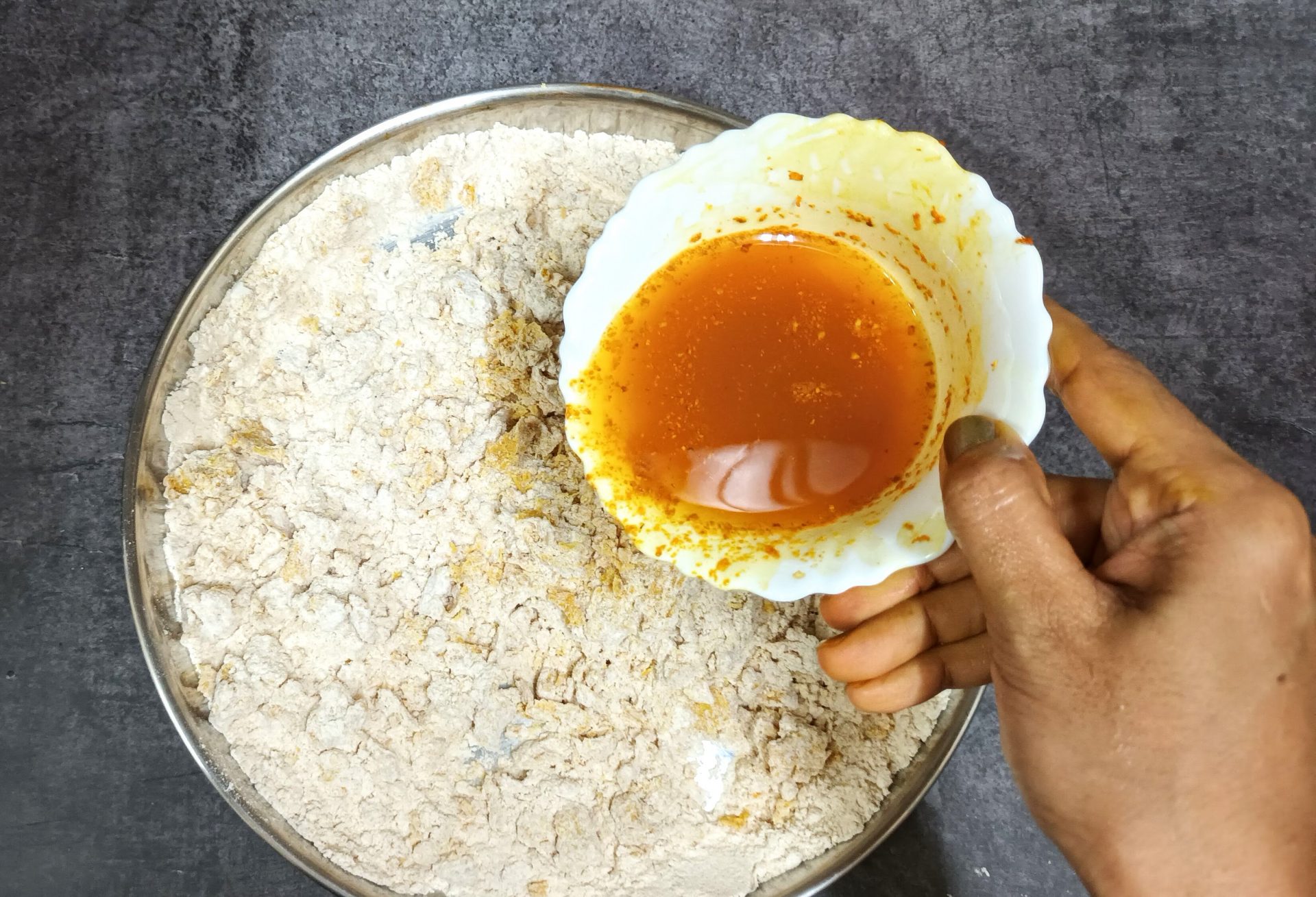 - Now take the flour in a mixing bowl/Paraat. Make a well in the centre, and pour the turmeric paste. Add the fresh cream, and salt and rub this into the flour. (don’t add water at this stage). You will have a dry flour mixture now.