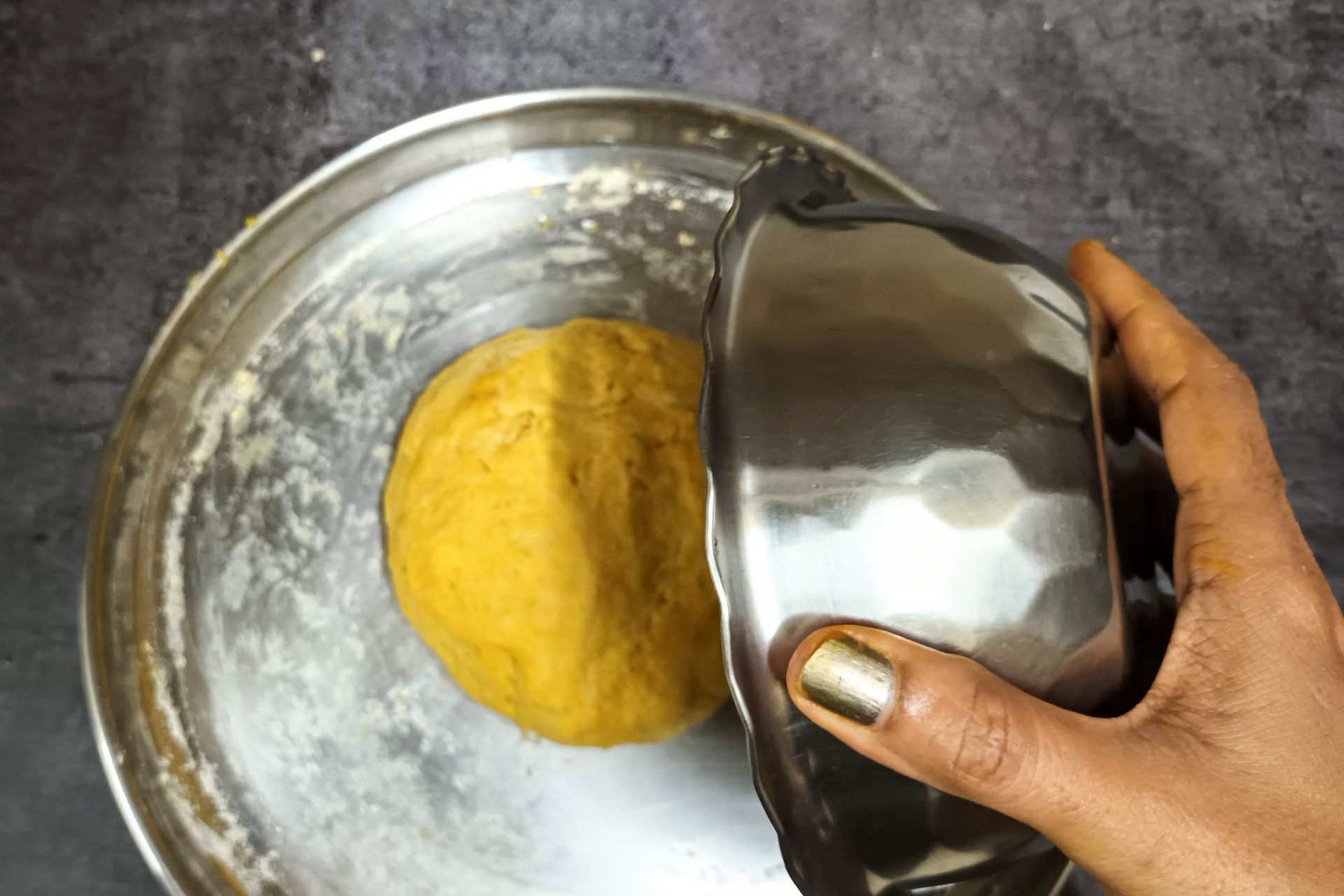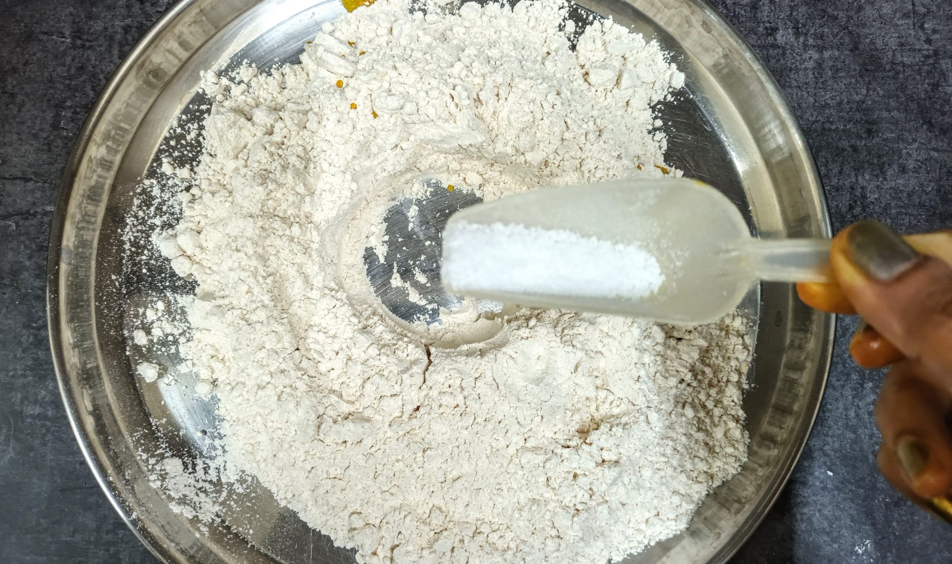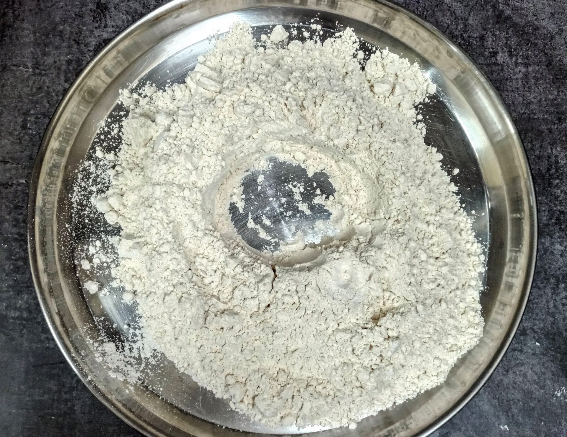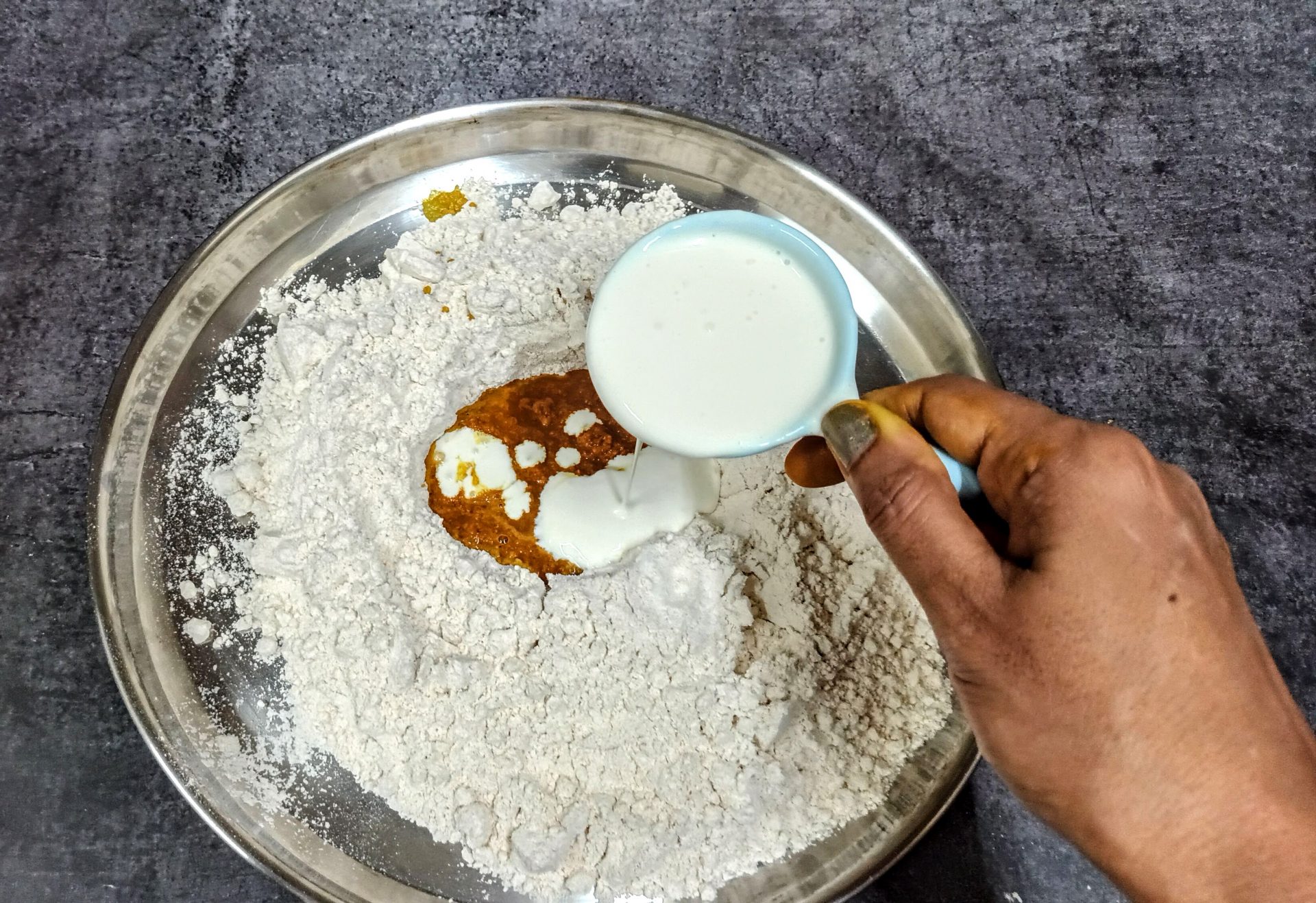 - Now take the flour in a mixing bowl/Paraat. Make a well in the centre, and pour the turmeric paste. Add the fresh cream, and salt and rub this into the flour. (don’t add water at this stage). You will have a dry flour mixture now.