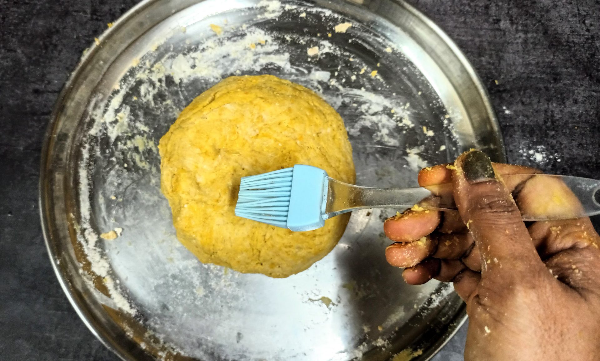 - Now adding water a little at a time, Knead to form a soft pliable dough. Apply oil to the dough, cover and keep aside. Rest it for 20 minutes.