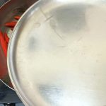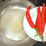 - To a pan add 1/4 th cup Sesame oil and heat. Now add the chillies/red peppers a few at a time and fry them until blisters appear on them. While frying the oil splutters a lot. To avoid this you can cover the pan partially with a plate. Once fried, remove the chillies onto a plate and cool them.