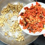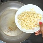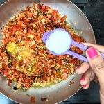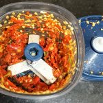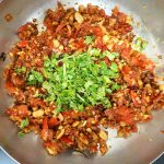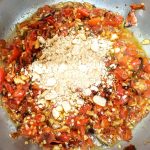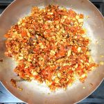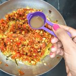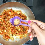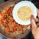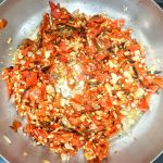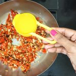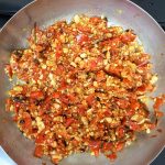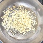- Now add another 1/4 cup oil to the same pan and heat. Now add the minced garlic and fry it well in oil. Do this over a low flame. When the garlic turns light brown, turn off the flame. Now add the fried chillies to a mincer and mince to a grainy/coarse paste. If you don’t have a mincer, this can be done in your blender jar, using the pulse mode. Now add this coarse Red chilli paste to the garlic, and turn on the flame again. Add another 1/4 cup oil, and continue to fry for 2 minutes, over a low flame.
