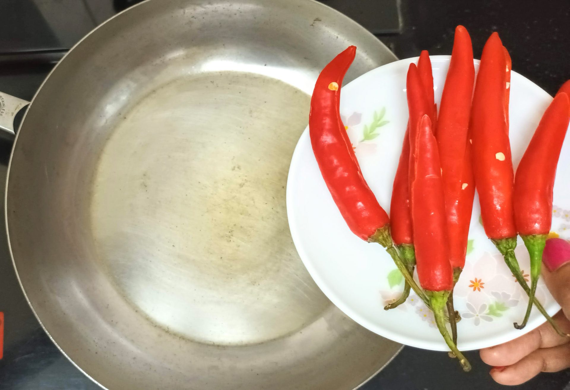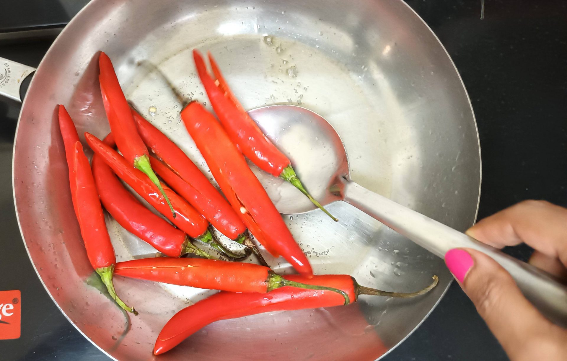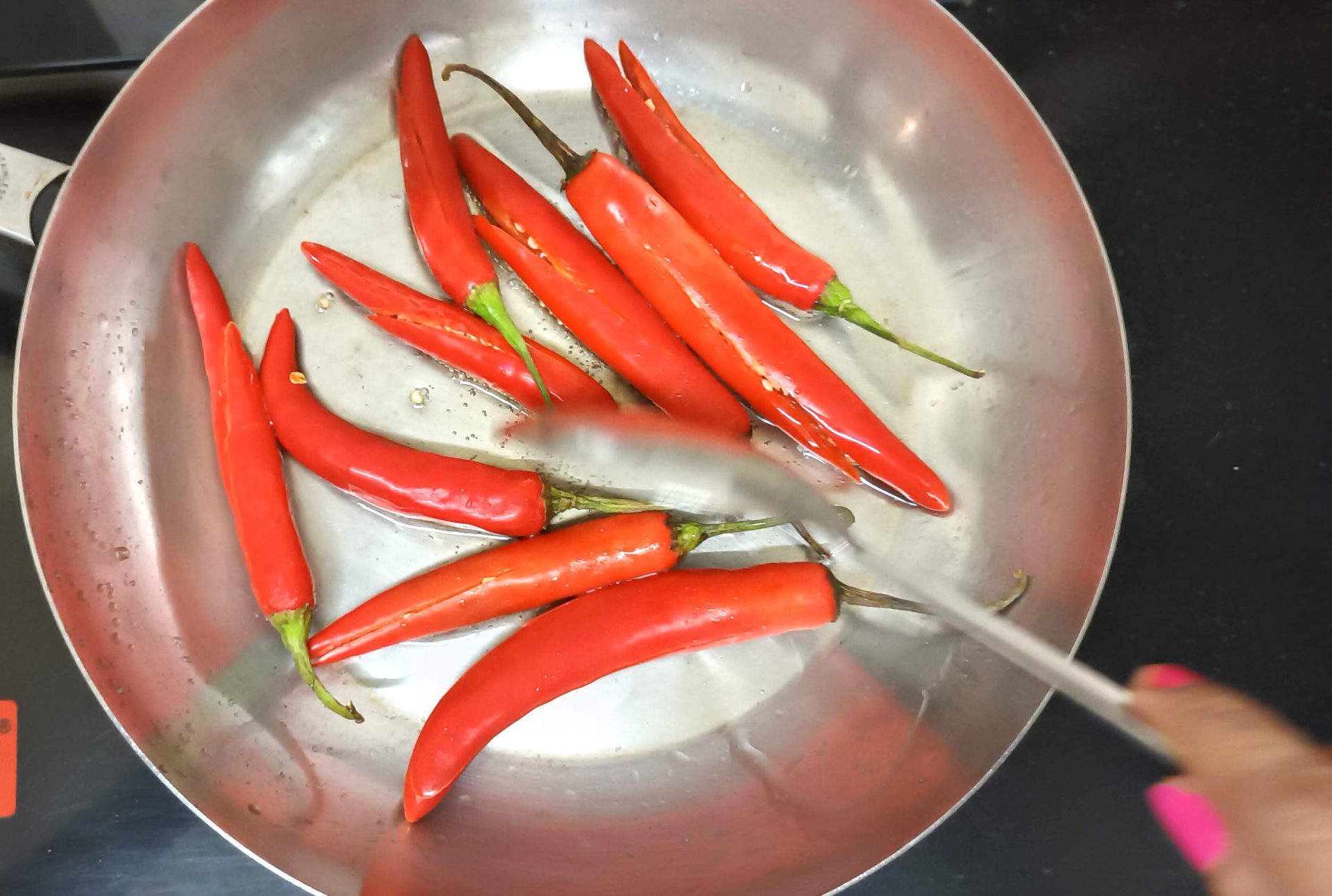 - While I have used Thai red chillies here, any mild red chilli peppers can be used. This recipe can also be followed with green chillies.