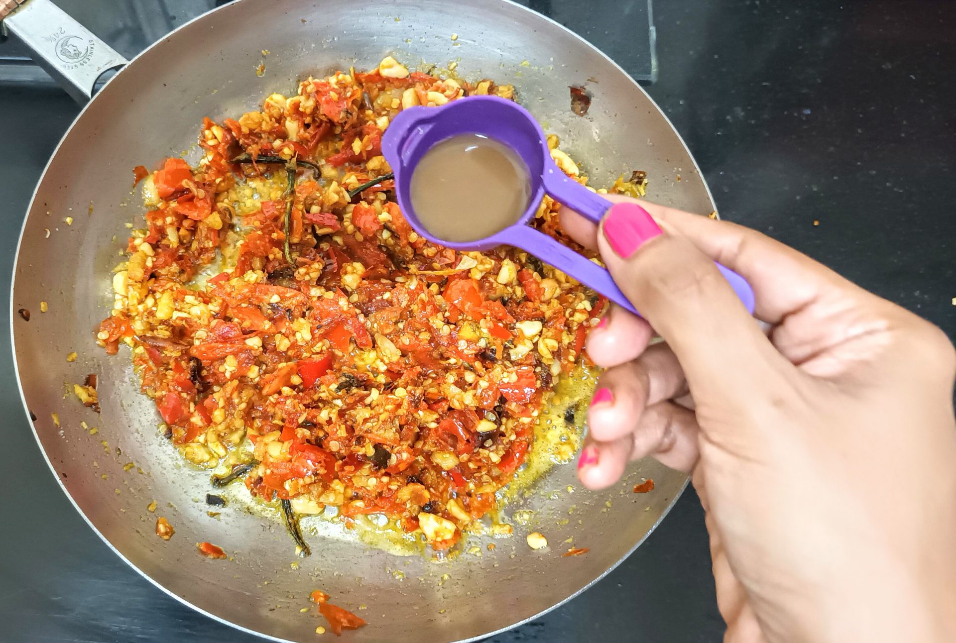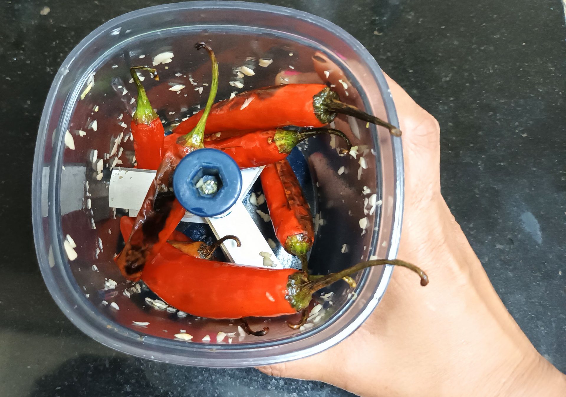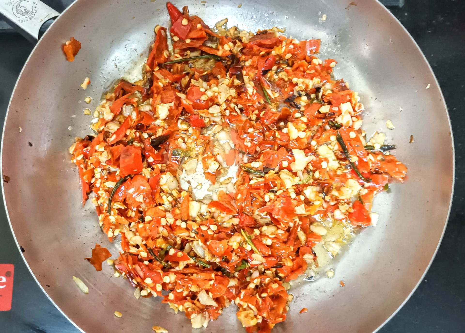 - Now add another 1/4 cup oil to the same pan and heat. Now add the minced garlic and fry it well in oil. Do this over a low flame. When the garlic turns light brown, turn off the flame. Now add the fried chillies to a mincer and mince to a grainy/coarse paste. If you don’t have a mincer, this can be done in your blender jar, using the pulse mode. Now add this coarse Red chilli paste to the garlic, and turn on the flame again. Add another 1/4 cup oil, and continue to fry for 2 minutes, over a low flame.