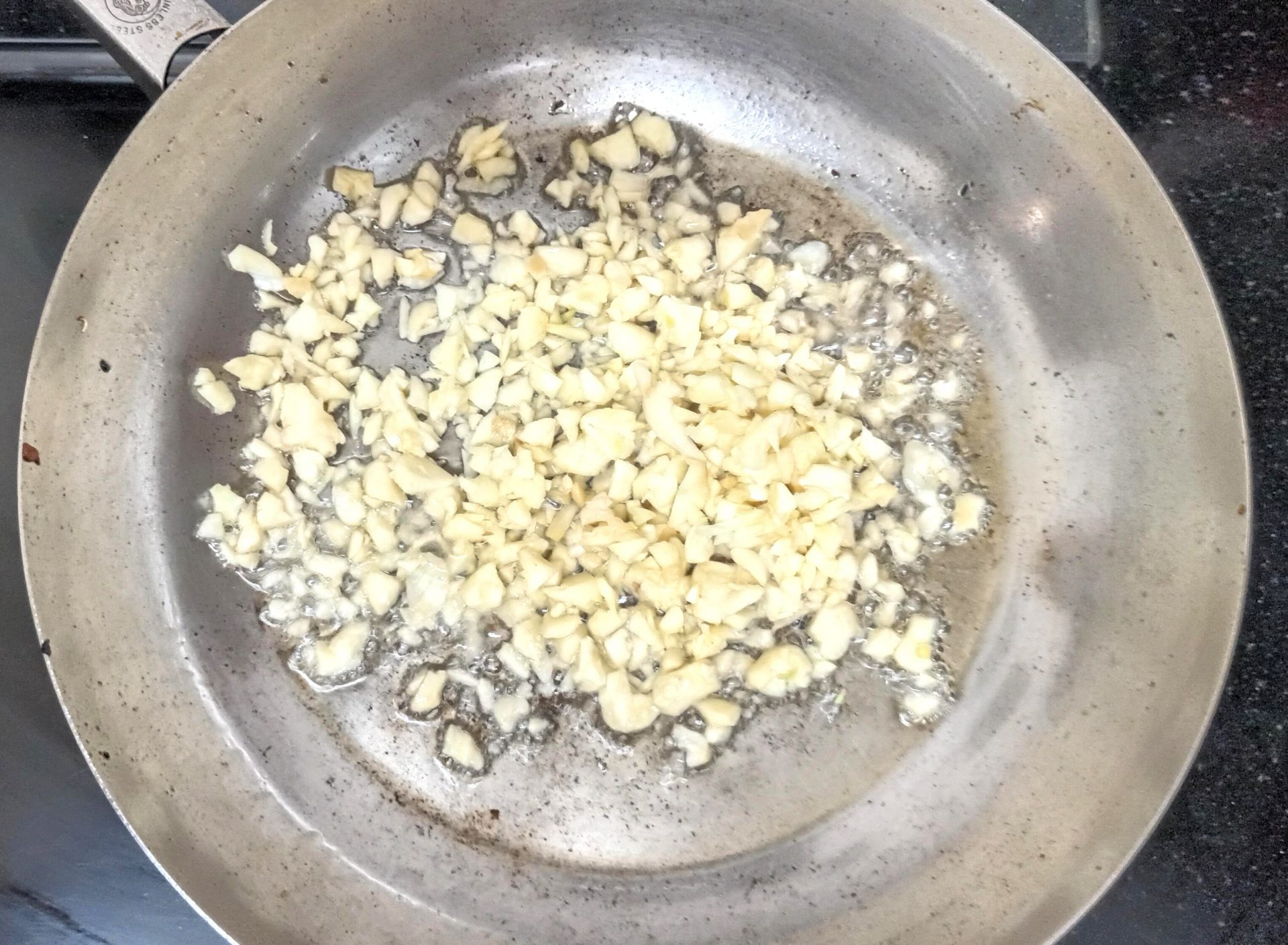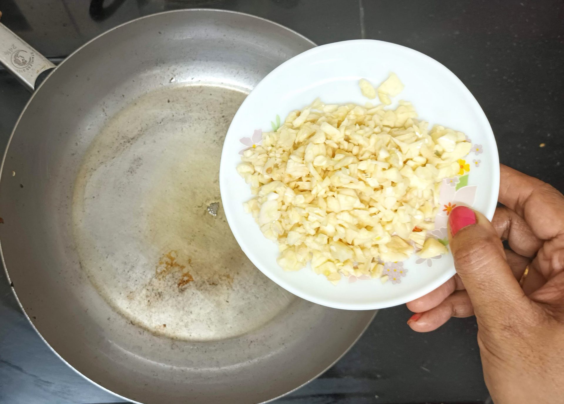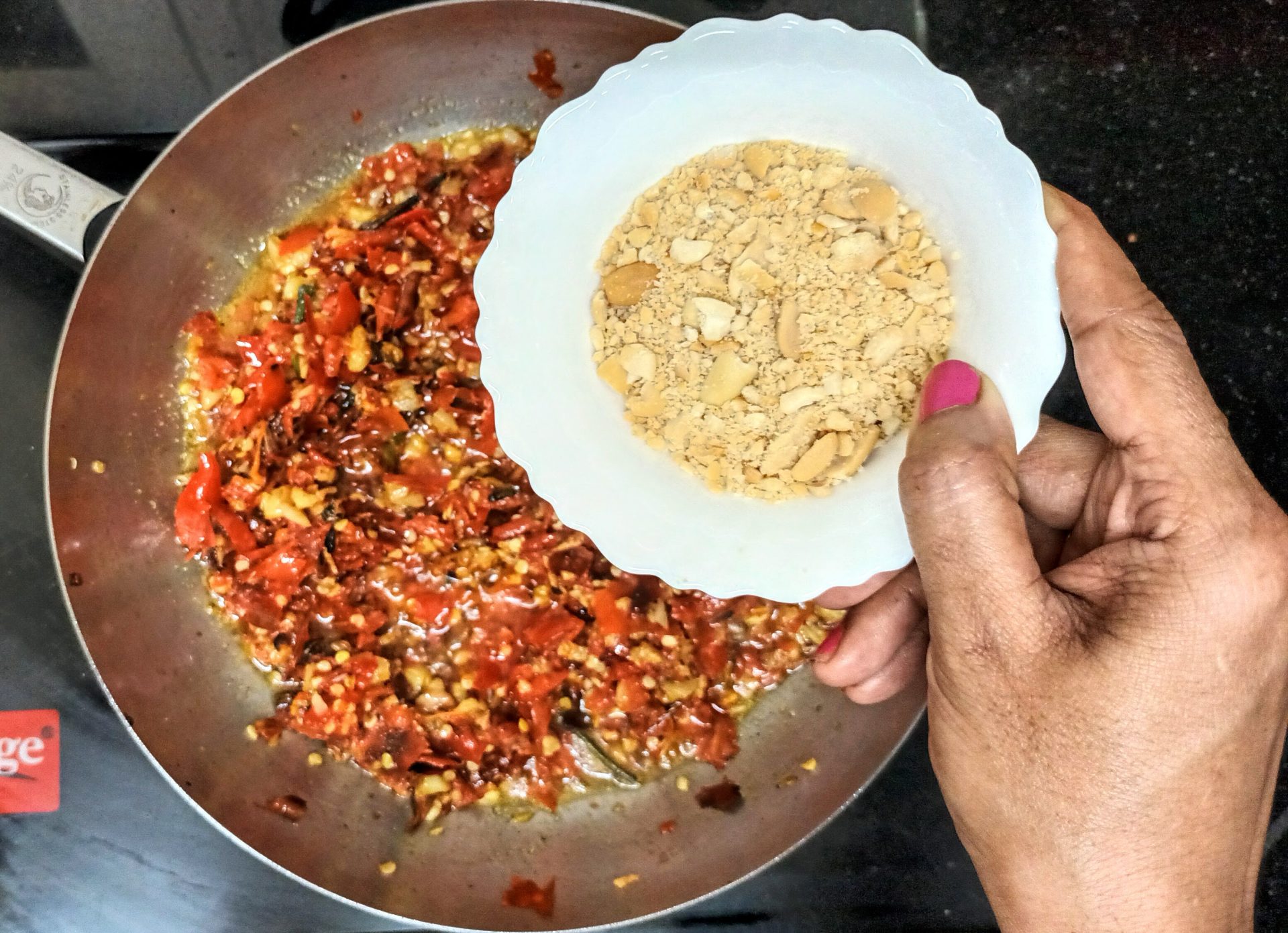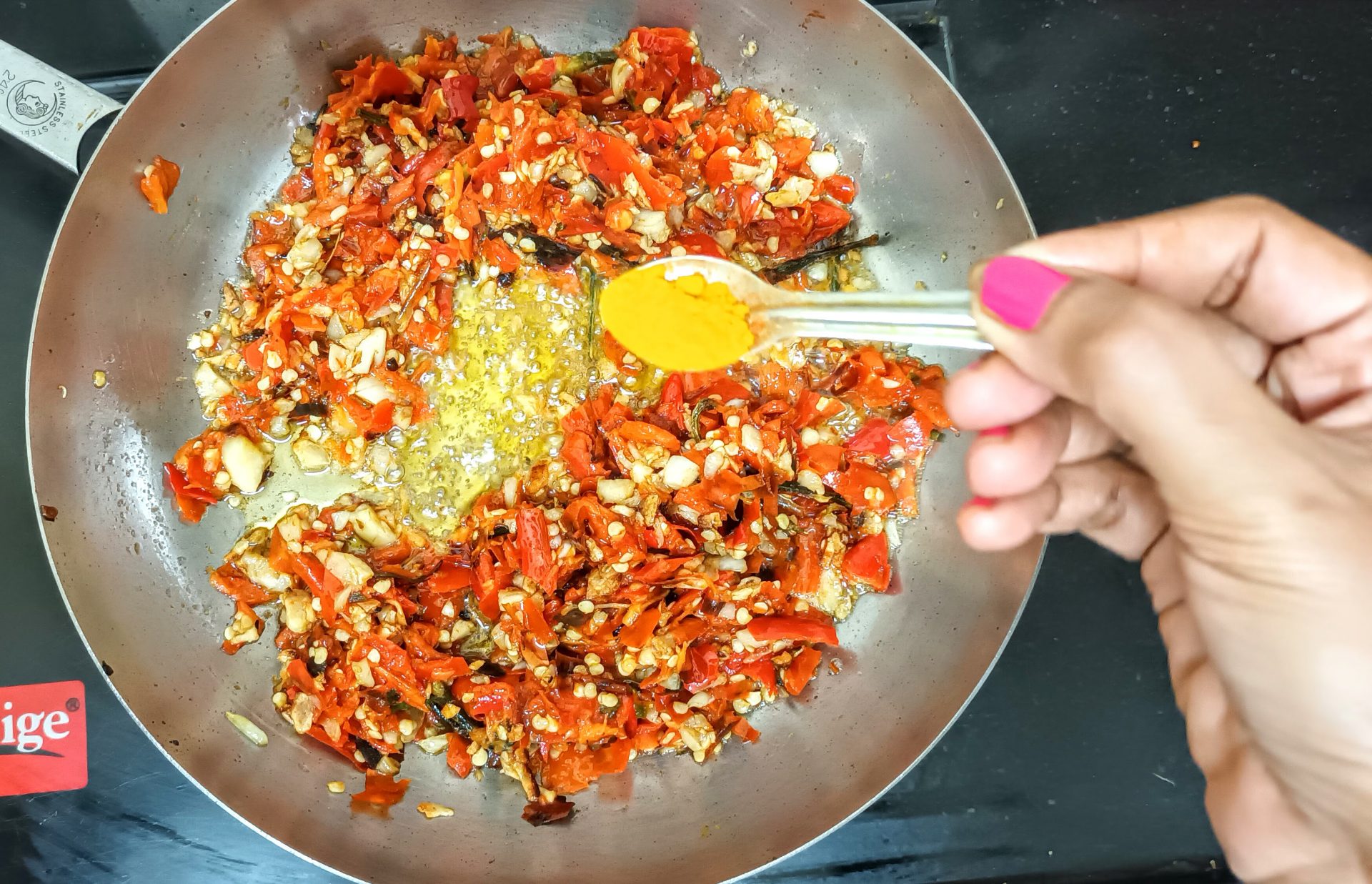 - Now add another 1/4 cup oil to the same pan and heat. Now add the minced garlic and fry it well in oil. Do this over a low flame. When the garlic turns light brown, turn off the flame. Now add the fried chillies to a mincer and mince to a grainy/coarse paste. If you don’t have a mincer, this can be done in your blender jar, using the pulse mode. Now add this coarse Red chilli paste to the garlic, and turn on the flame again. Add another 1/4 cup oil, and continue to fry for 2 minutes, over a low flame.