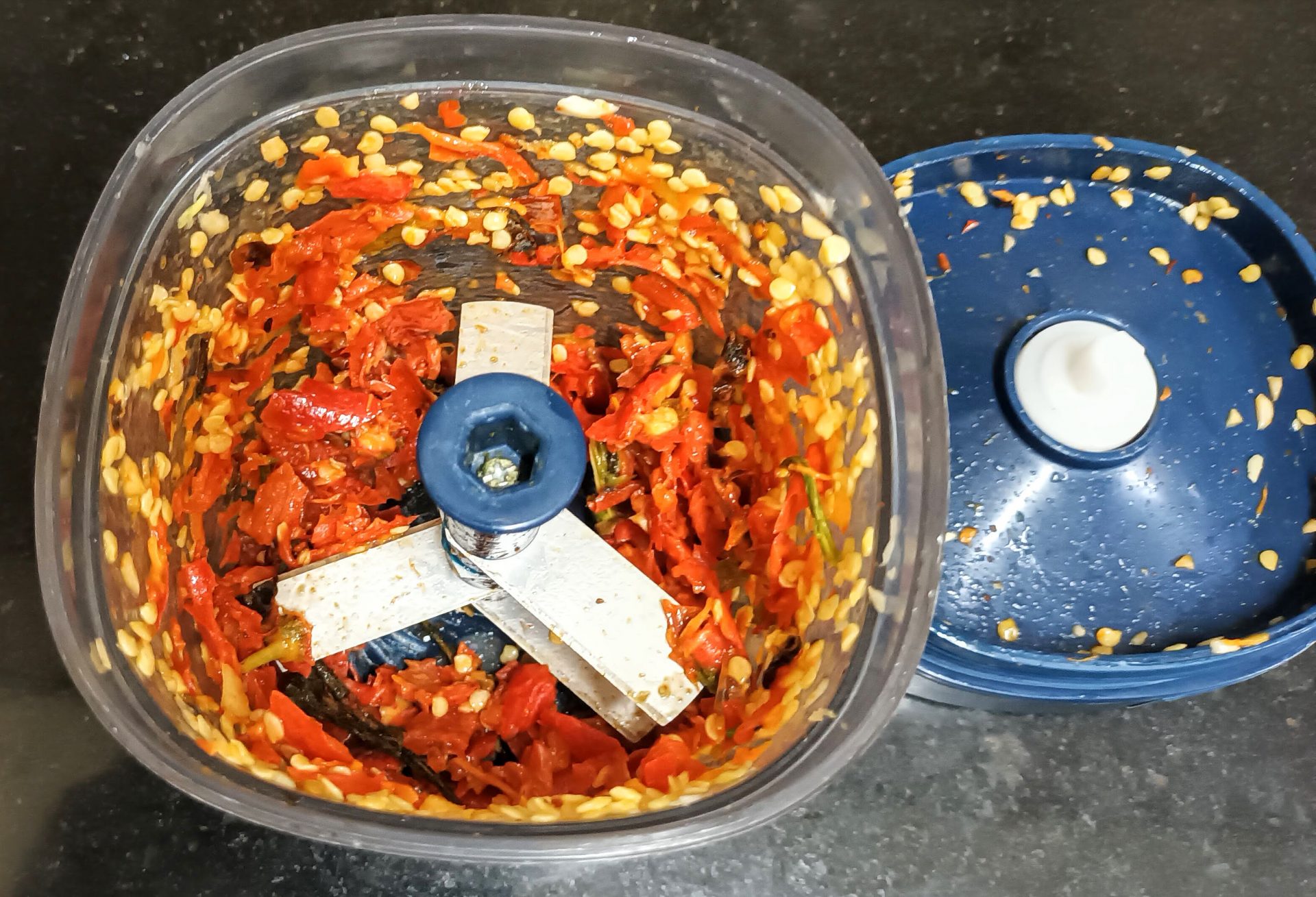 - Though I have kept the texture grainy, one can also blend the chillies to a smooth paste.